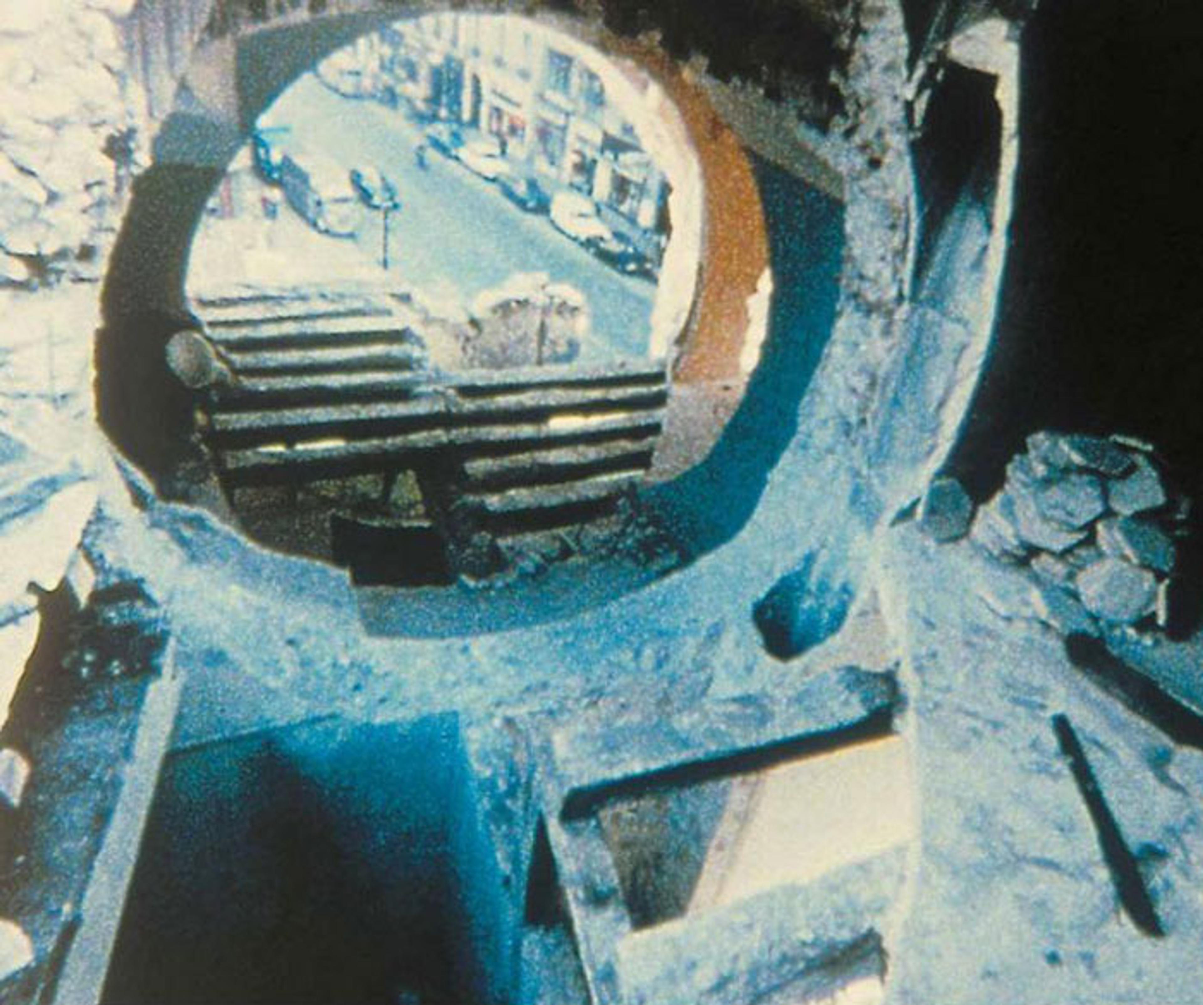 In a famous act of “anarchitecture,” Gordon Matta-Clark carved a cone-shaped opening in two abandoned 17th century buildings in Paris’s Les Halles district. Produced in the context of the 1975 Paris Biennale, Conical Intersect responds to the construction of the Centre Pompidou and its impact on the historical neighborhood. The video presents documentation of the project, originally filmed by Matta-Clark and Bruno Dewitt with 16mm cameras.