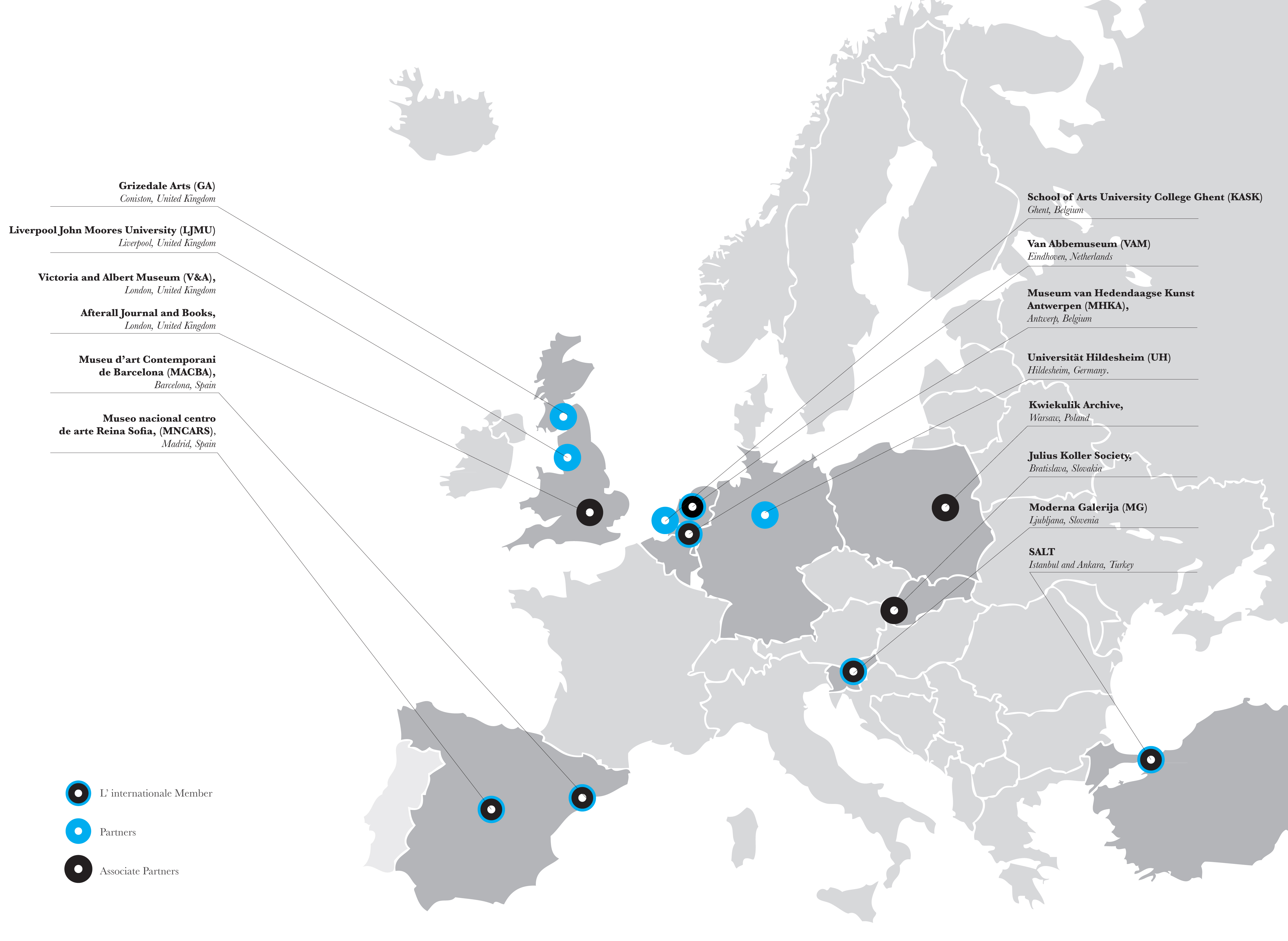 Grizedale Arts (Cumbria, Birleşik Krallık); Liverpool John Moores University (Liverpool, Birleşik Krallık); University College Ghent [Güzel Sanatlar Okulu (KASK) ve Kraliyet Konservatuvarı] (Gent, Belçika) ve Universität Hildesheim (Hildesheim, Almanya).