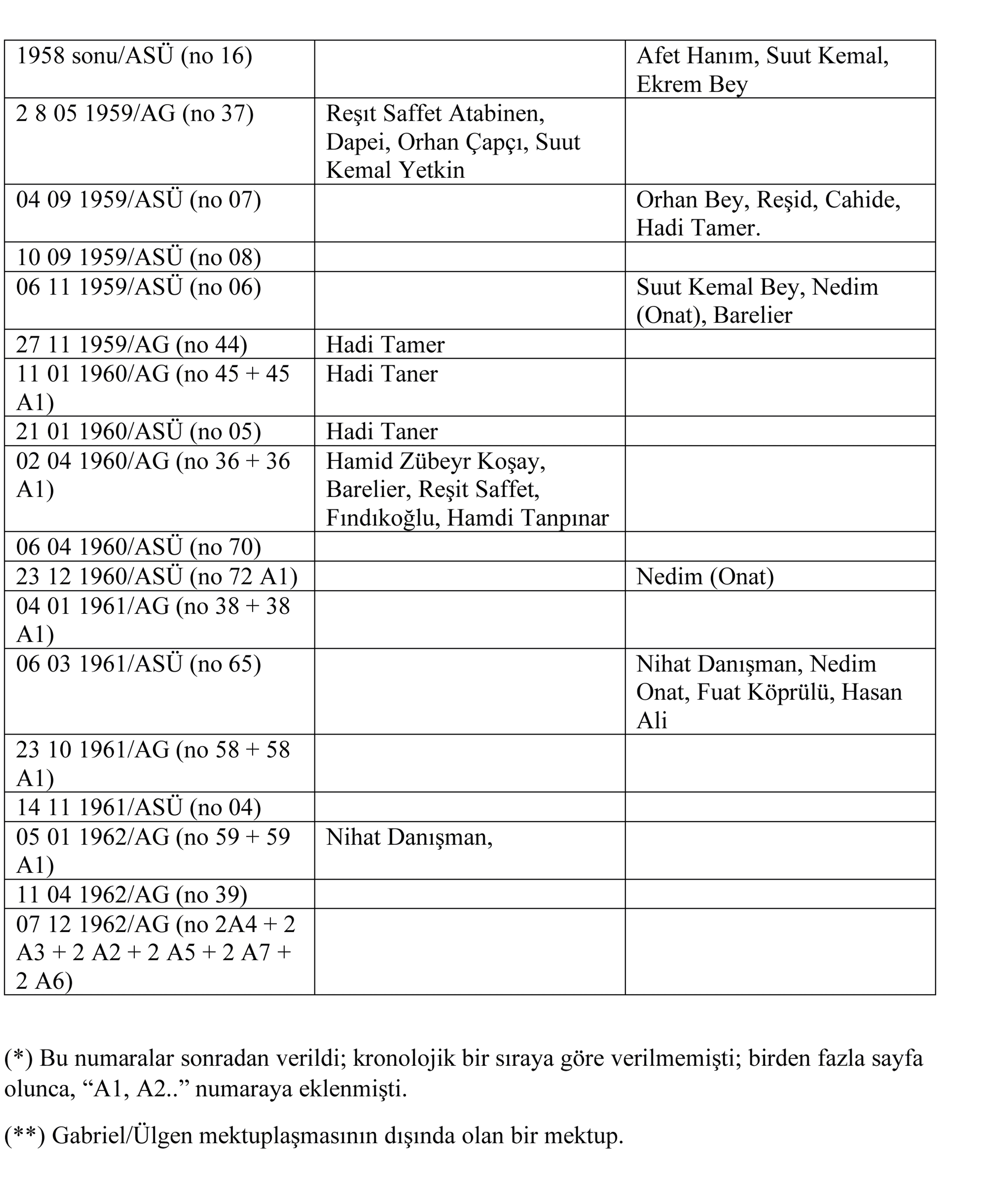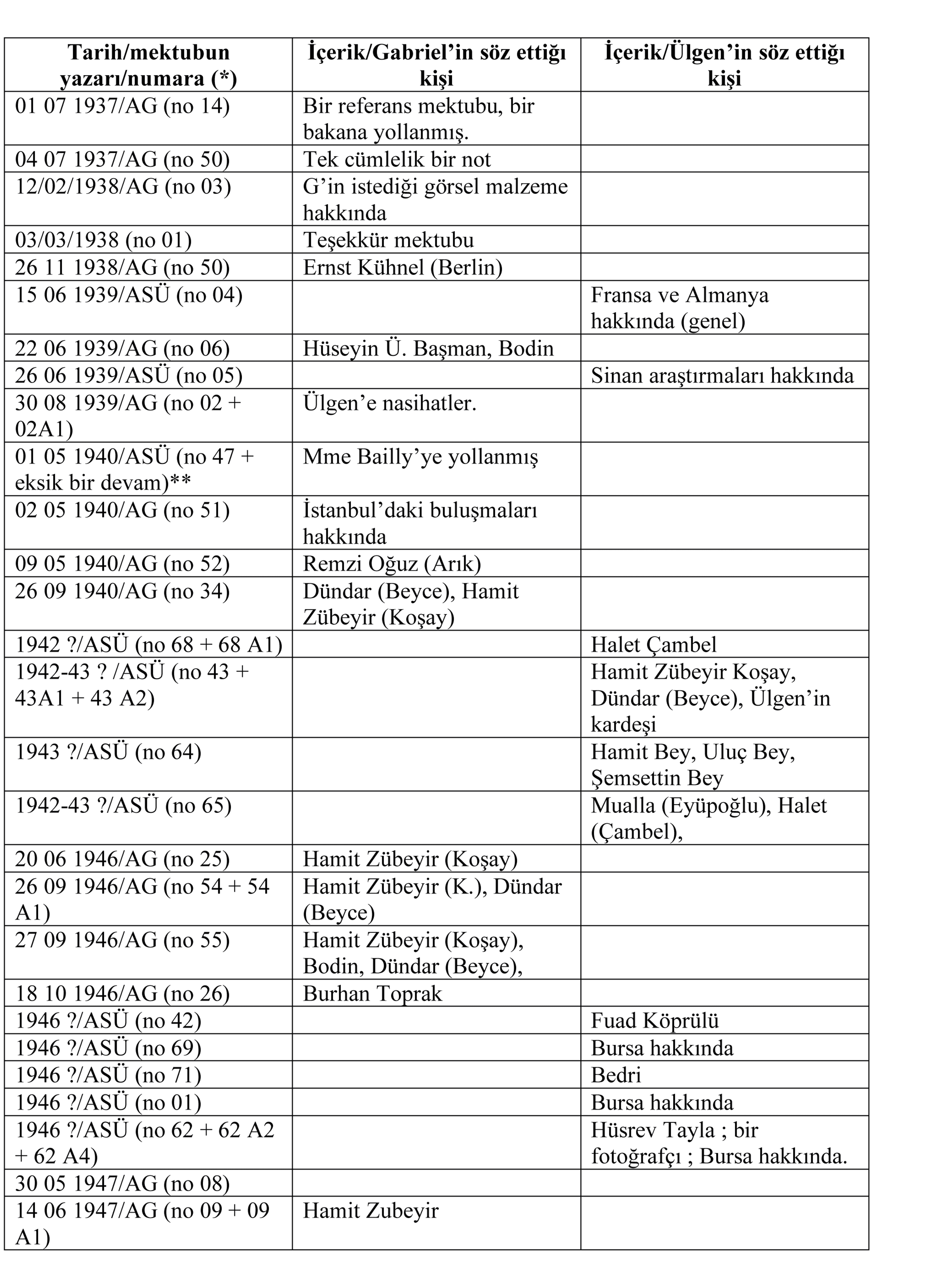 El ve daktilo yazısı arşiv belgeleri Gabriel'in orijinal mektuplarının yanı sıra Ülgen'in müsveddelerinden oluşuyor. Ülgen'in tamamlanmış ve temize çekilmiş mektupları ise Fransa'daki özel -ve maalesef henüz araştırmacılara açılmamış- arşivlerde bulunuyor.[7] Bu açıdan, giriş bölümünde söz edilen "Gabriel perspektifi" kendini dayatıyor. Ayrıca sözü geçen "kayıp" mektuplar Gabriel-Ülgen yazışmasının SALT arşivlerinde muhafaza edilen mektuplardan ibaret olmadığını gösteriyor: hem Ülgen'in mektuplarının son hâlleri, hem de Gabriel'in mektuplarının bir kısmı eksiktir. Yine de malzeme oldukça zengin ve pek heyecan vericidir.
