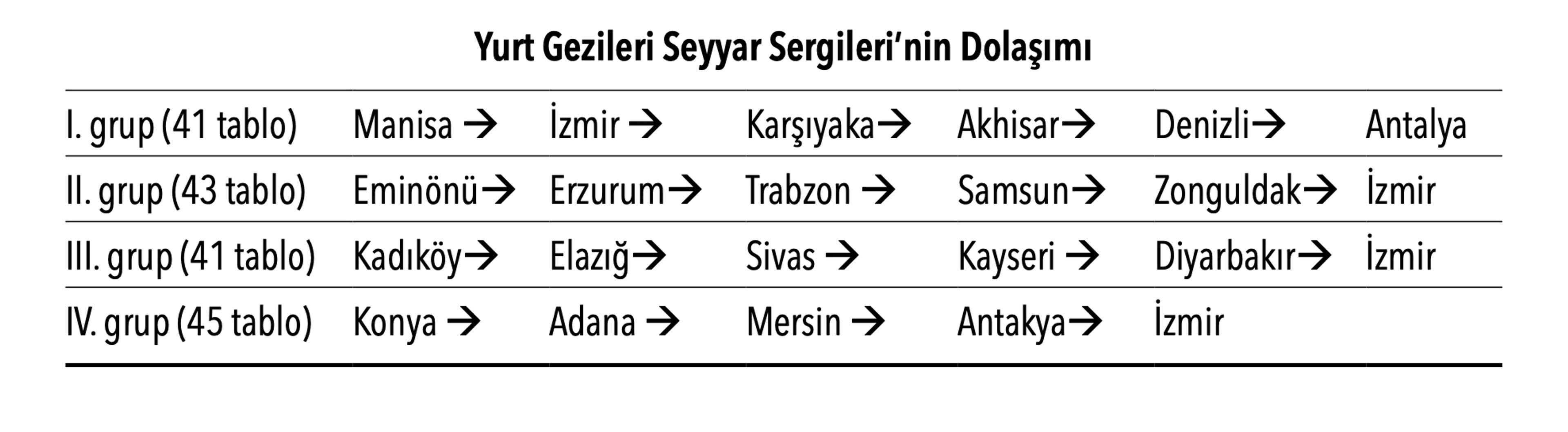 Ressamların Yurt Gezileri kapsamında üretilmiş olan eserler, dört gruba ayrılarak 1944'ten 1946'ya kadar yurdun dört bir yanındaki Halkevleri'nde sergilenir.[26] Böylelikle devlet, üretimini teşvik ettiği sanat eserlerini Halkevleri aracılığıyla kamuyla paylaşarak resim sanatına verdiği önemi somutlaştırmış olur.