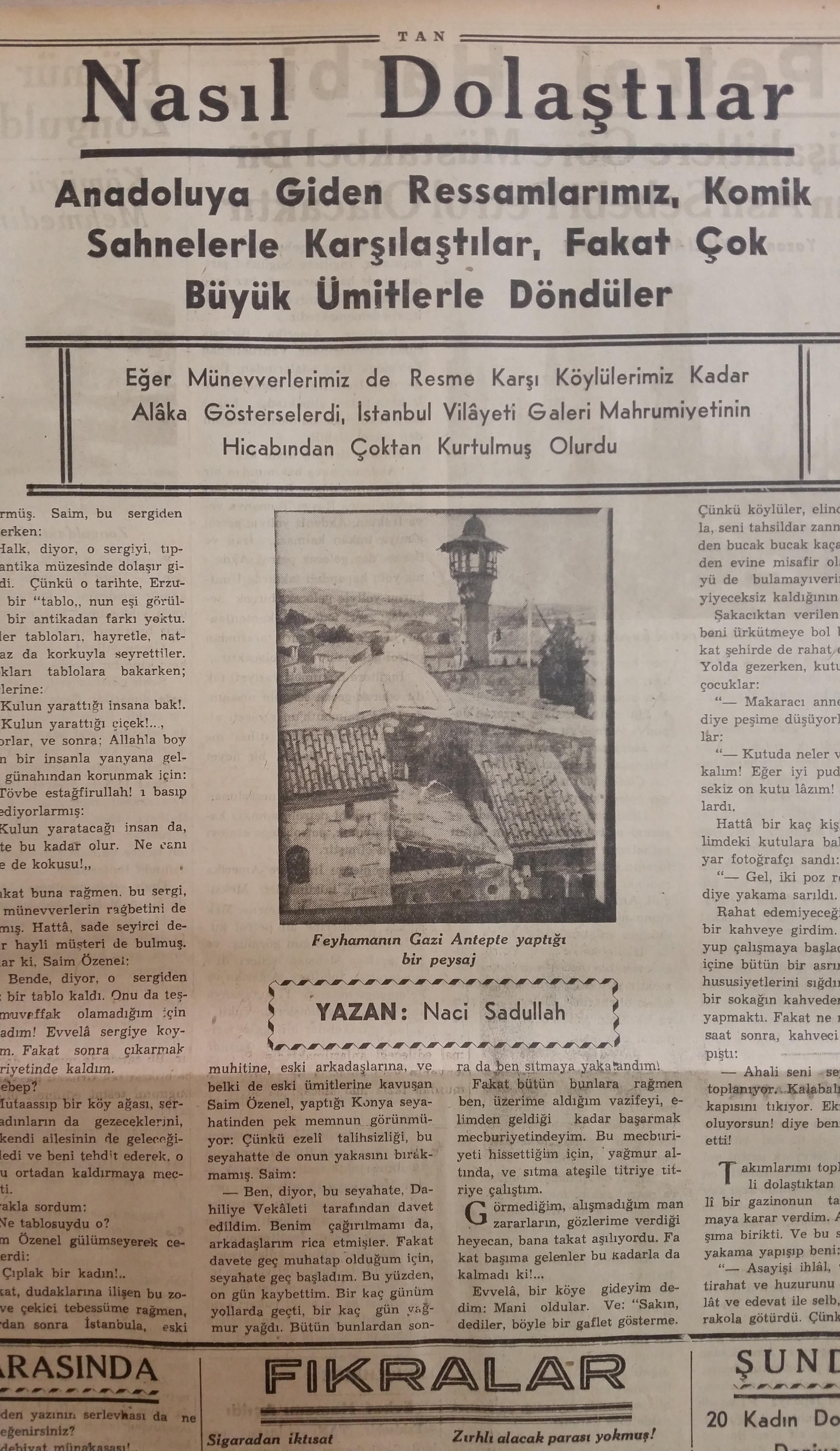 Yazarın notu: Cumhurbaşkanlığı Devlet Arşivleri'ndeki Cumhuriyet Arşivi'nden çıkan belgeler ile edinilen bulgular, erken Cumhuriyet döneminde resim sanatı ve siyaset alanındaki tarihyazımında ciddi bir güncelleme ihtiyacını doğurdu. Bu bulgulardan en önemlisi, Ressamların Yurt Gezileri'nin 1938-1946 yıllarında düzenlendiğidir. Sanat tarihi kitaplarında ve saygın müzelerin salonlarında dahi, muhtemelen Cumhuriyet Halk Partisi Resim Sergisi 1944 adlı kataloğa[1] dayanarak 1943'e kadar yapıldığı yazılan geziler, aslında 1944'te verilen aranın ardından 1945 ve 1946 yıllarında da düzenlenmiştir.