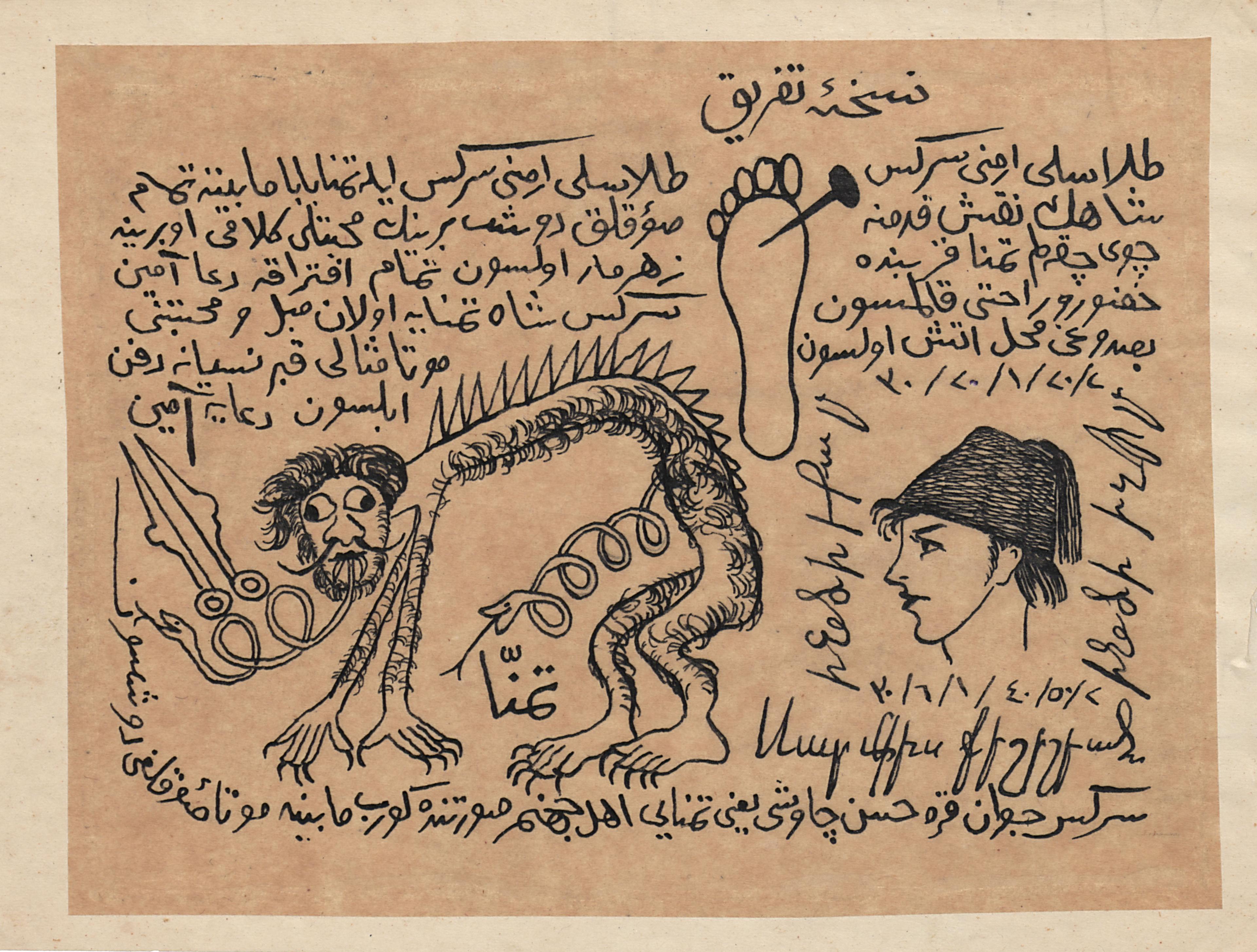 Kahveci Gürcü Nusret’in Zindan Şiirleri antolojisi için İstanbul Hapishanesi’nde çizdiği, Somuncu Baba’nın tılsımlarını yazdığı Talaslı Ermeni Serkis