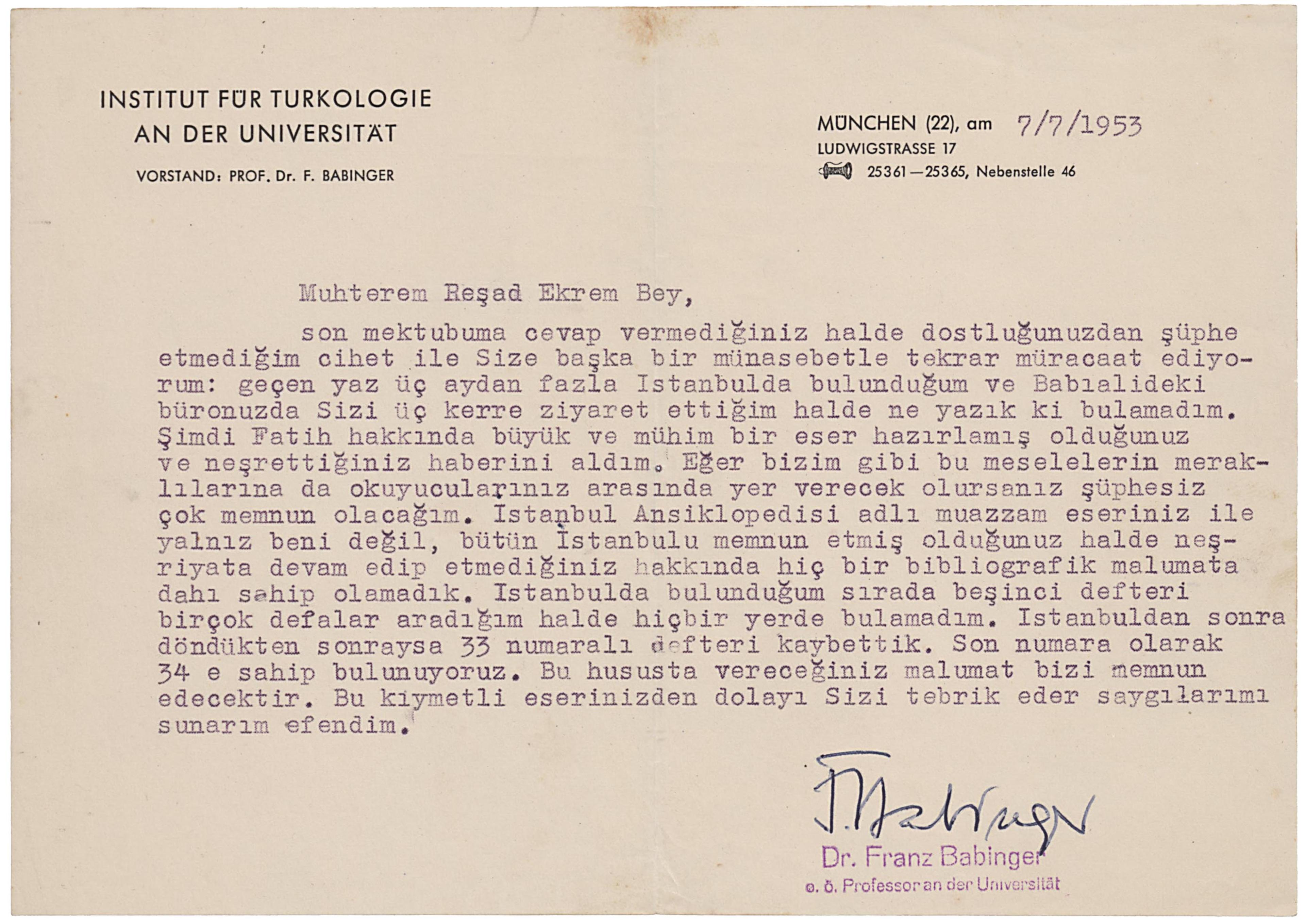 Dr. Franz Babinger’in Reşad Ekrem Koçu’ya yazdığı mektup