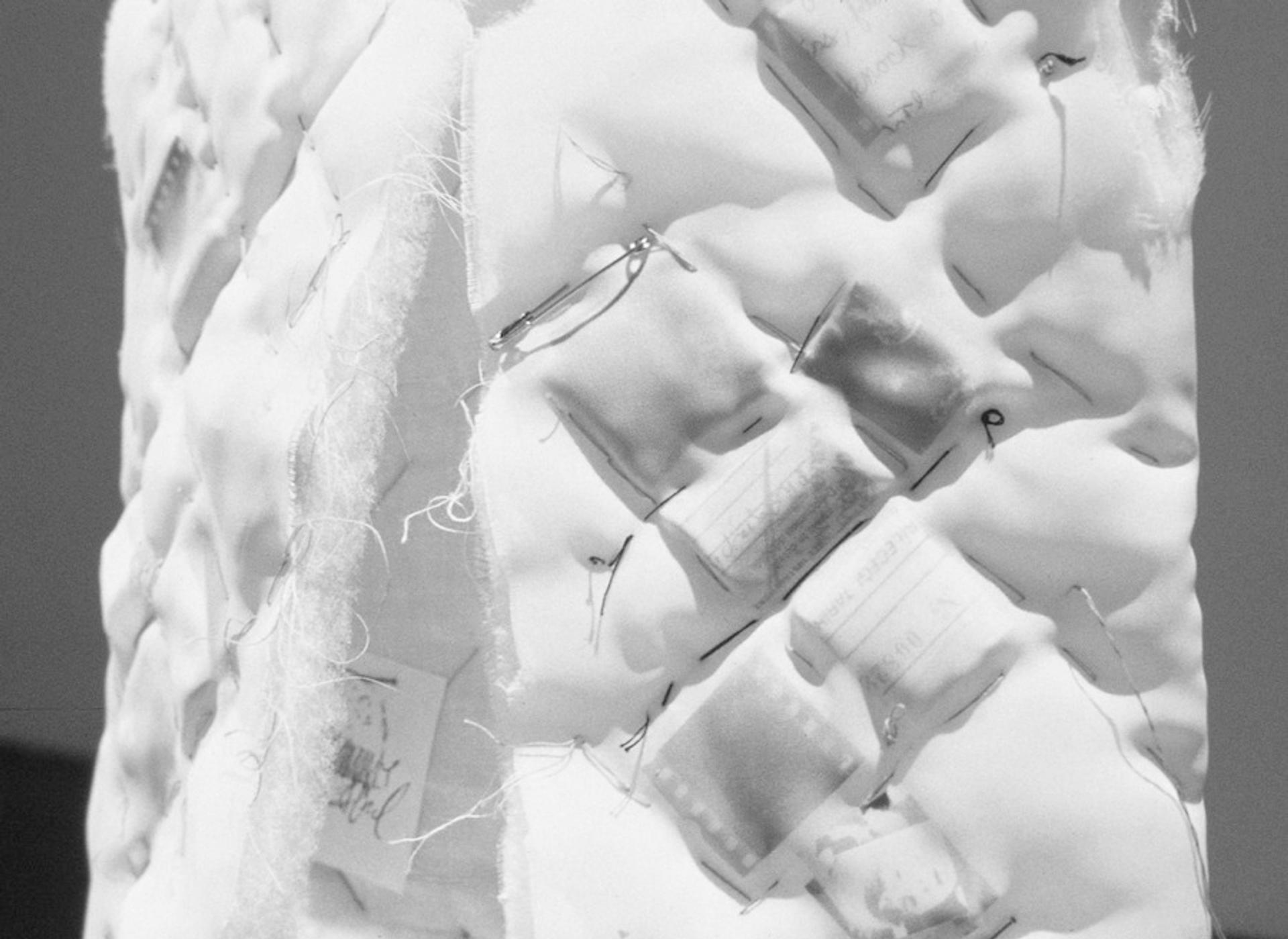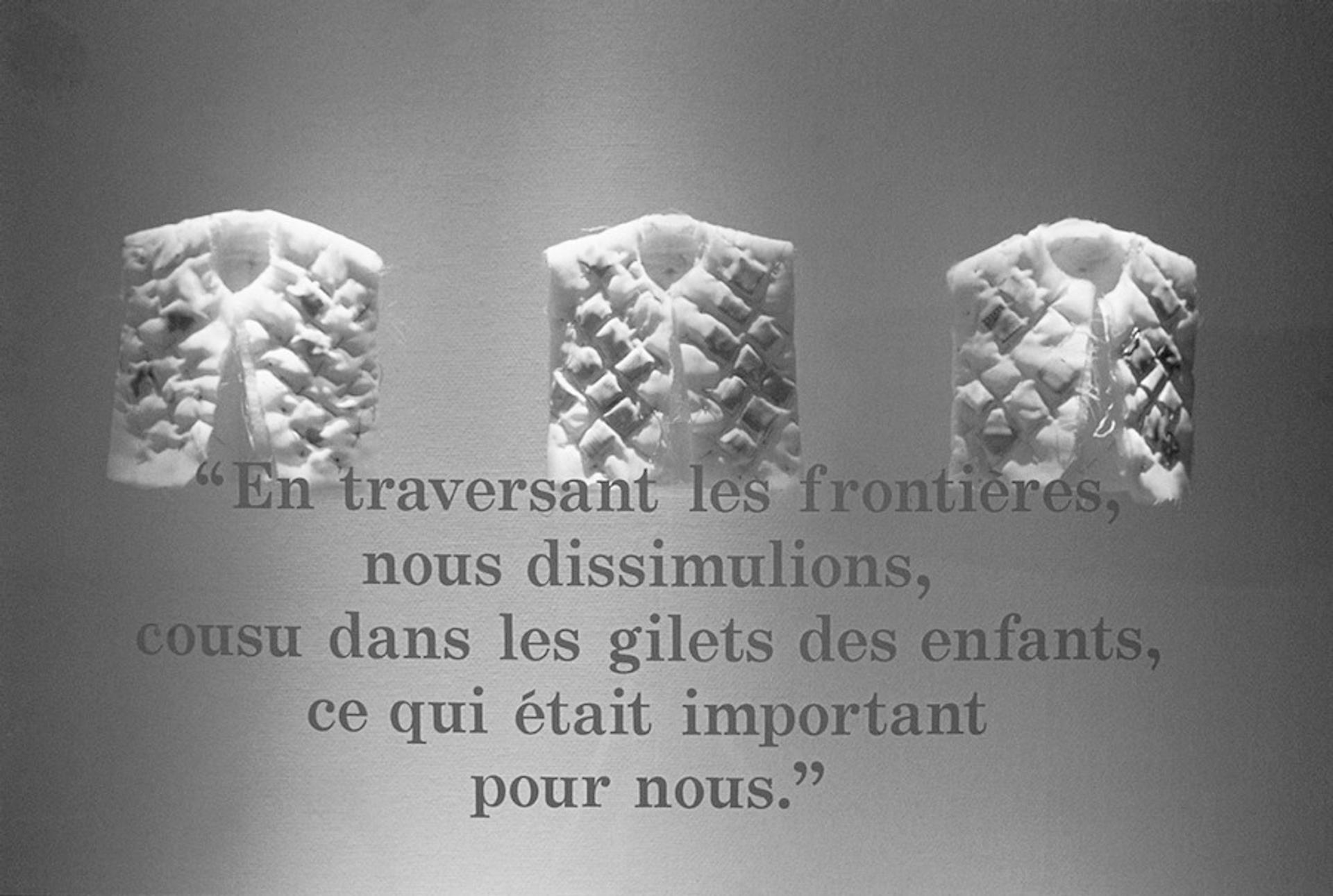 Karamustafa's grandmother was among the thousands of Ottoman Turks who were forced to migrate from Bulgaria to Turkey in 1893, during the nationalistic upheavals in the Balkans.[14] She once told Karamustafa, "As we were crossing the borders, we hid our important belongings in the inner pockets of the children's [shirt] waists." This became the basis of Courier (1991; Fig. 6a-b).[15] Small, folded papers with writing on them were placed on children's shirts, which were mounted on clear Plexiglass stands. Referencing her grandmother's memory, she was stating that people who belong nowhere carried what they could on their bodies and in their clothes. This installation, which resembled a mausoleum, transformed the artist's personal memory into social consciousness. For an exhibition in Canada, she added two items of clothing to the work. These were sewn completely closed so that they could not be worn and stood for the country that people had to leave with no chance of returning; these were hung on the wall beside a photograph of her grandmother.