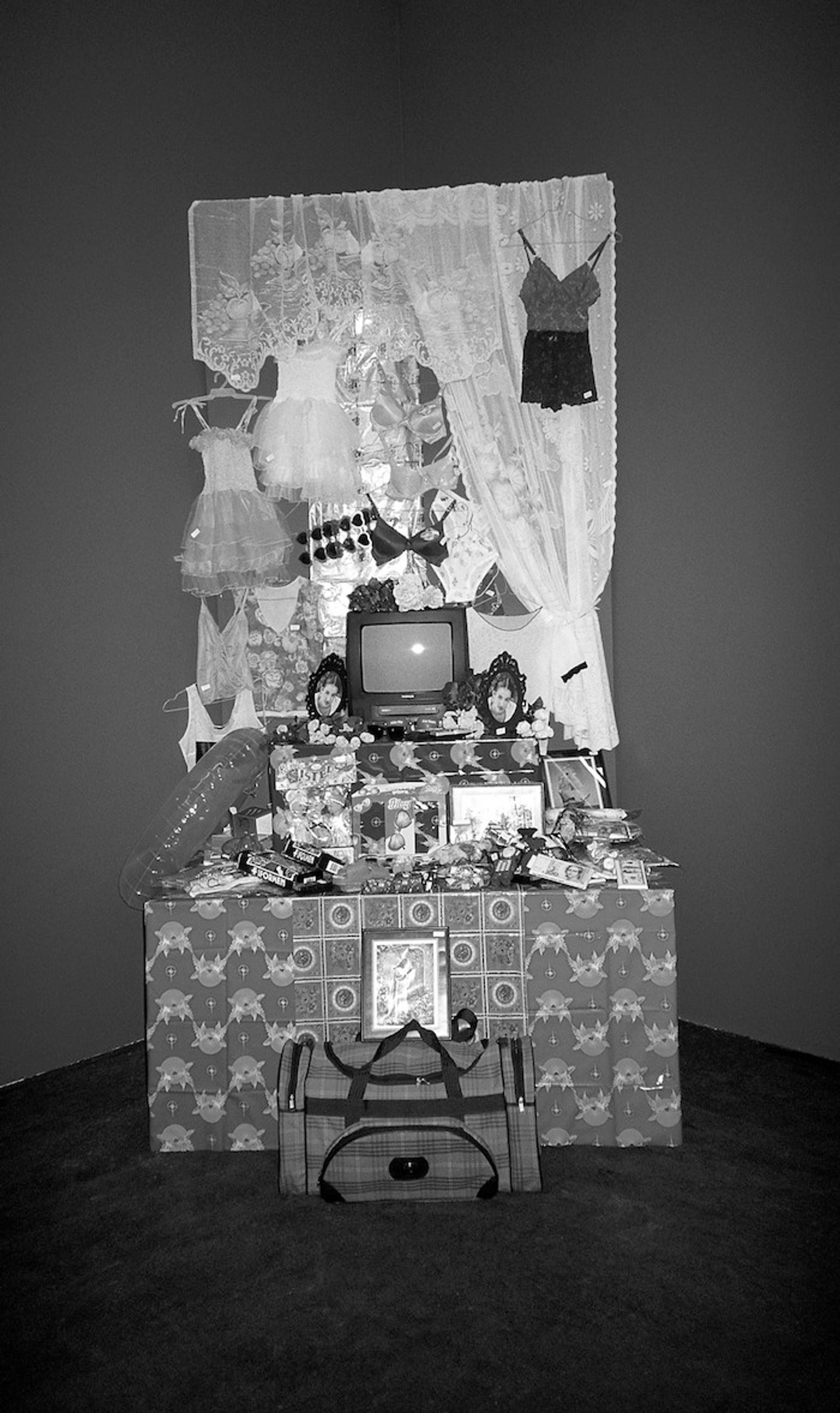 The place of women in a changing world is of great importance to Karamustafa, and a symbolic catalyst for change was the fall of the Berlin Wall in 1989. Her performance piece titled Objects of Desire, Suitcase Trading (Limit 100 Dollars) (1998, Fig. 10)[21] was about the emerging issues in the aftermath. Economically challenged women from Romania, Moldavia, Russia, and elsewhere traveled to Turkey carrying suitcases filled with goods to sell. They brought goods from home as if they were their personal belongings, and refilled their empty suitcases with cheap Turkish products to market back home. The cycle, known as suitcase trading, continued for a long time as part of an informal economy. Because the practice was very profitable, some women sold their bodies to earn money to use as capital, and as prostitution increased, suitcase trading became a large operation run by various crime organizations. In Objects of Desire, Suitcase Trading (Limit 100 Dollars) Karamustafa referred to both women and goods as similar objects of desire. Women can be bought and sold; they can be exchanged in order to buy another object. The artist set out to experience suitcase trading personally and started her project with 100 dollars, as this was the least amount paid for prostitutes in that period. She used the money to purchase various objects such as music boxes, artificial flowers, men's and women's underwear, makeup kits, and plastic kitchen equipment to take across the border. She opened a stall at each city she visited and documented the objects she sold with Polaroid photographs and placed them next to the stall. She added a movie showing markets in Istanbul. Karamustafa also met with different consumer groups to examine the differences in habits and preferences in different locations. Unawarded Performances (2005), a film made for the "Projekt Migration" exhibition in Köln, describes another group of women from Eastern Europe who came to Turkey after the fall of the Berlin Wall. These highly educated women, who had good lives before the crisis, tell about their experiences in Istanbul working as nannies, sick-nurses, or housekeepers.