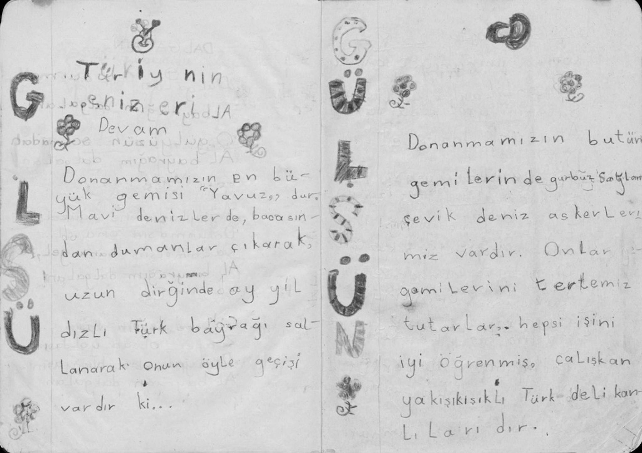 During the 1990s, Karamustafa presented works in which she used personal objects and images to relate her own experiences to the social transformations she had witnessed. As she questioned concepts of time, memory, and migration on the basis of her own personal history, she superimposed social issues using her autobiography like a "personal healer."[13] For The Notebook (1993; Pl. 10 & Fig. 5), the first of these works, she used her primary school notebook from 1953–54. In it were sentences dictated by her teacher imparting militaristic ideas, for example, "Soldiers protect the borders and they use their bodies as shields in order to protect the country." The pages also were filled with colorful flowers and decorative letters spelling her name. For the installation, she hung photographs of herself as a child over the notebook on the wall of the exhibition hall. By emphasizing the contrast between the flowers and militaristic sentences, she drew attention to the clash between the tough prescriptivism and childhood innocence. My Roses My Reveries (1998) again used a photograph from the 1950s, this one showing her saying goodbye to her father, who was going off on a business trip and looking back at her from a train window. The digitally enlarged photograph (118" x 75") was placed in a wide niche of the Maçka Art Gallery (Istanbul), where viewers could feel the mood of that moment, of a child being separated from her father because of his job. On the exterior of the building, on the inside walls, and on the ceramic floor tiles, the artist distributed popular rhyme couplets from poems of that era that were easy to remember. The exhibition space was used like a playground and elicited various readings.