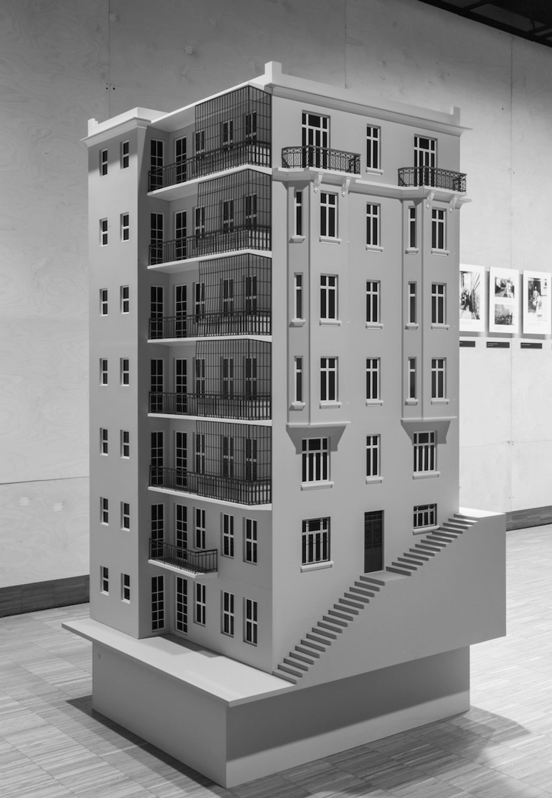 The Apartment Building (2012; Fig. 7) is based on the building where Karamustafa has lived since 1991. Located in Cihangir, one of the most popular areas in Istanbul, it was built in 1931 by a Greek family named Vaslamatzis, which later fled to Greece after nationalist attacks against Greek, Armenian, and Jewish citizens in Turkey during September 6–7, 1955. The artist was very much affected by their migration story and prepared her work as a "gift" to the Vaslamatzis family, whom she had met from time to time. She made a model of the building, almost two meters tall, which she delivered to the National Museum of Contemporary Art in Athens, where the model was placed in the center of a room surrounded by wall photographs, including images depicting the story of the family and some of the events of September 6–7. With this "symbolic act of return,"[17] Karamustafa underlined the idea that we should face history and not bury it, since the nationalistic attacks during the events of September 1955 and their consequences were rarely recognized in the history of modern Turkey.
