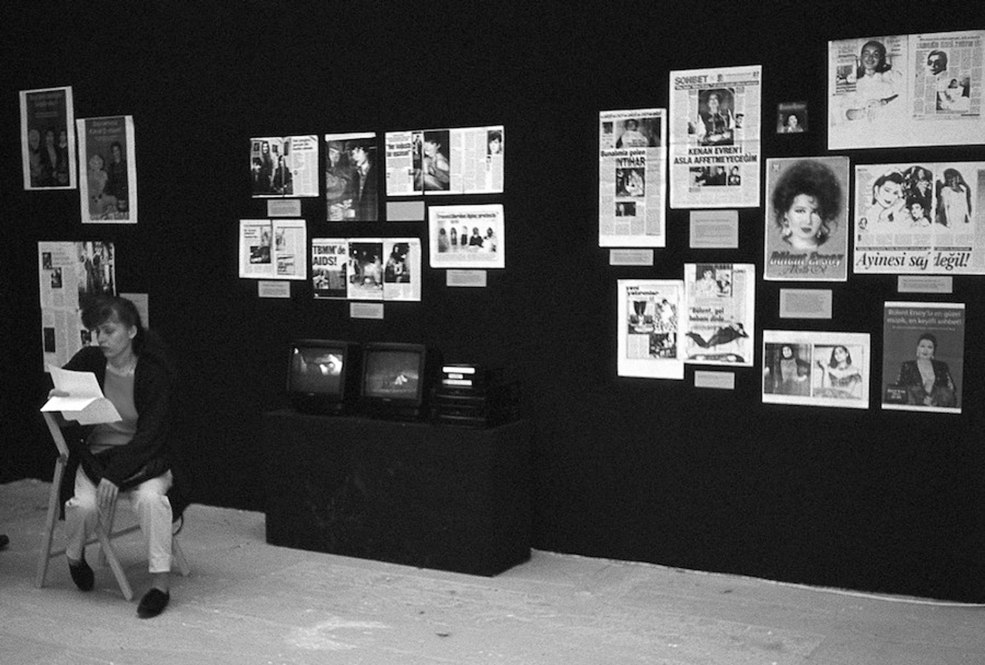In 1996, Karamustafa was one of eight women from different professions—including a sociologist, film director, textile supplier, and other artists—to collaborate on a project titled "Culture/A Portrait of Gender from Istanbul," focusing primarily on migration, feminism, and identity.[19] Karamustafa's video contribution, A Playground in the Net of Gendered Relations (Fig. 8), was about the very popular shows of transsexuals and transvestites on Turkish television at the time. Two monitors played simultaneously, one showing the singer Bülent Ersoy, and the other the singer and showman Huysuz Virjin. Their popularity indicated that, despite viewers' varying backgrounds (religion, gender, culture, etc.), they liked these shows. Karamustafa wrote that, "In an environment where transvestites and transsexuals struggled for their life under brutal conditions and had to organize to defend their rights, the popular interest of both men and women in these shows revealed the social hypocrisy towards transvestites and transsexuals."[20] The artist wanted her piece to expose the hypocrisy of their situation. The television programs did not show the real lives of transvestites and transsexuals, which were lived under very different conditions in which they were exposed to violence and exclusion and suffered discrimination. Her piece was intended to point up the fact that these kinds of shows were not reflective of real life but rather "playgrounds" where actors played. Similarly, for Unconsolidated Visions (1998; Fig. 9) she presented close-up photographs of transvestites and transsexuals taken in Istanbul and Valencia, Spain. Referring to the tradition of painting the underside of Spanish balconies, she installed these photographs on the undersides of balconies of a Roman theatre in Sagunto. Her choice of location, said Karamustafa, was that balconies are "inter-locations"; they are neither inside nor outside, like transvestites.