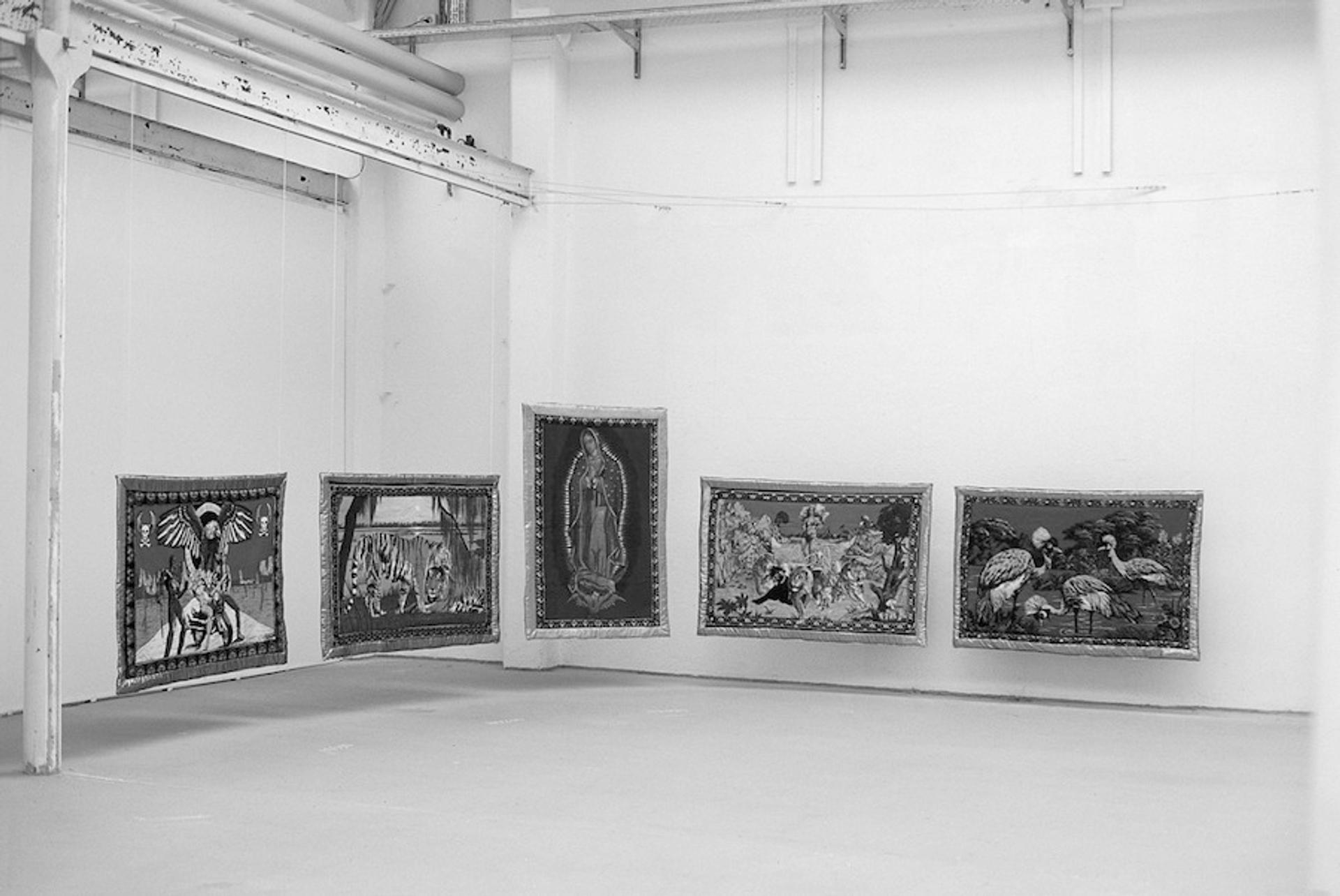 For another work about cultural hybridization, Postposition (1995; Fig. 3),[8] five framed tapestries were presented as Byzantine icons.[9] Although displayed as carpet-like objects typical of a predominantly Muslim society, these tapestries incorporated religious and cultural motifs belonging to Christianity and Western society, such as the images of Christ as a shepherd and Elvis Presley.