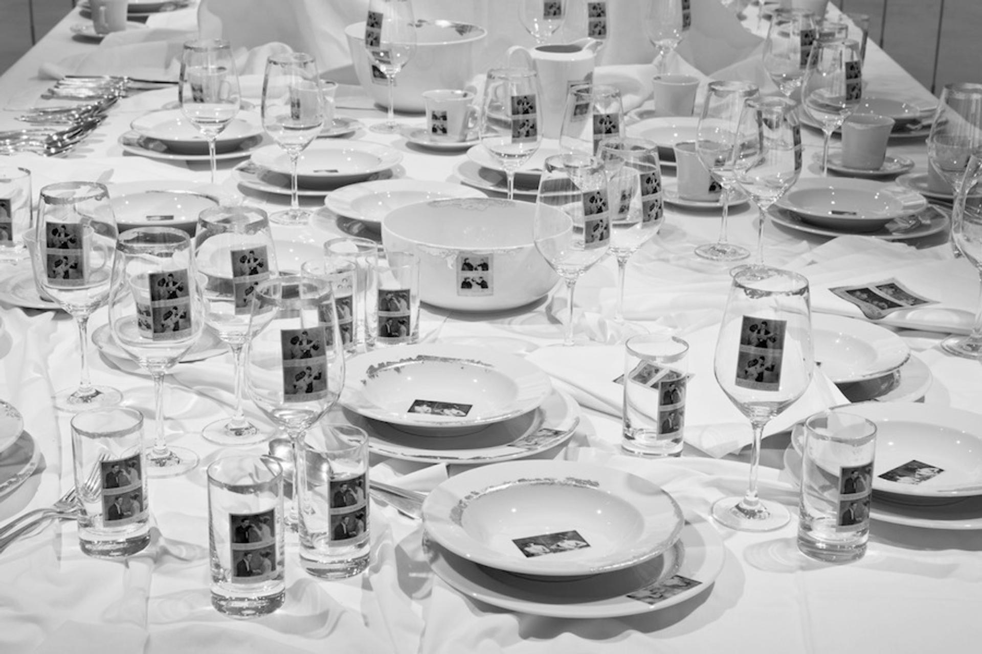 Karamustafa continues to explore this theme in recent works such as Anti-Hamam Confessions (2010), a video presenting the hamam (Turkish bath), a common subject of orientalist painters, in such a way as to turn western fantasies upside down. To deconstruct (and destroy) the orientalist view of the Turkish bath, she used a historic bath building in Tahtakale in Istanbul, designed by the Ottoman architect Mimar Sinan, which resembles neither the hamams represented in orientalist paintings nor the modern hamams used by tourists. For an installation titled Etiquette (2011; Fig. 4), also on this theme, the starting point was a 1933 book in the Ottoman language in which French-style etiquette was applied to Turkish society. Karamustafa prepared a dinner table based on illustrations showing proper western-style table settings with glasses, plates, and napkins. Most of the table was white, except for gold leaf designs on the plates and glasses to give the idea of an upper-class table. The western style clothes and attitudes of the male and female figures in the pictures on the labels seem far removed from the Turkish society of that era, and reflect the idea of a "nowhere" society stuck between Ottoman traditions and modern (1930s) Turkey.