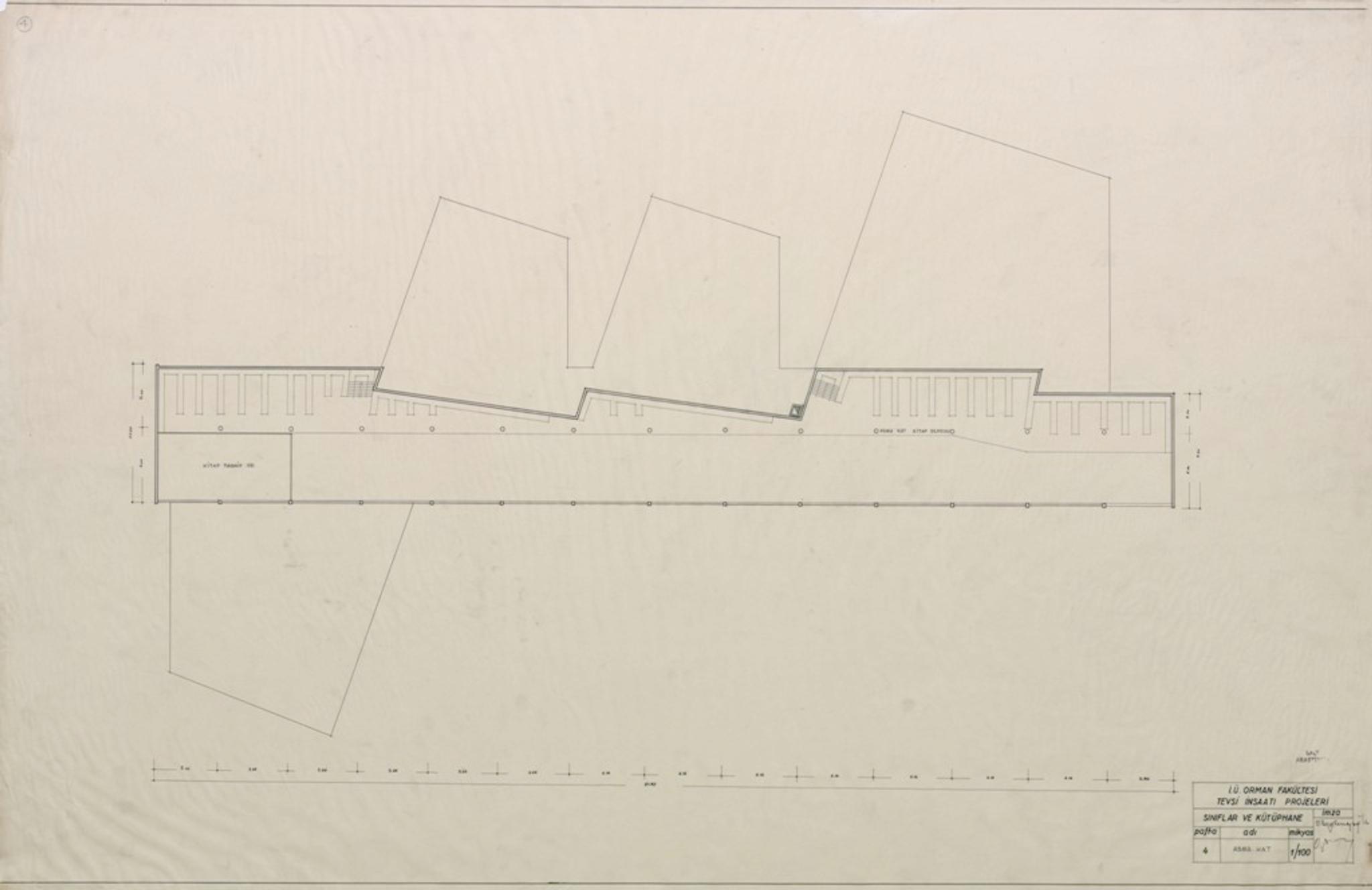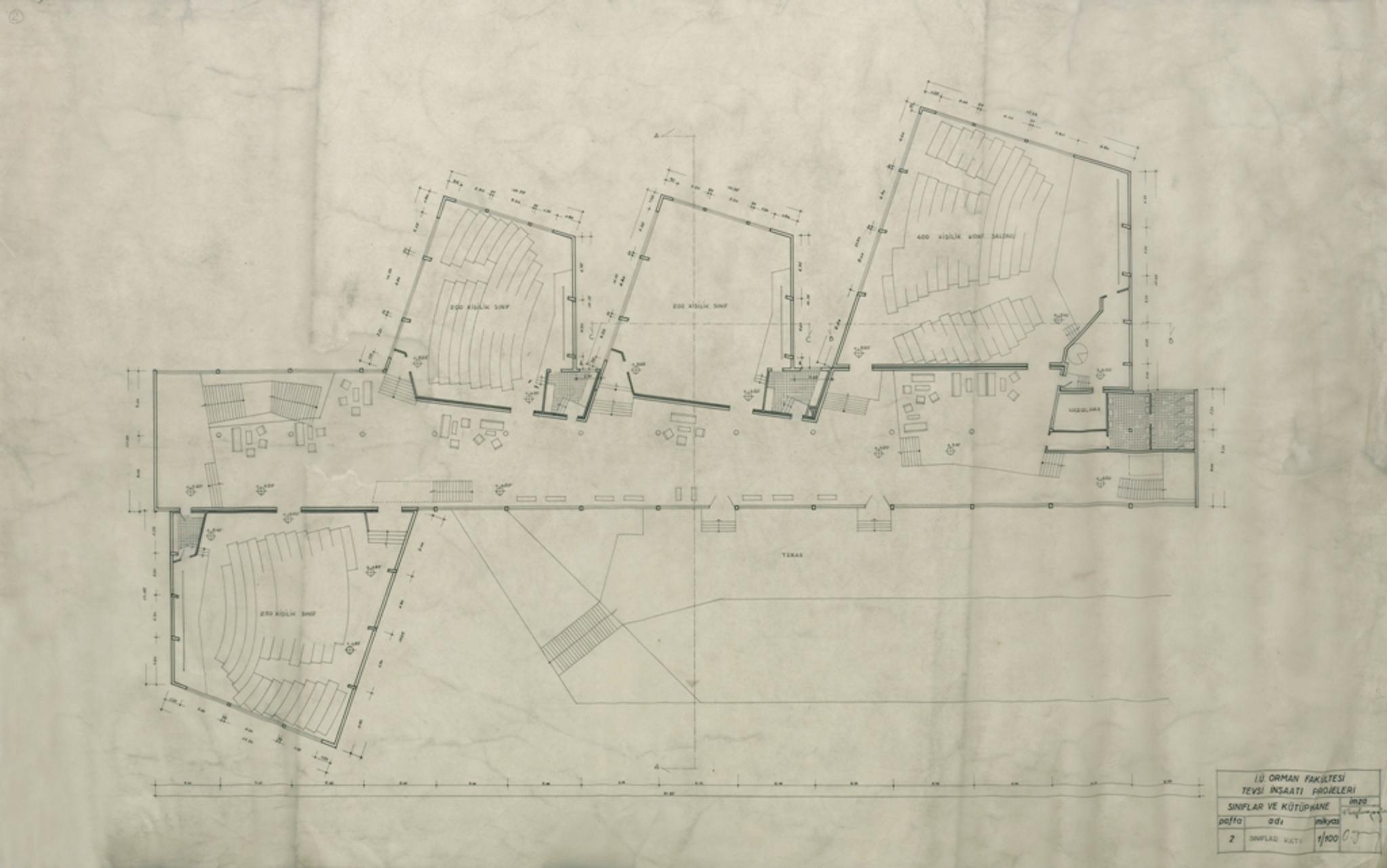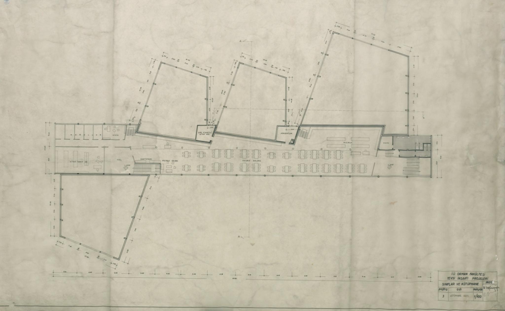 Öğrencilerden biri, "Kampüsteki bütün binalar çok düz, burası öyle değil" diye ekledi. Haklıydı, binanın arşivdeki çizimlerinde en dikkat çeken özelliği, uzun bir omurgaya takılı ve hiçbiri dik açılı olmayan amfileri, planda açılı duran merdivenleri ve yine açılı cepheleri. Kampüsün vaziyet planına bakınca da öğrencinin serzenişi doğrulanıyor; U, L ya da dikdörtgen planlı klasik eğitim yapılarının yanında bu bina farklı açıları ile ayrışıyordu.