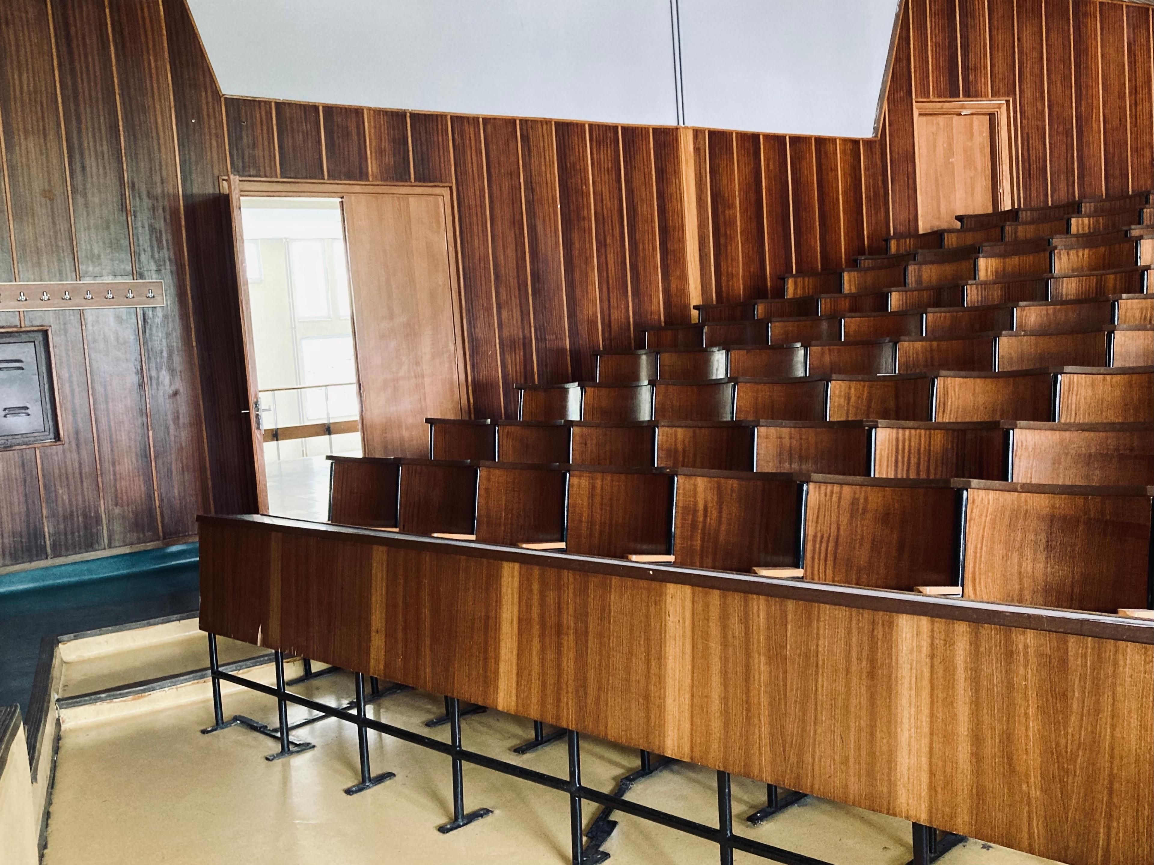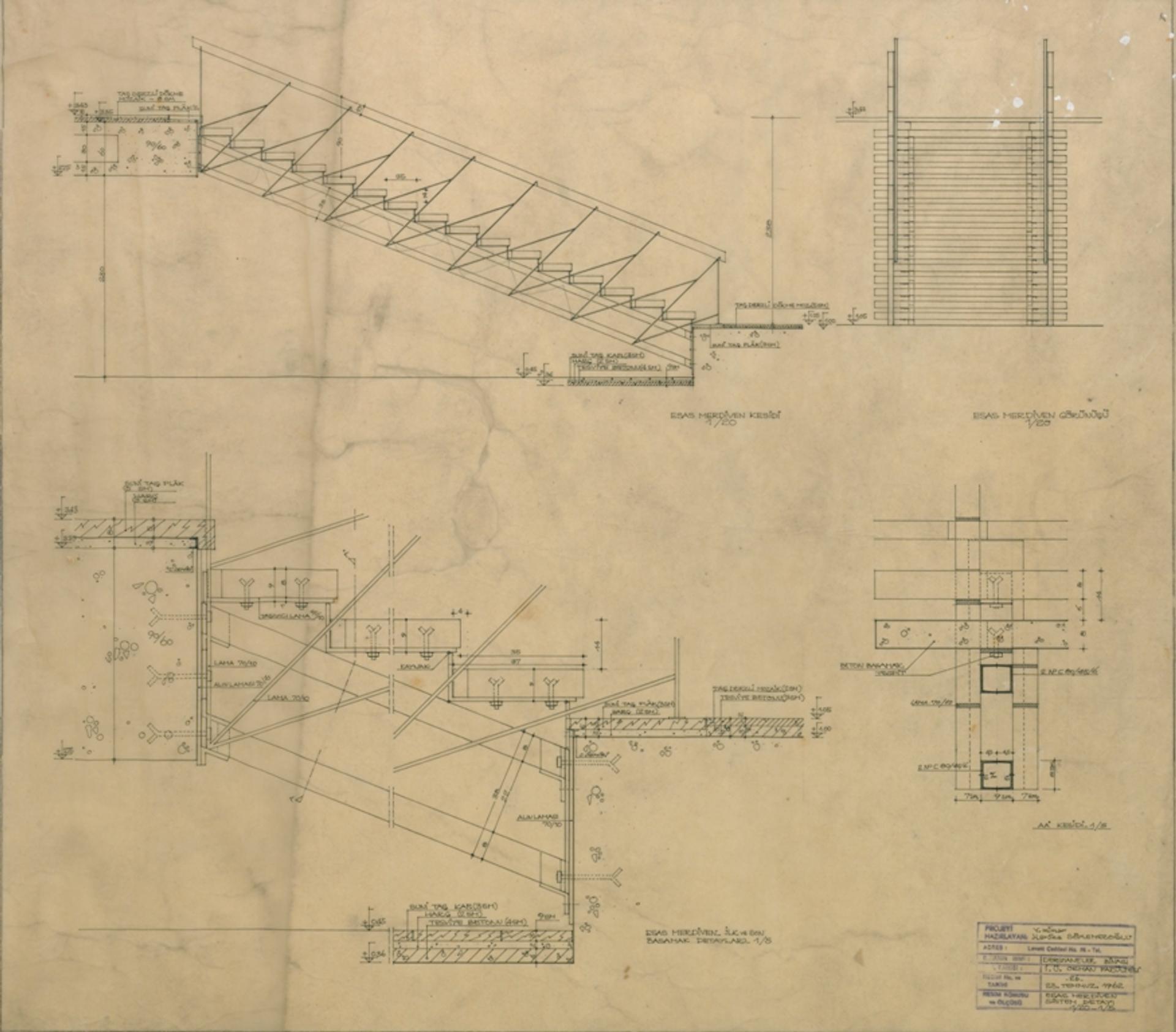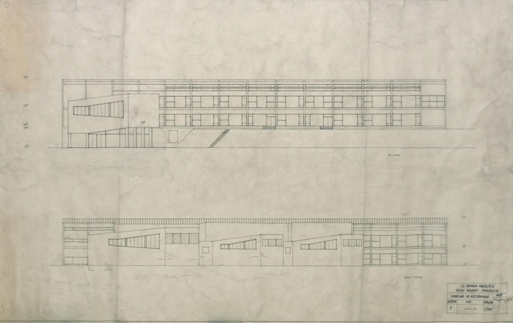 Öğrencilerden biri, "Kampüsteki bütün binalar çok düz, burası öyle değil" diye ekledi. Haklıydı, binanın arşivdeki çizimlerinde en dikkat çeken özelliği, uzun bir omurgaya takılı ve hiçbiri dik açılı olmayan amfileri, planda açılı duran merdivenleri ve yine açılı cepheleri. Kampüsün vaziyet planına bakınca da öğrencinin serzenişi doğrulanıyor; U, L ya da dikdörtgen planlı klasik eğitim yapılarının yanında bu bina farklı açıları ile ayrışıyordu.