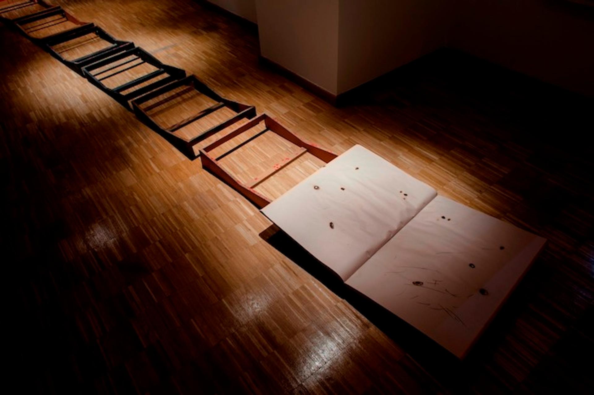 İ.S.: İlki, çadırlardan esinlendiğim, Kara Konut (1968) adlı işim. İkincisi, Saint Martin's'teki bir yıllık dönemde yaptığım kolektif çalışmalar[5]; onlara bir bütün olarak bakıyorum. Tüm alanı sisal lifleriyle kaplayarak yaptığım yerleştirme, İsimsiz: Yarısı İçten ve Dıştan Silinmiş Cam (1970); bir de, kavramsal sanata başlangıcım olarak nitelenebilecek, küpleri kenevirle bağladığım İsimsiz (1969) işim. Bir diğeri, Royal College of Art'ta yaptığım, Gılgamesh* [Gılgamış] (1970) adlı video işim. Form olmaktan ziyade, o işin düşünsel bir yanı var. Karanlığa giriyor, ileri bakıyor, karanlık yere bakıyor. Sonra, parçaları bugüne ulaşmamış olan One Day Line, One Day Square, One Day Cube [Bir Gün Çizgi, Bir Gün Kare, Bir Gün Küp] (1970-73) var. Türkiye'deyken ürettiğim işlere bakarsak; 10. Paris Bienali için yaptığım enstalasyon önemli. Belki, Leonardo da Vinci (1976)[6] kitabı var, diyeceksin; fakat onun girişimi, Holland Park'taki sergi sırasında tuvalet kağıtlarından yaptığım dört kitapçıkla başlıyor. O dört kitapçık, Leonardo'dan daha önemli, çünkü onlar çoğaltılamıyor. Yeni Eğilimler'de sunduğum iş, hem benim açımdan hem de Türkiye'nin içerisinde bulunduğu zaman bakımından önemli. İngiltere'ye gittikten sonraki çalışmalar var. Benim açıklamalı önerilerimin uygulanması oldukça enteresan, onu kabul etmek gerek. Belki bu tür bir uygulamanın yeni olmadığıyla ilgili kritik gelebilir; evet, bunu da kabul ediyorum.