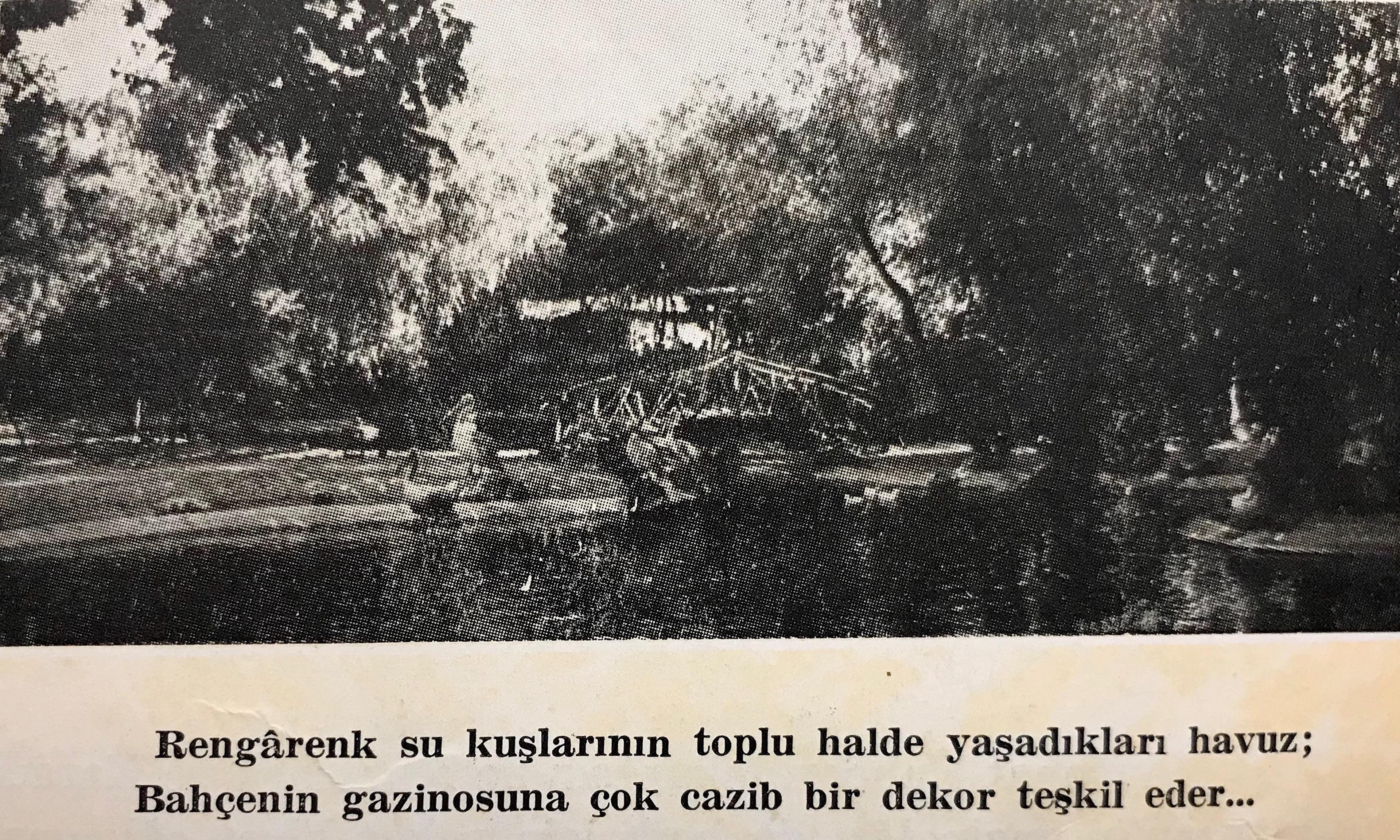 "Hayvanat Bahçesi 1950 ve 1951'de getirilen fillerle panterden başka 1952 senesinde yeni bir panterle zenginleşmiştir. 1953 yılında getirilen kaplanlar, devekuşları, flamingolar, maymunlar, zehirli yılanlar, papağanlar, yeşil tavuslar, gazaller ve bir fil yavrusu ile halkın daha büyük alâkasını çekmeğe başlamıştır. [...] Hayvanat Bahçesi lokantası ile Marmara ve Karadeniz Havuzlarının gazinoları da halk için rahat birer eğlenme mahalli vasfını kazanmış bulunmaktadırlar."[14]
