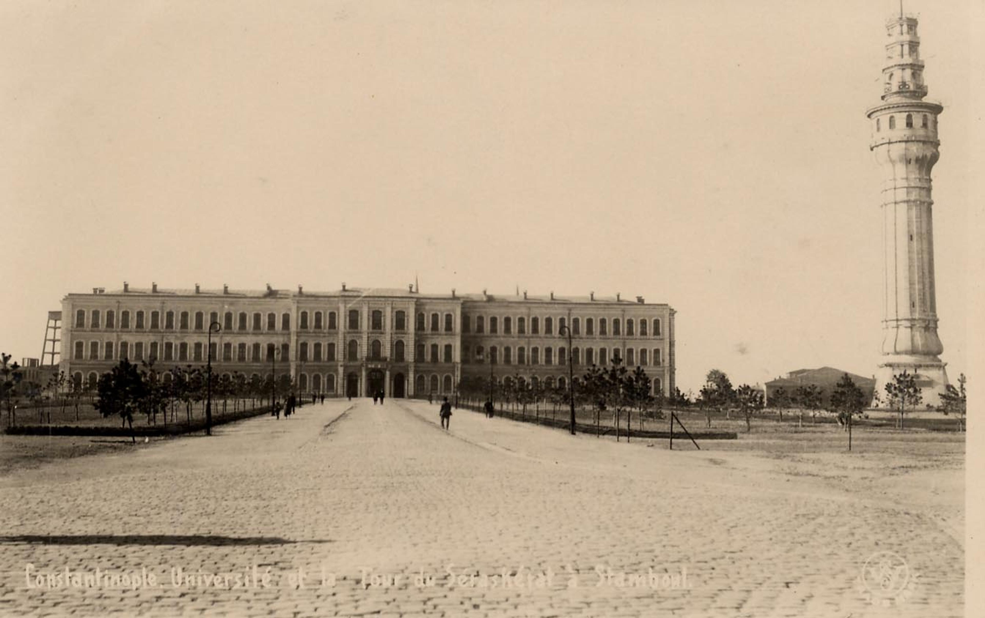 Sağ alt köşede “WS” damgasının bulunduğu Beyazıt Kulesi ve Seraskerat’a dair baskı fotoğraf