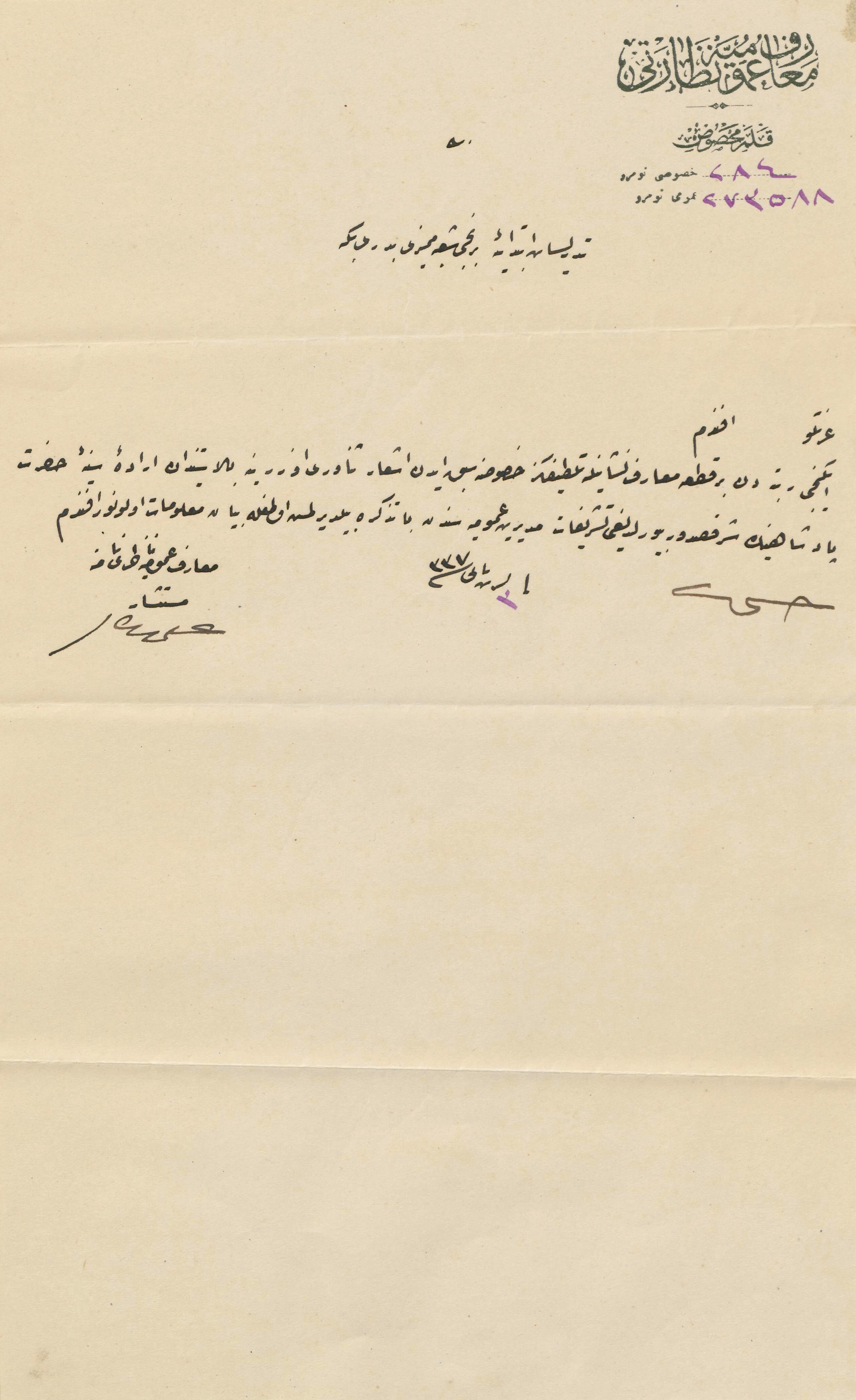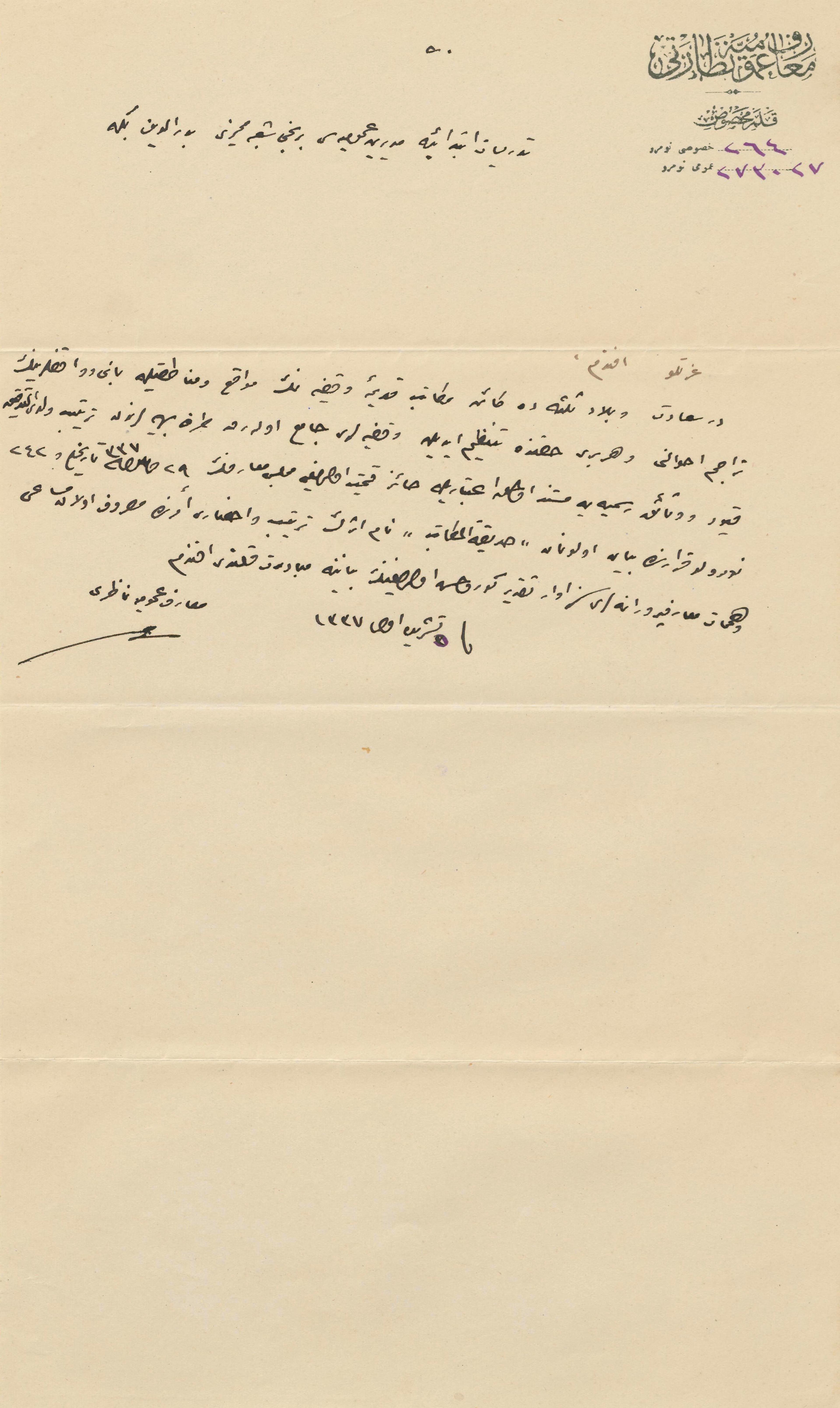 Maârif-i Umûmiye Nezâreti Kalem-i Mahsusa'dan Maârif-i Umûmiye Nâzırı tarafından Tedrisat-ı İbtidâiye Müdür-i Umûmiyesi Birinci Şube M. Bedreddin Bey'e gönderilen 5 Teşrin-i Evvel 1337 [5 Ekim 1921] tarihli yazı, TMSSDOC0139001