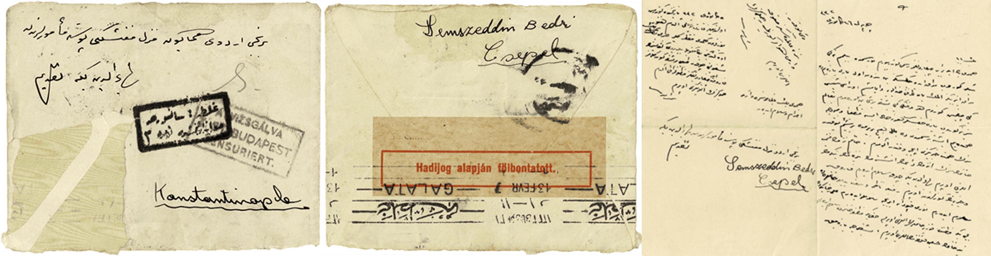 Mustafa Şemsettin Şeniz’in Csepel, Budapeşte’den Birinci Ordu-yu Hümâyûn Menzil Müfettişliği posta memurlarından Bahaaddin Bey’e gönderdiği 16 Kanun-i Sani 1332 [29 Ocak 1917] tarihli mektup ve zarfı, EATDOC001200, EATDOC001200A, EATDOC001201