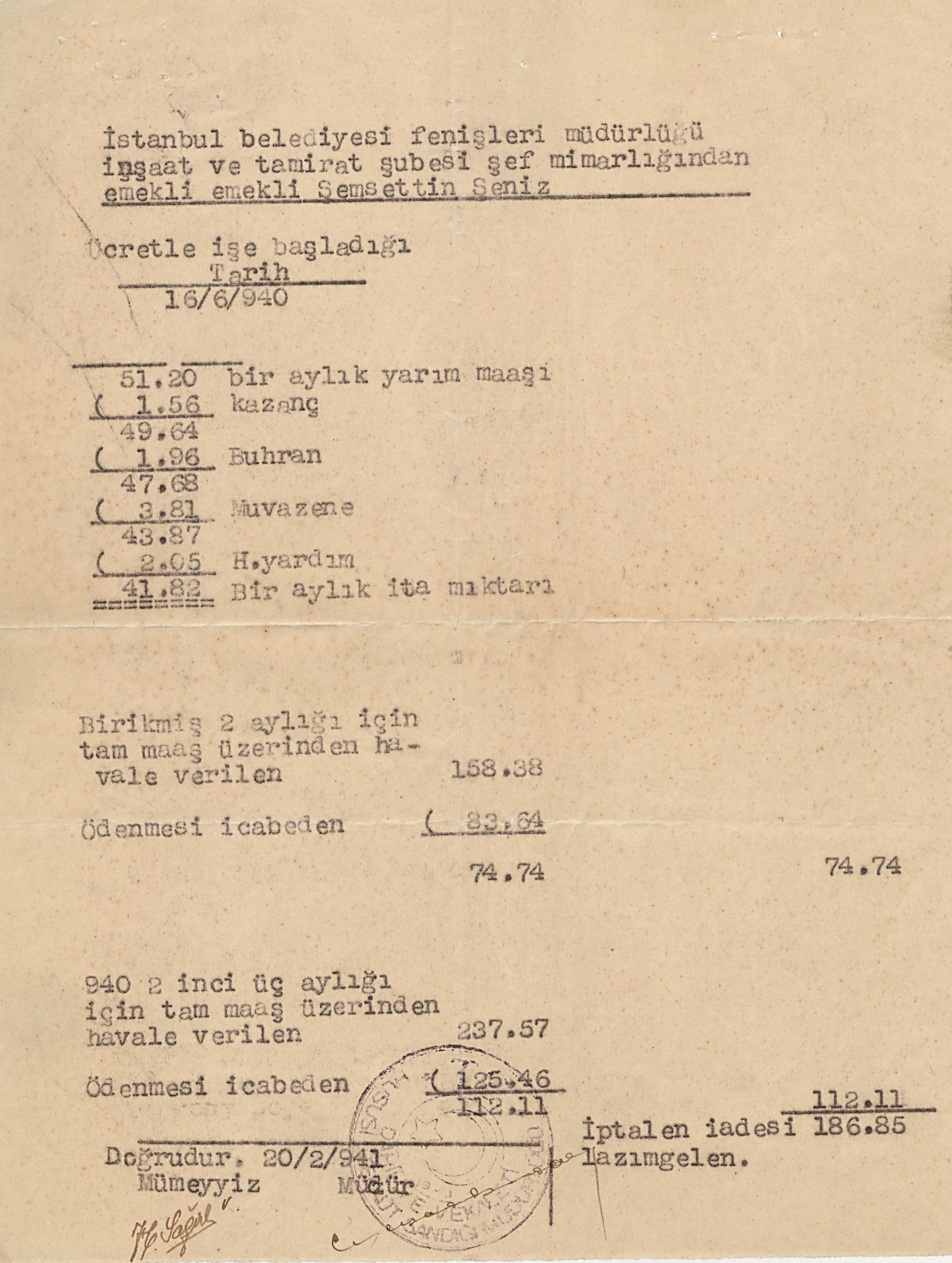 İstanbul Belediyesi Fen İşleri Müdürlüğü İnşaat ve Tamirat Şubesi Şef mimarlığından emekli Şemsettin Şeniz’in maaşı hakkında 1941 tarihli belge, EATDOC0007