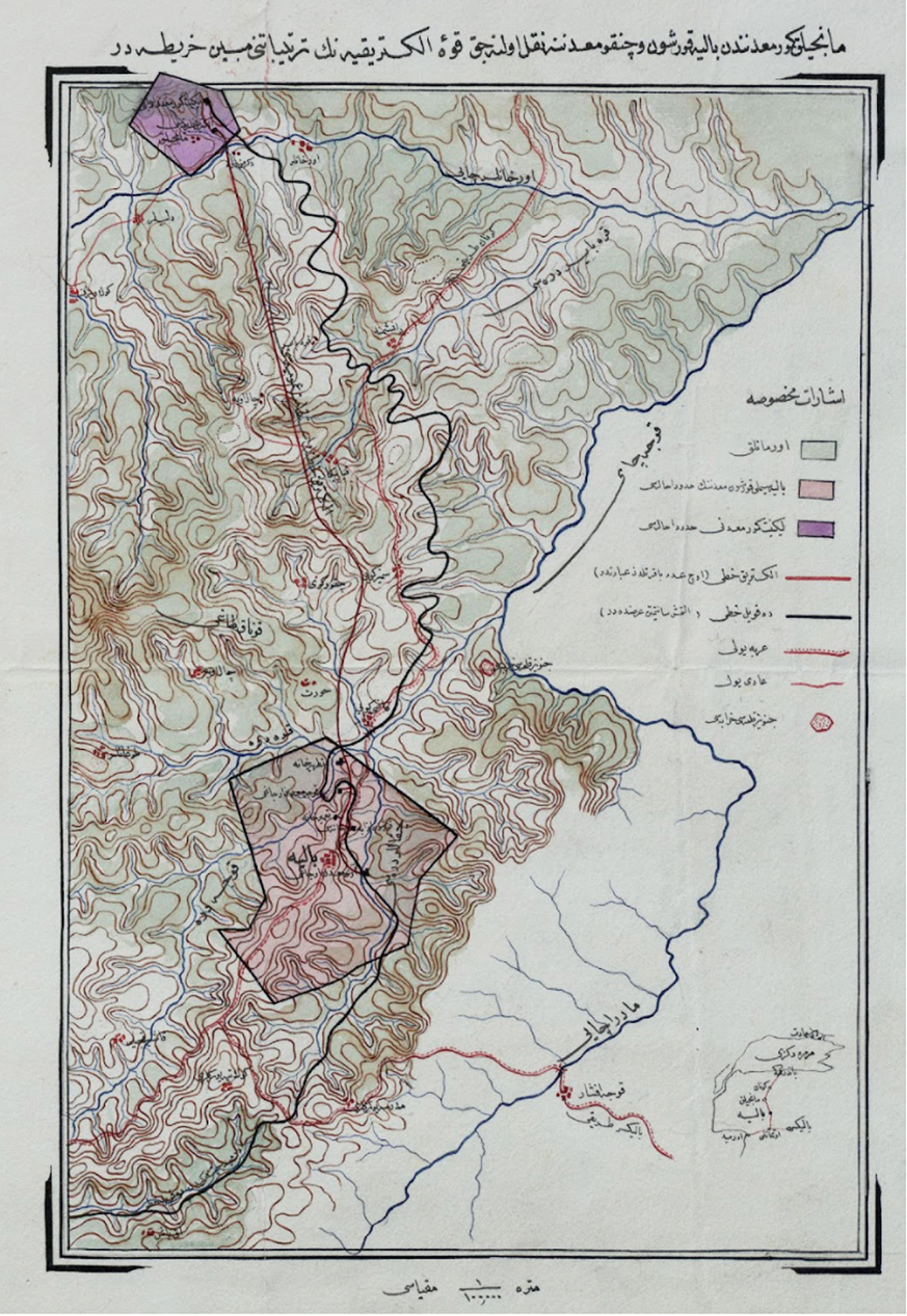 Balıkesir-Mancınık Kömür Madeni’nden Balya Kurşun ve Çinko Madeni’ne nakledilecek elektrik hattını gösteren harita. Ormanlıklar, yollar, linyit kömür madeni hududu, dekovil hattı ve Balya simli kurşunun hududu gösterilmiştir. Cumhurbaşkanlığı Osmanlı Arşivi (BOA), HRT.0578