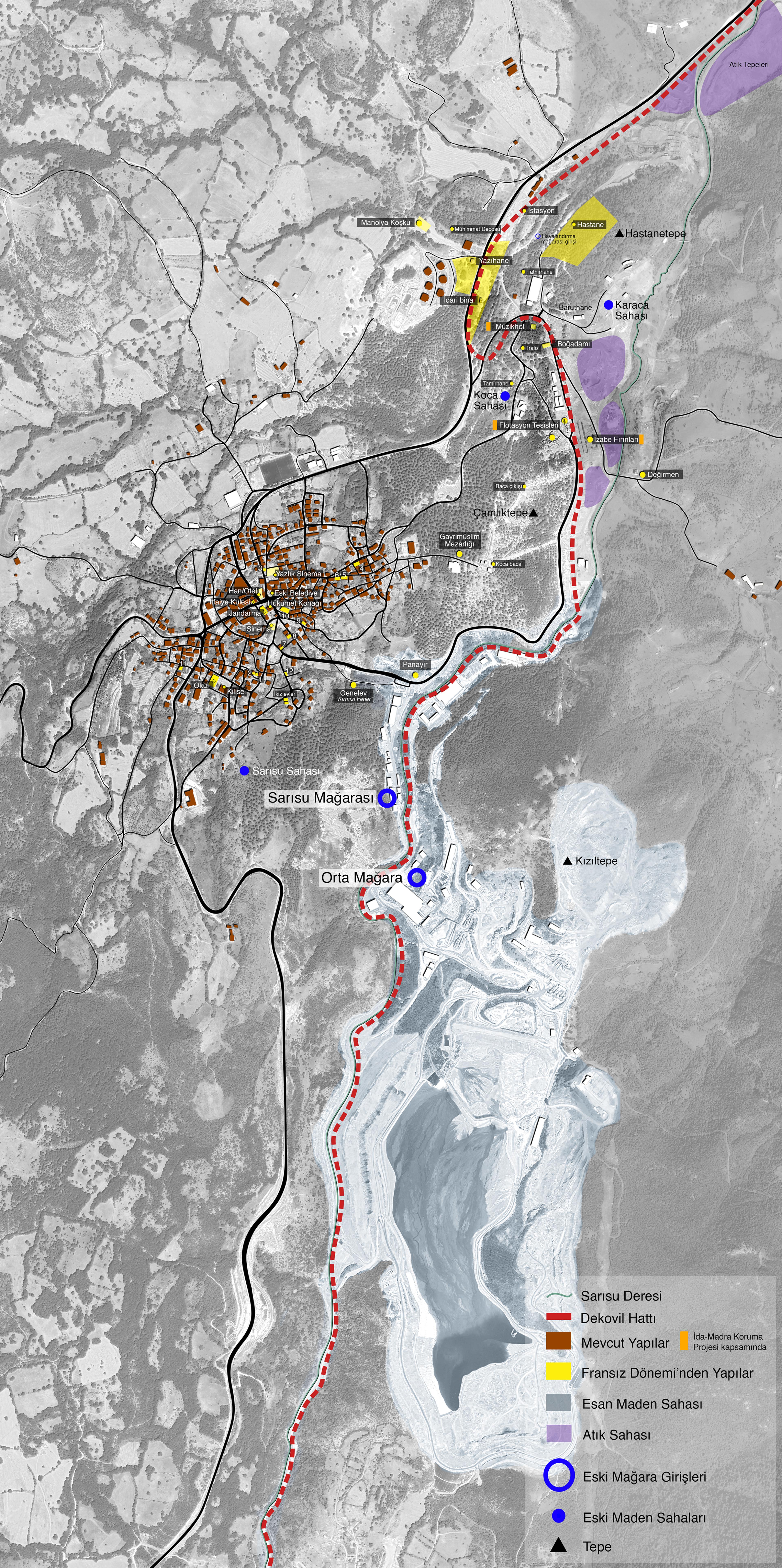 Bu nedenle araştırma sürecinde elde edilen bulgular aracılığıyla Balya'da coğrafyaya, doğaya ve kültüre yapılan müdahaleleri sorgulamanın yolları üzerine düşünürken, kent hafızasına dair yapabileceklerimize de odaklandık. Fransız döneminden kalan harita ve planlar, dönem yapılarından kalanlar (atıl durumdaki binalar, içinde kullanılan eşya ve araçlar), arşiv fotoğrafları, sözlü anlatılar ve bugünkü durum üzerinden biçimsel bir karşılaştırma yaparak Fransız dönemi ile günümüz arasındaki mekânsal kopuşları tespit etmeye çalıştık. Balya'nın kentsel ve mekânsal hafızasına yapılan müdahalelerin yarattığı tahribatı ortaya koymayı amaçladık. Hava fotoğrafını baz alarak yaptığımız haritalama çalışması ile Balya'nın kentsel hafızasına dair bulguları grafiklerle işaretledik. Böylece "Balya'nın Hafızası" adını verdiğimiz haritalama çalışması ortaya çıktı.
