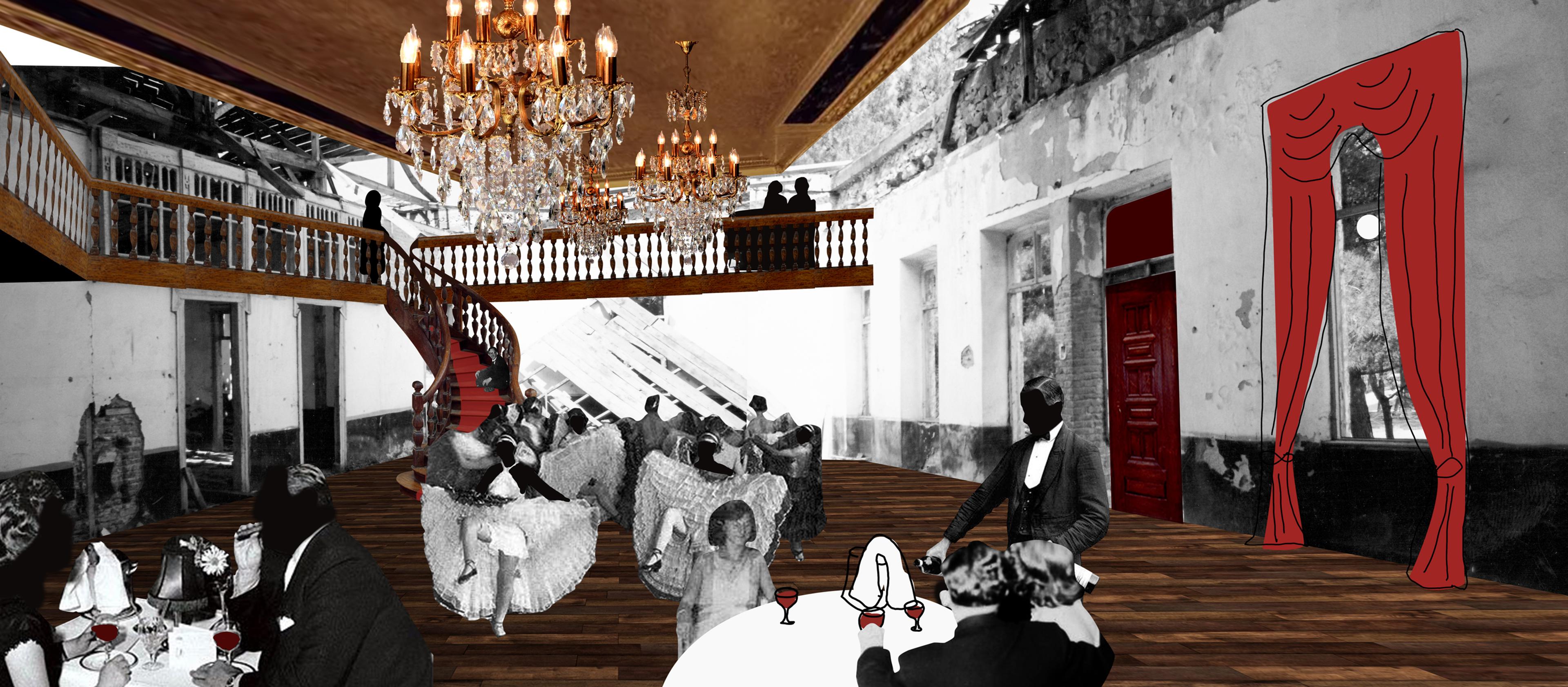 Müzikhol binasını resmeden bir kolaj çalışması, 2023 (Salt Araştırma Fonları projesi kapsamında Suzan Pektaş ve Öykü Önal tarafından üretilmiştir)
