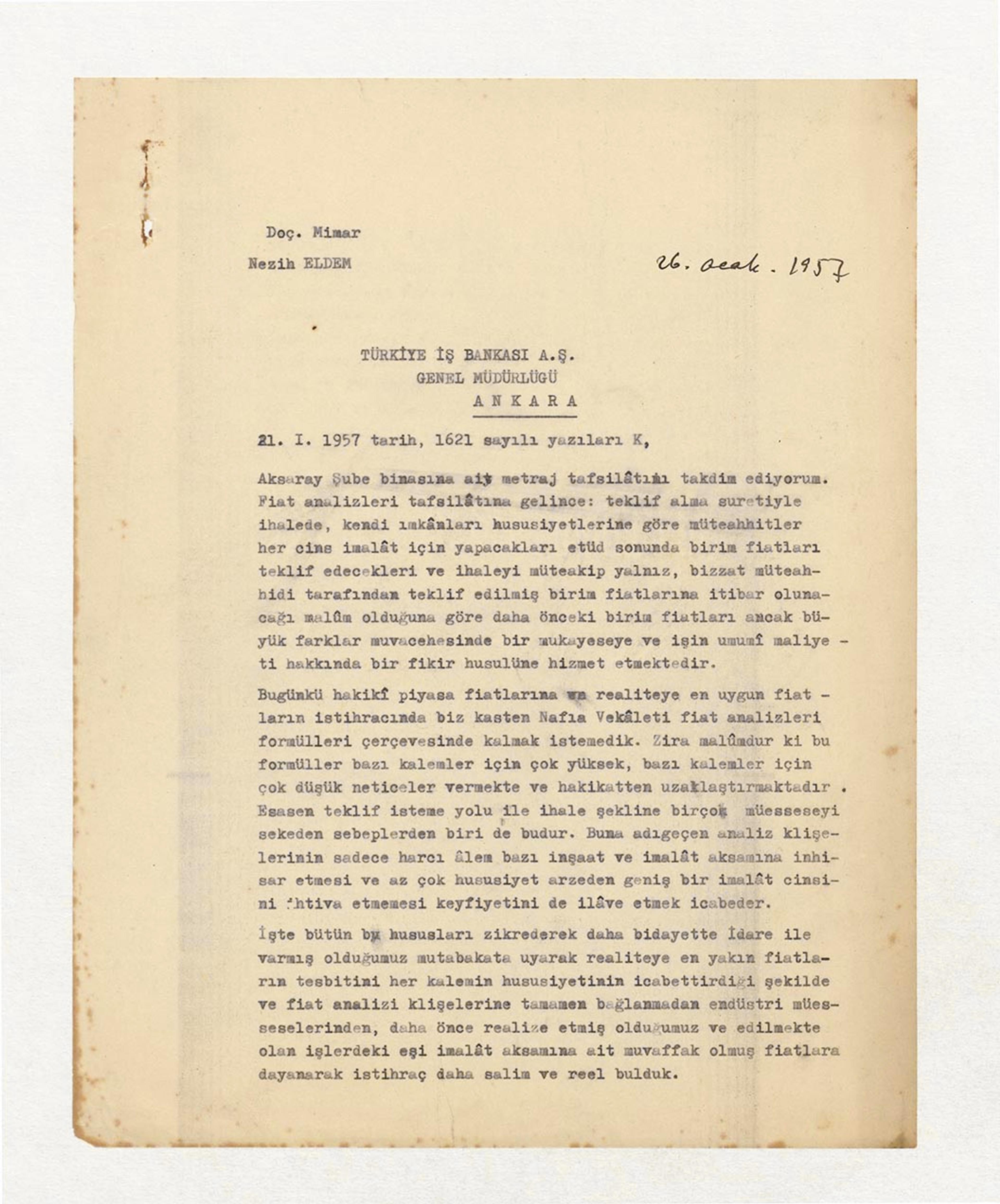 Son olarak, Nezih Eldem Arşivi'nde mimarın TİB ile yazışmaları, mektupların eksik olması ve bu yazışmaların bize tek taraflı bir anlatı sunması hakkında bir düşüncemi paylaşarak bitirmek isterim. Mimar arşivlerinin çoğu zaman pafta ve çizim açısından zengin, evrak ve yazışma açısından aynı derecede fakir olduğu malumunuz. Bu sebeple mimar arşivlerinde bulunan her yazılı evrak büyük önem kazanıyor. Örnek olarak, Eldem'in TİB Aksaray Ajansı ve Apartmanı projesi kapsamındaki yazışmalar belki tek başına anlam kazanmasa da ihmal edilmiş / incelenmemiş / erişime açılmamış benzeri dokümanların toplamının bir gün Nezih Eldem'in iş yapma biçimi, TİB'in inşai faaliyeti veya 1950'ler mimarlık ve inşaat piyasasının çok aktörlü ortamı gibi konular hakkında önemli bilgiler sağlayacaktır.