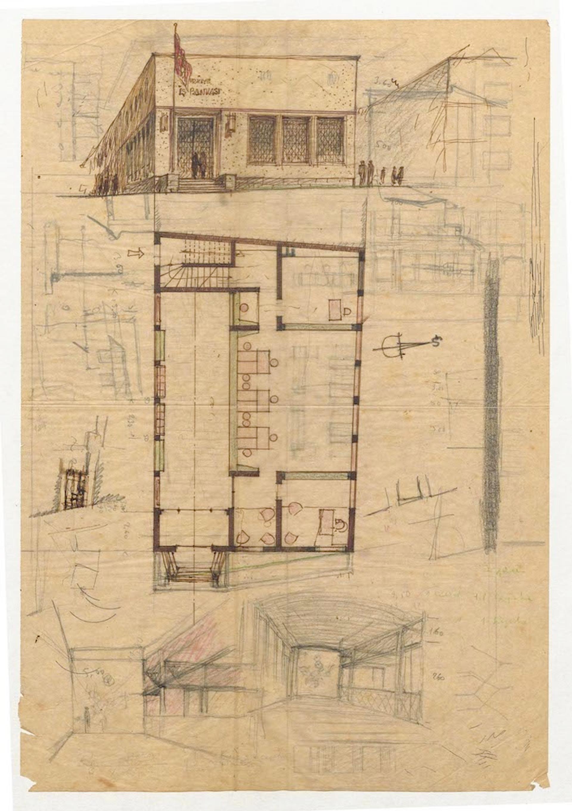 Eldem'in bir kısmını (muhtemelen) vaziyet planı krokisi ve perspetkif etüdü için kullandığı, diğer kısmınaysa bir grup önemli İtalyan mimarın ismini yazdığı pafta dikkati çekiyor. Bu isimler, belki de "Modern Mimari ve İtalya" başlıklı doçentlik tezi için görüşeceği mimarların isimleriydi: