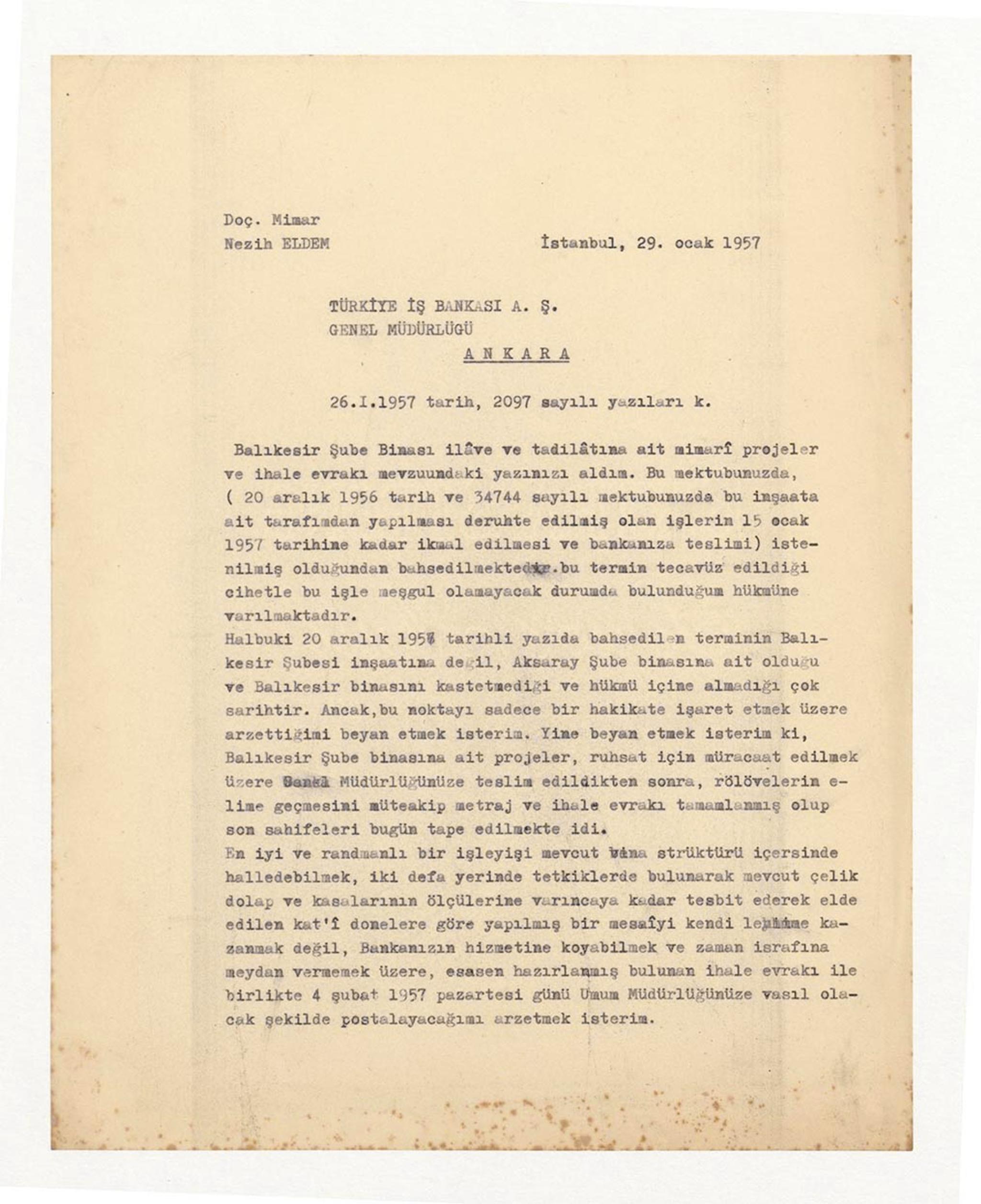 Nezih Eldem'in arşivinde TİB için hazırladığı son projesi Balıkesir Şubesi. İlk defa 15 Mayıs 1928 tarihinde açılan Balıkesir Şubesi'nin ilâve ve tadilâtı projesi işini Eldem muhtemelen 1956 yılı sonunda doğru aldı. Bu proje, ihtilaflı bir proje gibi görünüyor ve mimarın TİB için hazırladığı son proje olması bu bakımdan anlam kazanıyor. 26 Ocak 1957'de bankaya mektubunda Eldem, kendisine banka tarafından 20 Aralık 1957 tarihinde gönderilen 34744 sayılı mektuptan bahsediyor. Eldem'den öğrendiğimize göre banka, mimara "bu inşaata ait tarafından yapılması deruhte edilmiş olan işlerin" tamamlanması için 15 Ocak 1957 tarihine kadar süre veriyor. Bu sürenin aşılması sonucunda ise TİB, Eldem'in "bu işle meşgul olamayacak durumda bulunduğu" hükmüne varıyor ve (belki de biraz dramatik bir tepki vererek) anlaşmayı tek taraflı feshediyor. Eldem'in itirazıysa, bahsi geçen teslim tarihinin Aksaray Şubesi'ne ait olduğu ve Balıkesir Şubesi'ni kapsamadığı şeklinde. Ayrıca projenin tamamlandığını ve evrakların son sayfalarının o gün (26 Ocak 1957) yazılmakta olduğunu bildiriyor. Projenin oldukça detaylı hazırlandığını, Balıkesir'deki mevcut binayı iki defa yerinde incelediğini de söyleyerek evrakların 4 Şubat'ta bankanın eline ulaşacağının sözünü veriyor. Eldem'in projesinin kabul edilip edilmediğini bilmiyoruz, 34744 sayılı mektup da elimizde olmadığından bankanın perspektifini de okuyamıyoruz ancak projenin basit bir anlaşmazlık ve gecikmeden dolayı çöpe atılmış olması çok da olası görünmüyor. Bunların dışında Balıkesir Şubesi örneği, Eldem'in titizliğinin, özellikle İtalya sonrası bütüncül tasarım anlayışının ve bunlara bağlı olarak proje teslim sürelerini aşmasının, sonuç olarak da işverenleriyle kurduğu gerilimli ilişkinin güzel bir örneği olarak görülebilir.