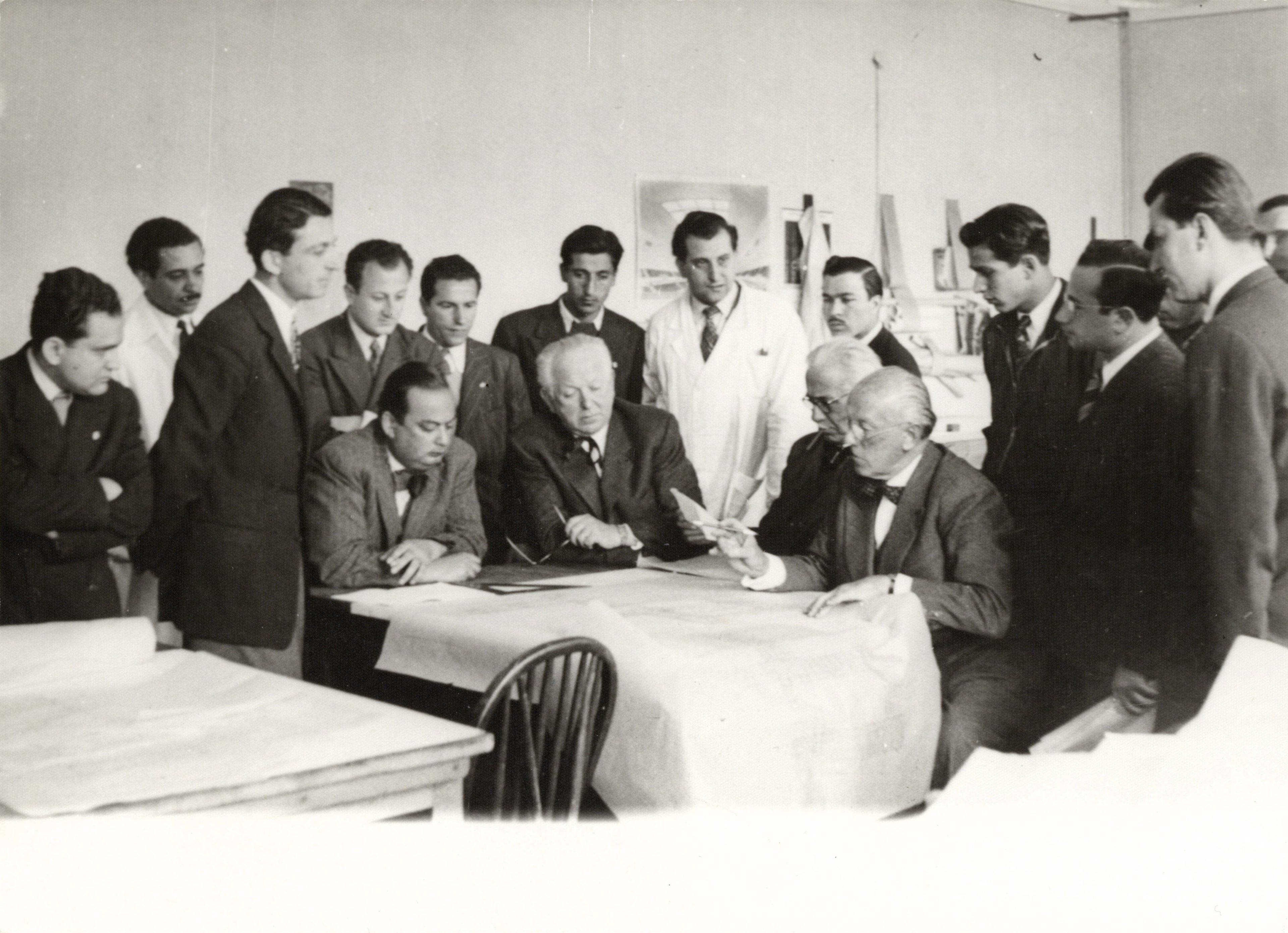 Emin Halid Onat, Clemens Holzmeister, Friedrich Hess ve Paul Bonatz, İstanbul Teknik Üniversitesi Gümüşsuyu Kampüsü’nde öğrenci projelerine tashih verirken, 1948