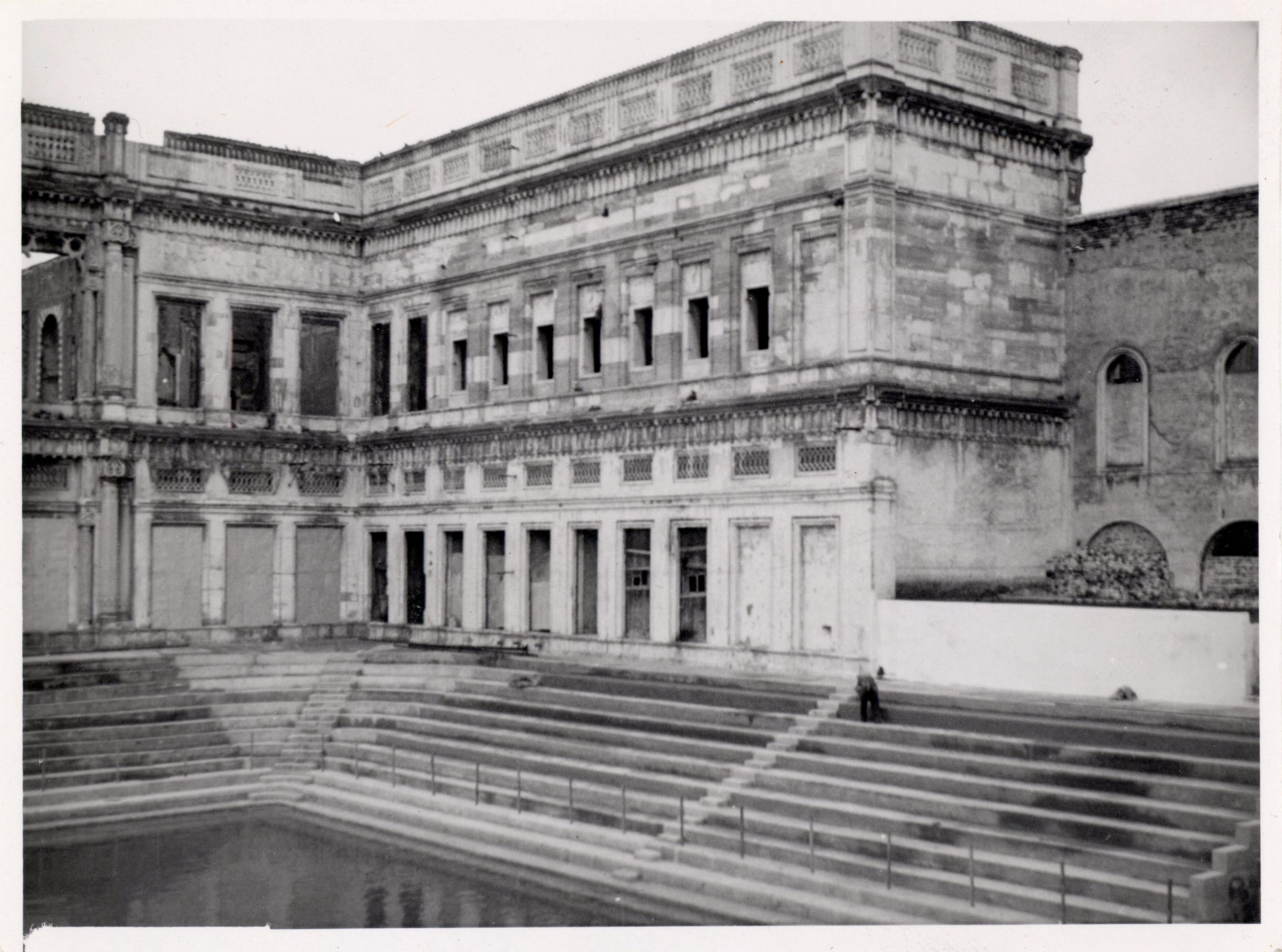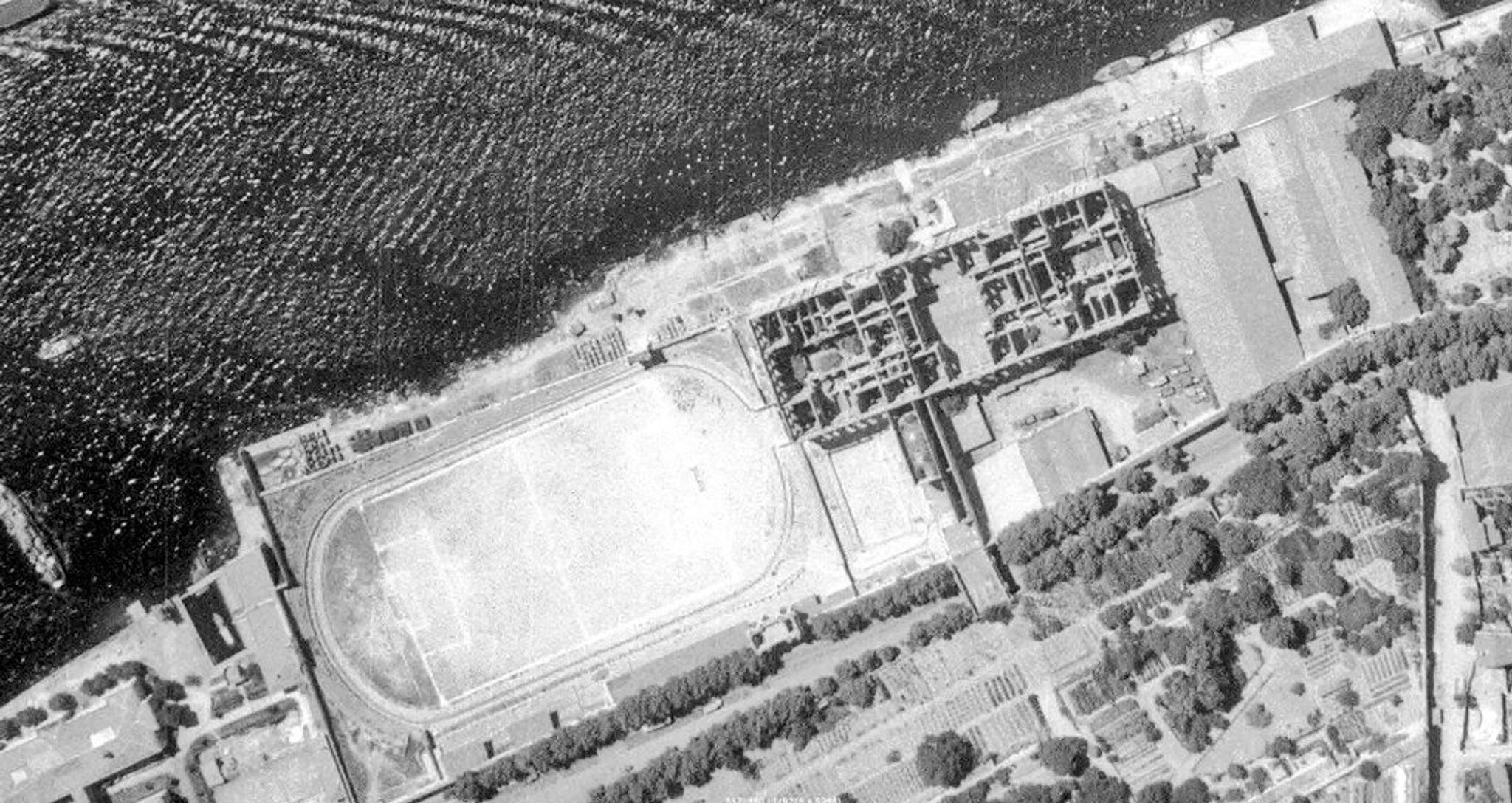Çırağan Sarayı’nın dış duvarları ile Şeref Stadı Havuzu’nun boş hâlini ve çevresindeki tribünleri gösteren bir fotoğraf