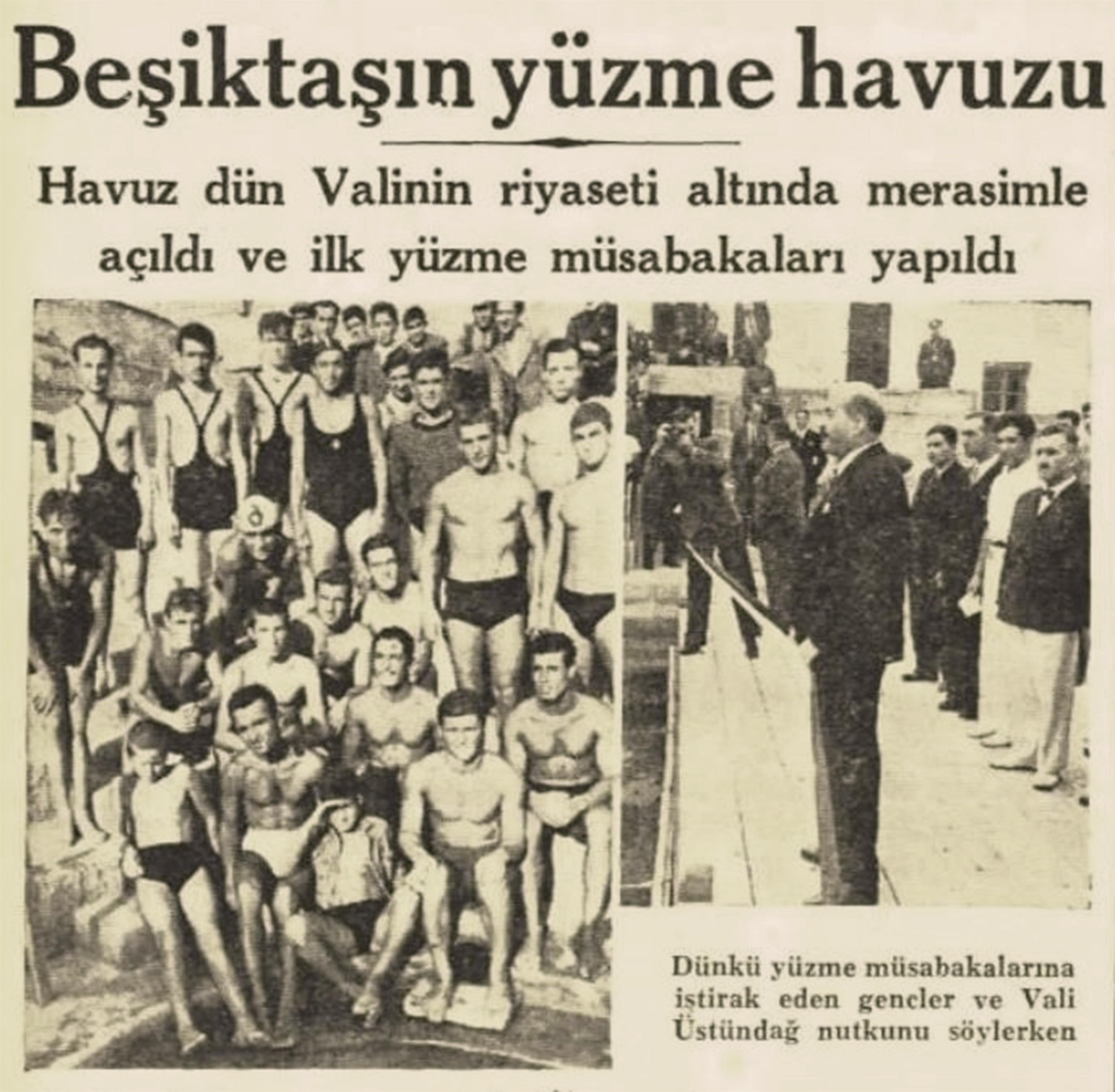 Şeref Stadı Havuzu’nun İstanbul Valisi ve Belediye Başkanı Muhittin Üstündağ’ın da katıldığı törenle hizmete girdiğini ve ilk müsabakaların yapıldığını bildiren bir gazete kupürü, Cumhuriyet, 3 Ekim 1937