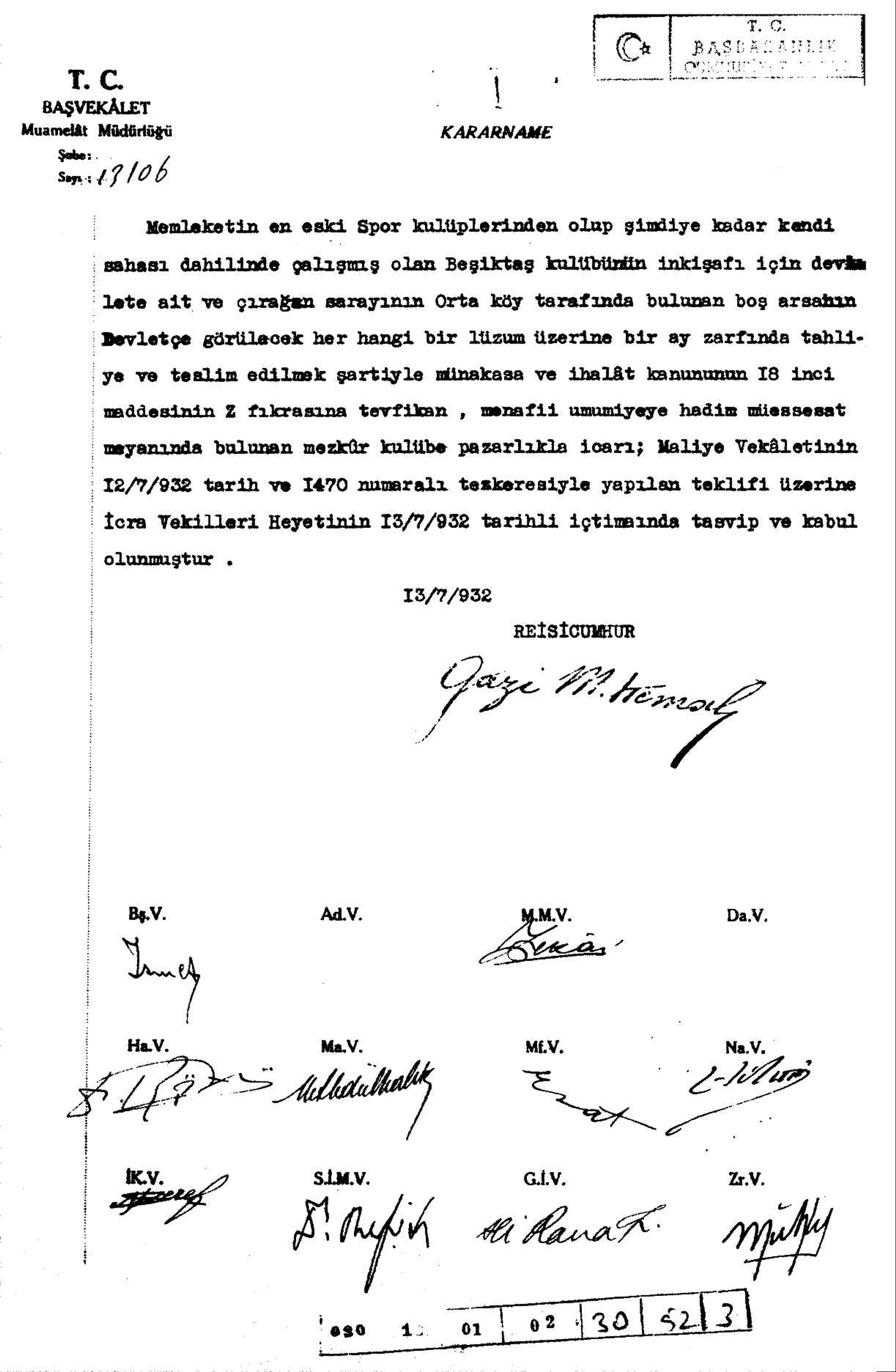Çırağan Sarayı’nın metruk bahçesinin bir stat inşa edilip sportif amaçla kullanılması için Beşiktaş JK’ya kiralandığını bildiren 13 Temmuz 1932 tarihli Bakanlar Kurulu Kararı