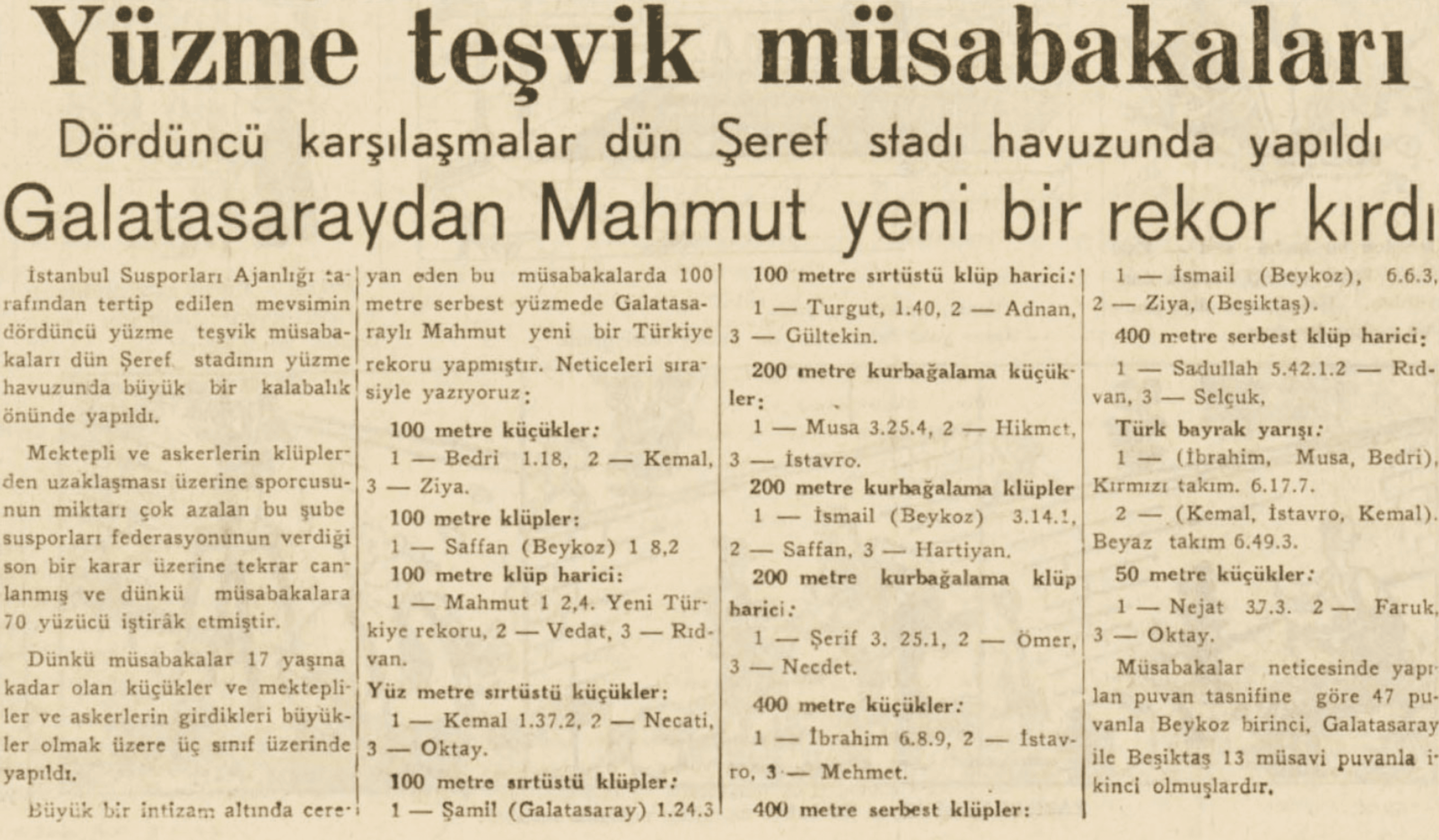 1939 yazında Şeref Stadı Havuzu’nda düzenlenen yüzme teşvik müsabakalarının sonuçlarını içeren bir gazete kupürü, Haber, 10 Temmuz 1939