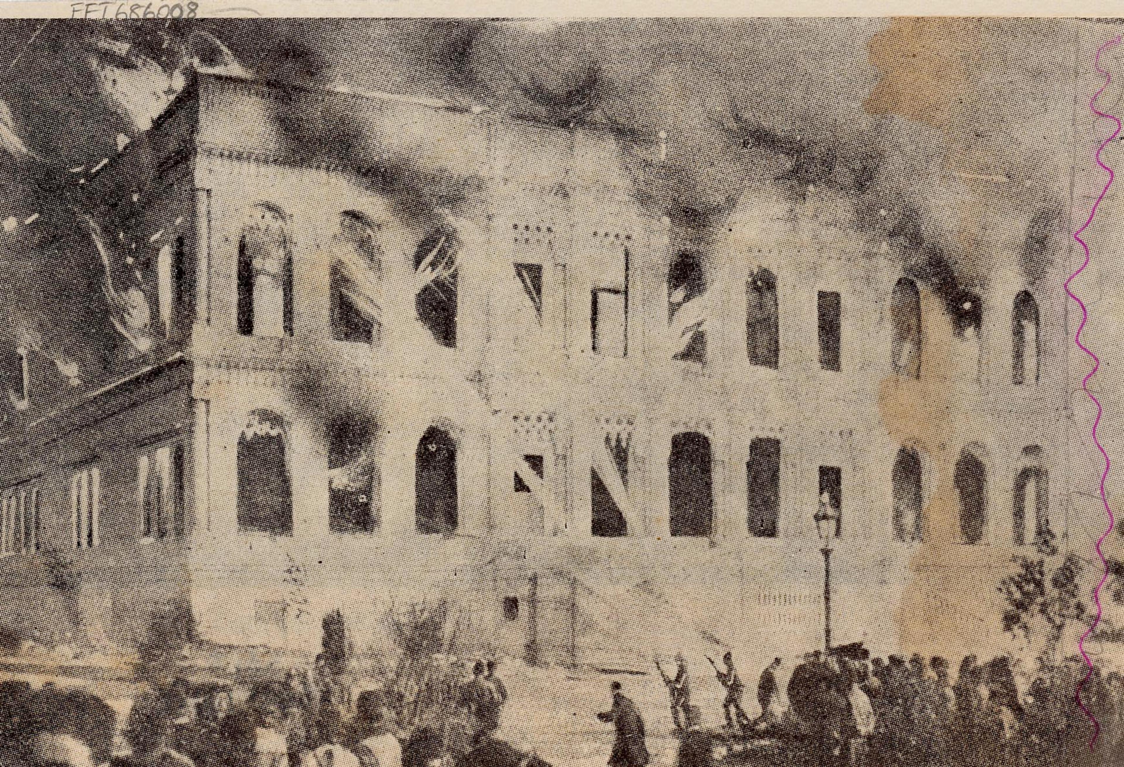 Sarayın çatısından yükselen alevleri ve yangını söndürme çabalarını gösteren “Çırağan Sarayı’nda yangın” başlıklı bir gazete kupüründeki resim, 1910