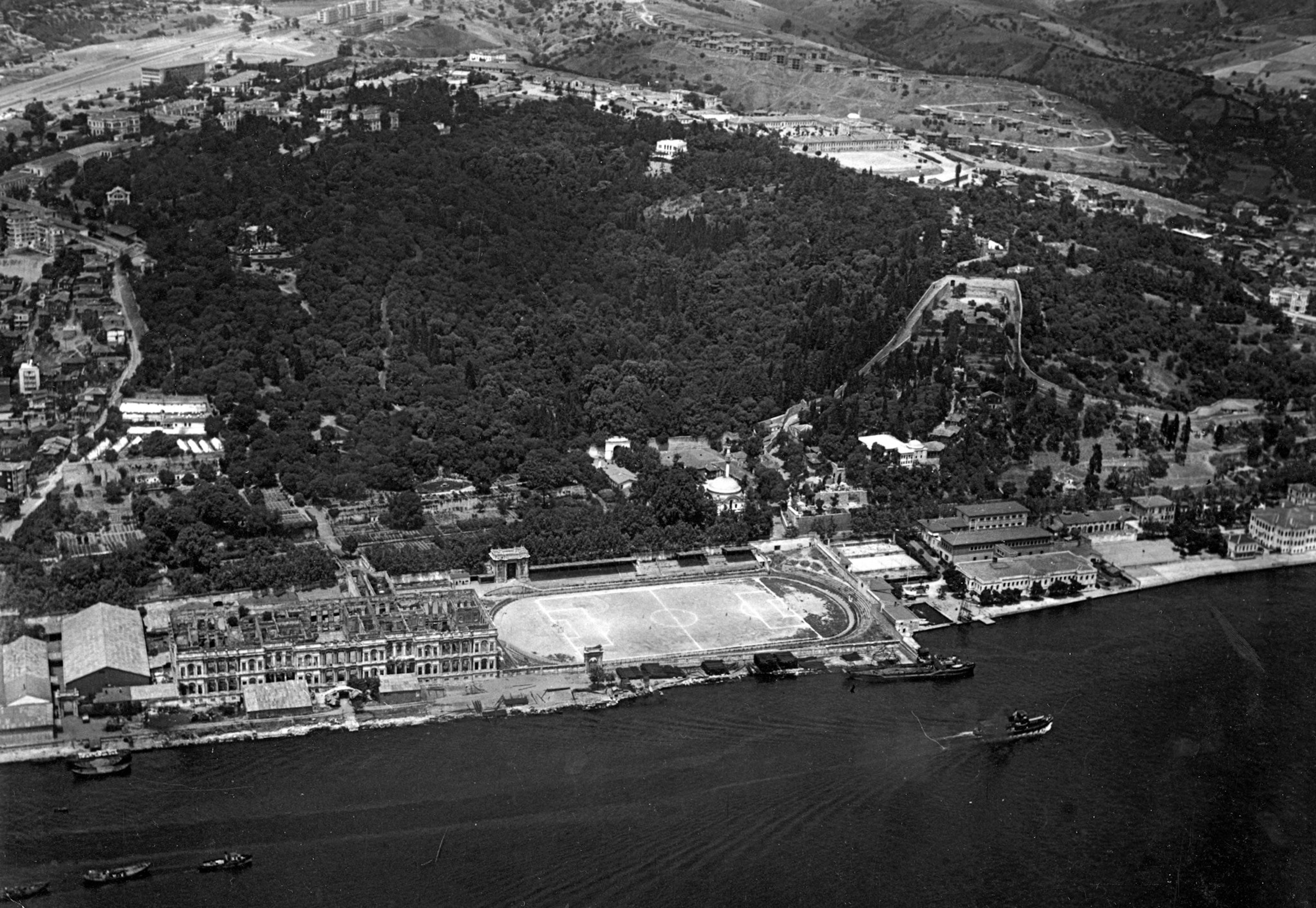 Şeref Stadı’nın yanındaki Çırağan Sarayı kalıntıları, sırtını yasladığı Yıldız Korusu, Yahya Efendi Mezarlığı ve deniz tarafındaki sahiliyle birlikte havadan görünümü