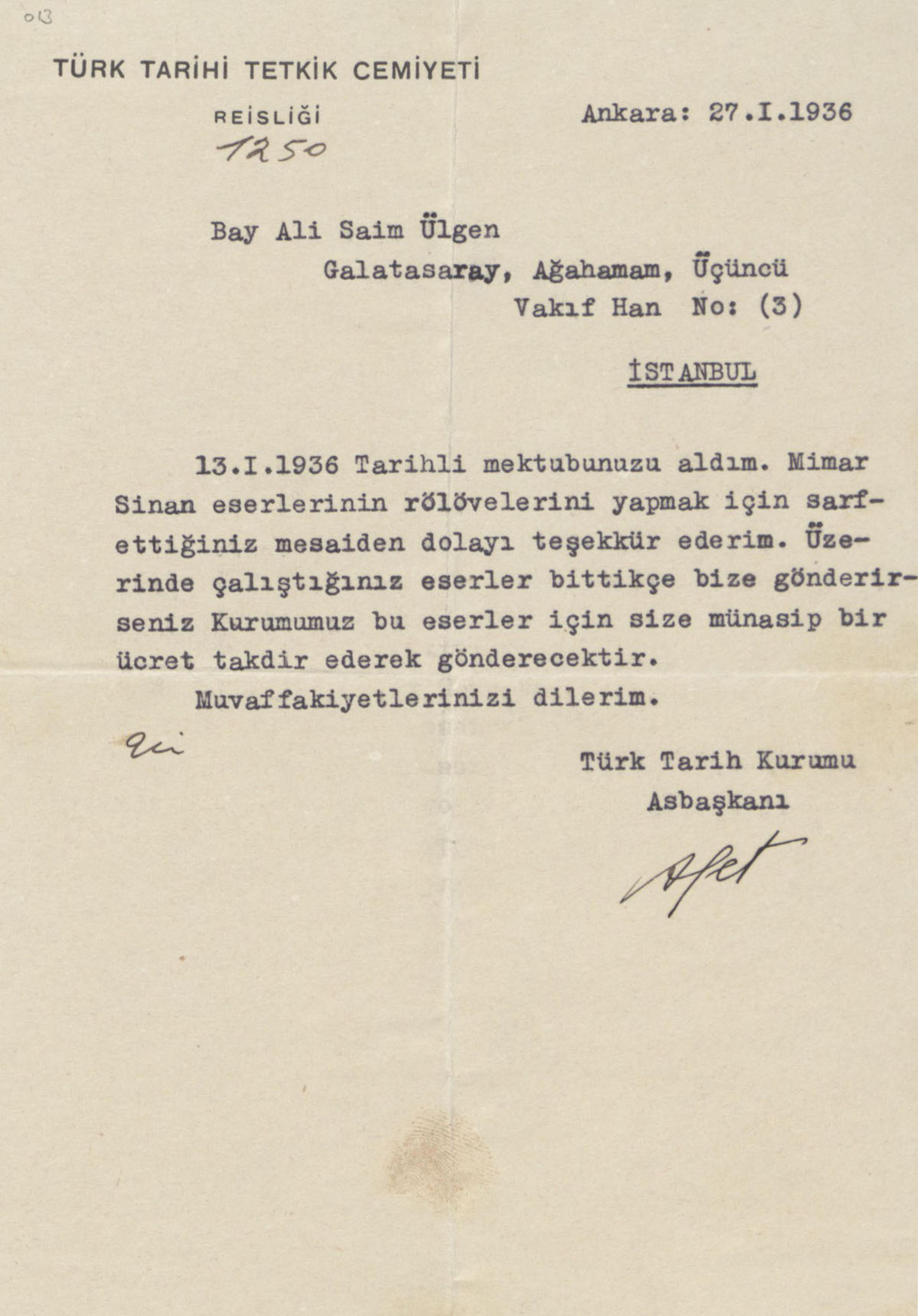 Fakat Ülgen özelinde bakılacak olursa, arşivde yer alan ve İğdemir imzalı 6 Temmuz 1935 tarihli bir davet yazısı,[18] Ülgen'in sonradan katılmadığını, başlangıcından itibaren projenin içinde olduğunu düşündürüyor. Nitekim, Ocak 1936'da Afet İnan'ın Sinan rölövelerine harcadığı mesai için Ülgen'e teşekkür eden ve rölöveler bittikçe kuruma gönderirse kendisine ödeme yapılacağını bildiren mektubu,[19] henüz mimarlık ikinci sınıf öğrencisi olan Ülgen'in projede profesyonel olarak yer aldığını da belgeler niteliktedir.