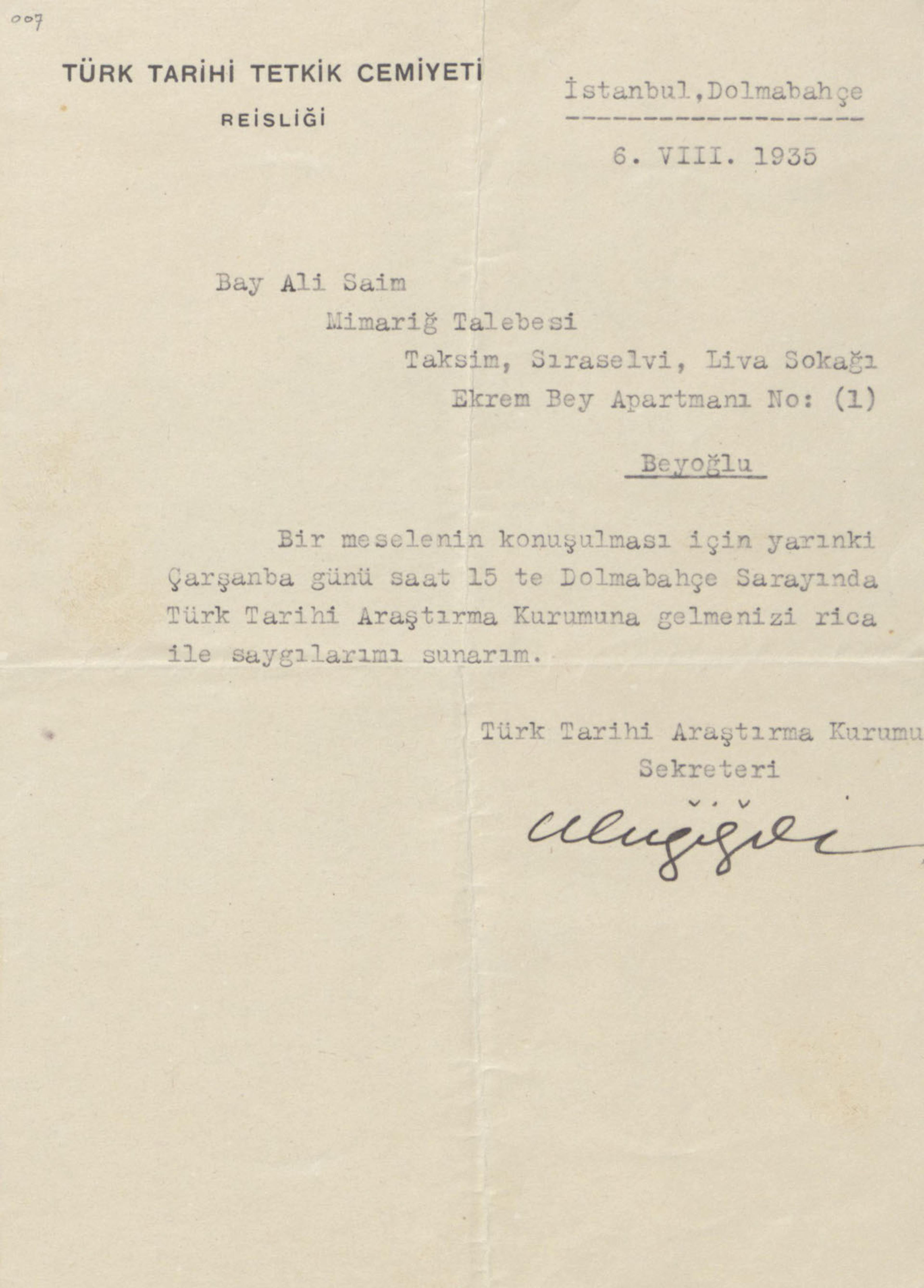 Türk Tarih Kurumu genel sekreteri Uluğ İğdemir’in Ali Saim Ülgen’i kurumun Dolmabahçe Sarayı’ndaki çalışma ofisine davet eden mektubu.