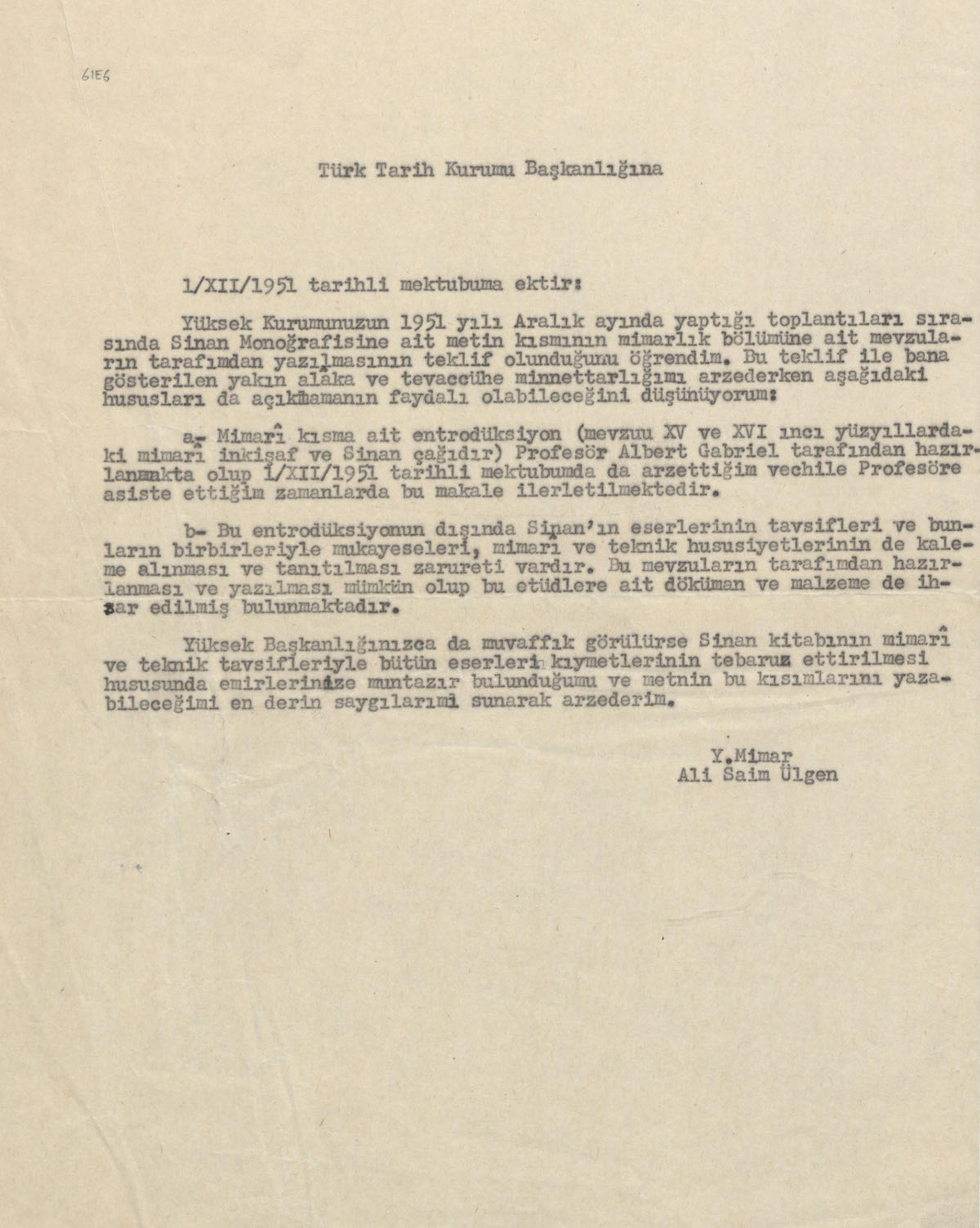 Sinan'la ilgili Ülgen arşivinde bulunan en kapsamlı metin Ernst Egli'nin Sinan: Osmanlı Altın Çağının Mimarı kitabının kısmi tercümesi.[43] Egli'nin İsviçre'ye dönmesini takiben 1943-44 yıllarında kaleme aldığı bu kitabın,[44] 1953-55 dönemine denk gelen ikinci Türkiye ziyaretinde fotoğraf ve revizyonlarının tamamlandığı ve burada tanıştığı yayıncı Eugen Renstch vasıtasıyla yayımlandığı anlaşılıyor. Kitap Sinan'ın yetiştiği dönemin toplumsal ve kurumsal yapısını anlatan bir giriş ve yaşamını detaylandıran bir bölüm ile işlevlerine göre düzenlenmiş yapılar kısmından oluşuyor. Bu kitaptan Ülgen'in tercüme ettiğiyse yapılara ilişkin olan kısım. Kullanılan dil metnin revize edilmemiş ve hayli ham bir tercüme olduğunu düşündürse de yazının tümünün çevrilmeye çalışılması ve fotoğraf referanslarının dahi hassasça aktarılması bu çalışma acaba bir yayın olmak üzere hazırlanmış olabilir mi sorusunu da akla getiriyor. Öte yandan Egli'nin, kitabın basımını takip eden yıllarda tercüme konusunun gündeme geldiğini ve Cevat Dursunoğlu'nun deneme mahiyetinde kısa bir bölüm üzerine çalıştığını belirtmesinin bu kanıyı güçlendirdiği de düşünülebilir.[45] Fakat bu teşebbüse dair herhangi bir somut veri bulun(a)maması ve yalnızca yapılar kısmı üzerine çalışıldığı dikkate alınırsa bu tercümenin Ülgen'in yazacağı bölüm için bir hazırlık çalışması olarak gerçekleştirilmiş olabileceğini varsaymak daha makul görünüyor.