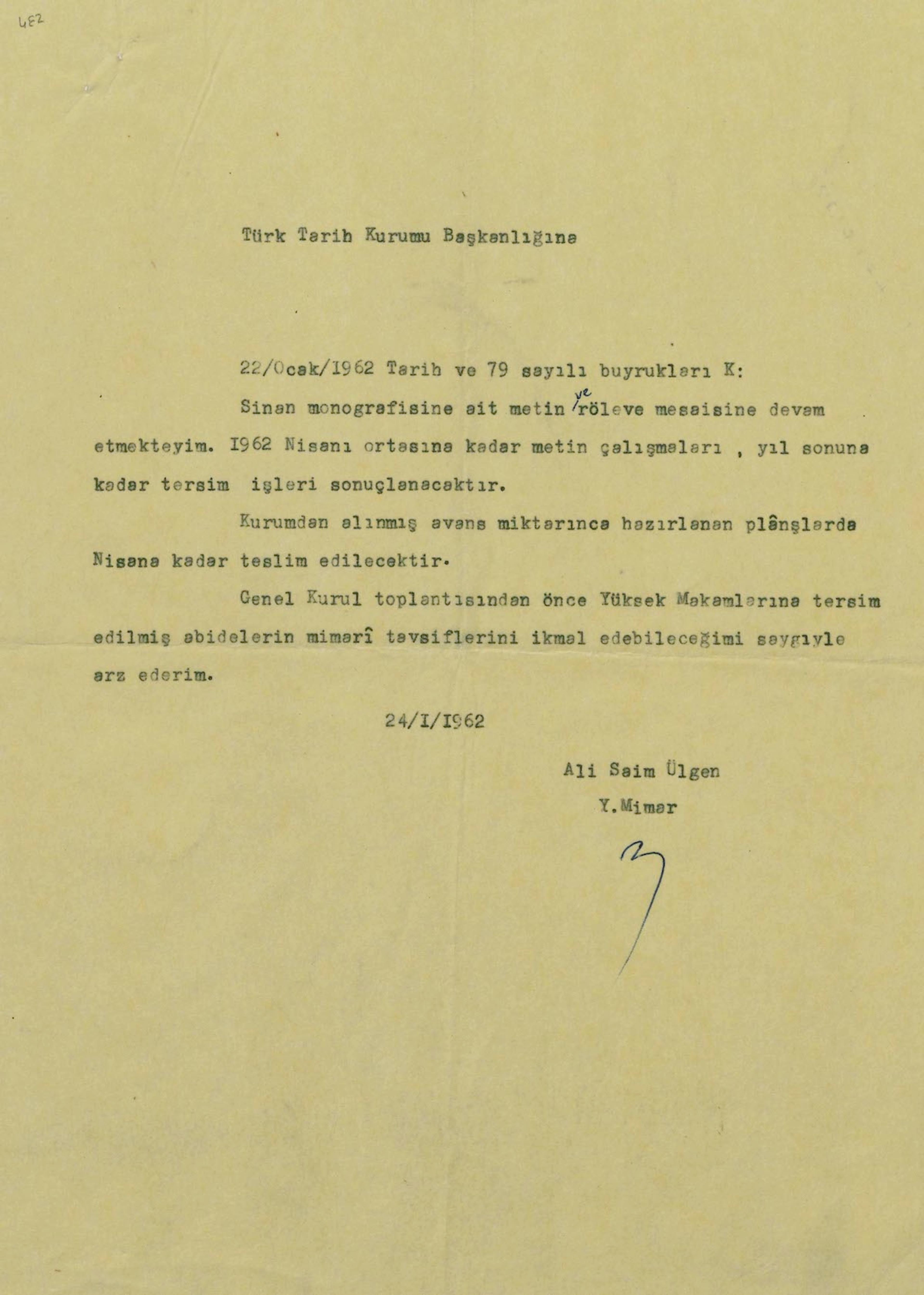 1962'ye gelindiğinde Türk Tarih Kurumu'nun Sinan monografisini yıl sonuna kadar tamamlama kararı aldığı; Ülgen'in de yayının en önemli kısmı olan Sinan'ın yapıları ve bunların mimarlık bakımından değeri bölümünü yazmayı kabul etmiş olduğu anlaşılıyor.[38] Yazışmalardan Ülgen'in aynı yıl Nisan ortasına kadar metni, ilerleyen aylarda da çizimleri tamamlayacağını bildirdiğini öğreniyoruz.[39] Ancak, Nisan 1962'de Ülgen'in yine çizim teslim ettiğini, çizimlerin kalan bir kısmını Haziran'da, ölçülerini aldığı diğer bir kısım yeni planşı ise ilerleyen aylarda peyderpey teslim etmeyi planladığı görülüyor.[40] Metin üzerine herhangi bir çalışmadansa hiç bahis yok.