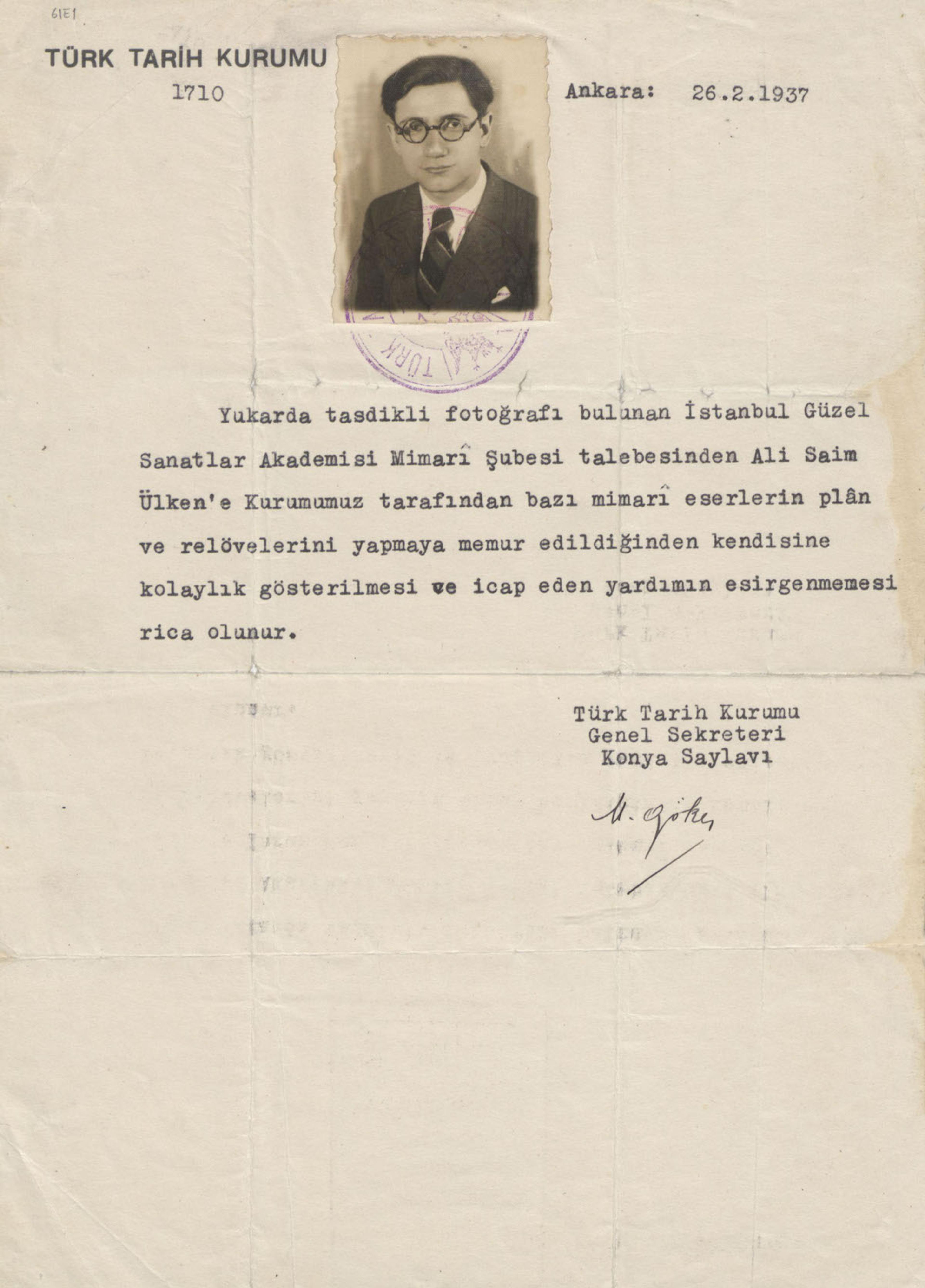 Türk Tarih Kurumu’nun, rölövesini hazırlamakla görevlendirildiği yapılarda Ali Saim Ülgen’e kolaylık gösterilmesi için hazırladığı belge.