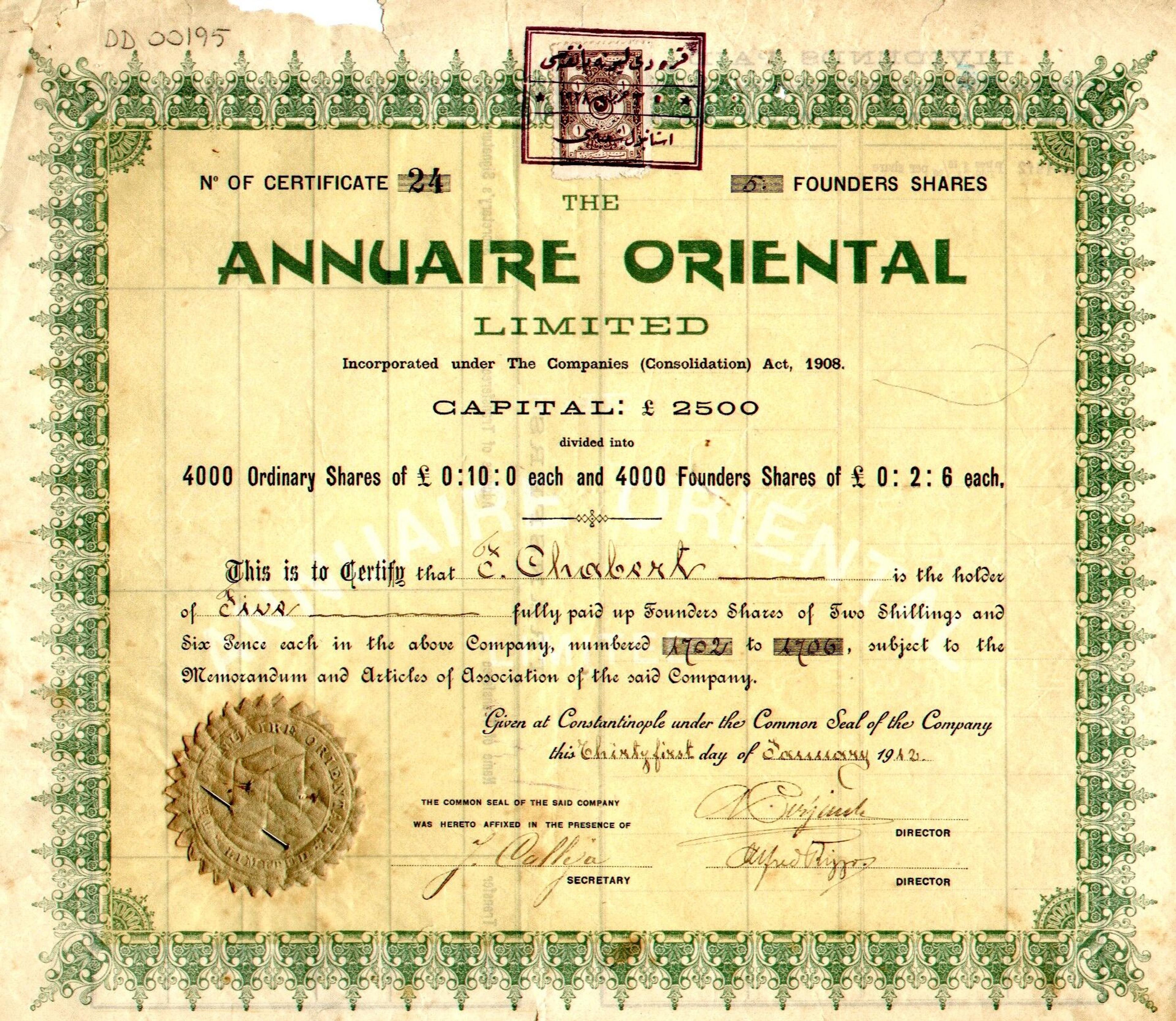 The Annuaire Oriental & Printing Company Limited’in (Annuaire Oriental Limited Şirketi) kurucu hisse senedi