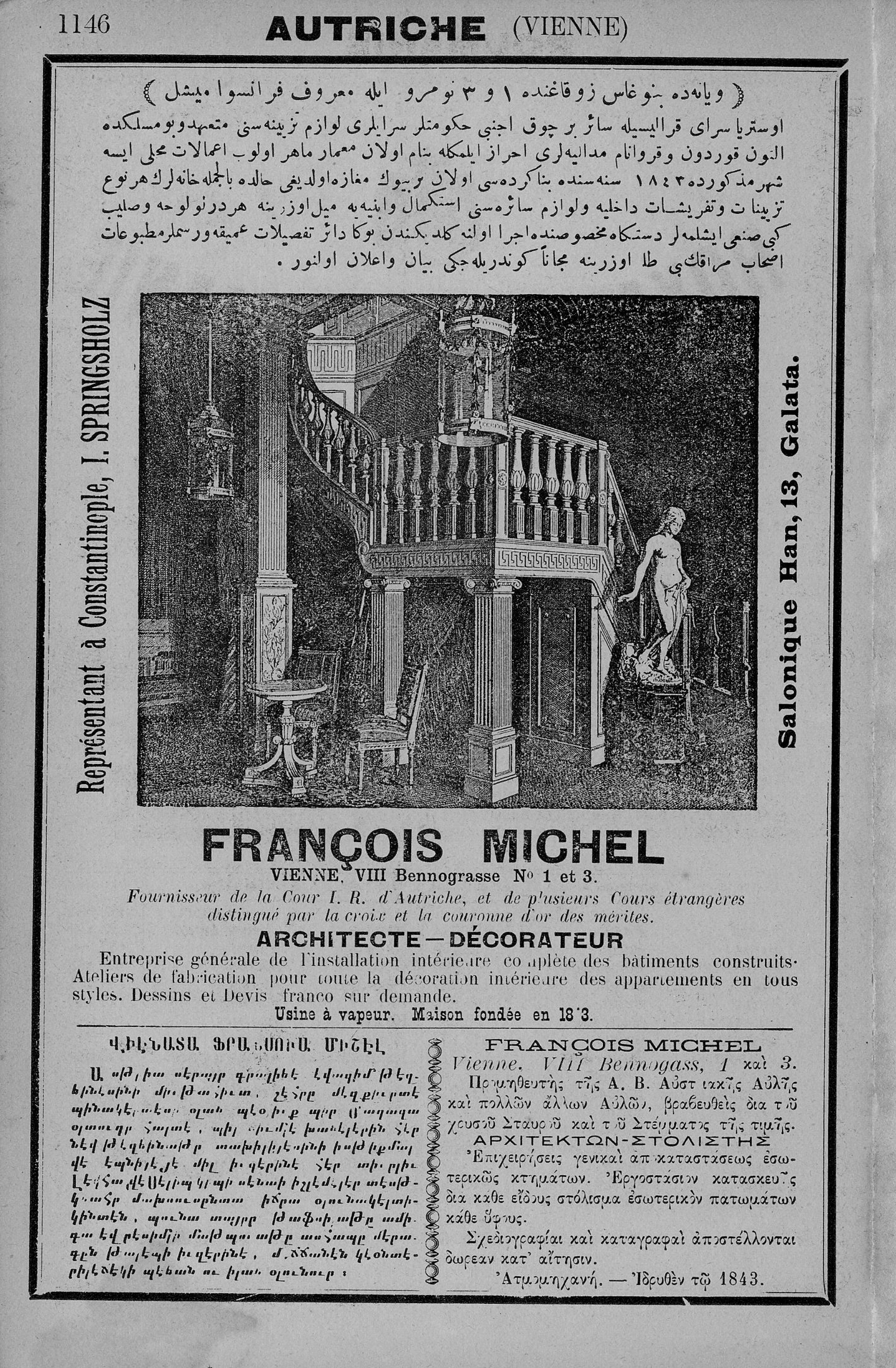 Mesleğini Viyana’da icra eden François Michel adındaki bir iç mimar reklamı. Reklamda, iç mekân tasarımı için 1843 yılında kurulmuş şirketin Avusturya İmparatorluk Sarayı ile pek çok yabancı sarayın tedarikçisi olduğuna vurgu yapılıyor. Daha geniş bir hedef kitleye ulaşmak için olsa gerek, reklam dört dilde; Osmanlıca, Fransızca, Ermeni harfleriyle Osmanlıca ve Rumca kurgulanmıştır. Reklamda Fransızcadan dilimize geçen “dekorasyon” kelimesinin Osmanlıca karşılığı olarak “tezyinat” kavramının kullanılmış olması dilsel antropoloji açısından dikkat çekicidir.