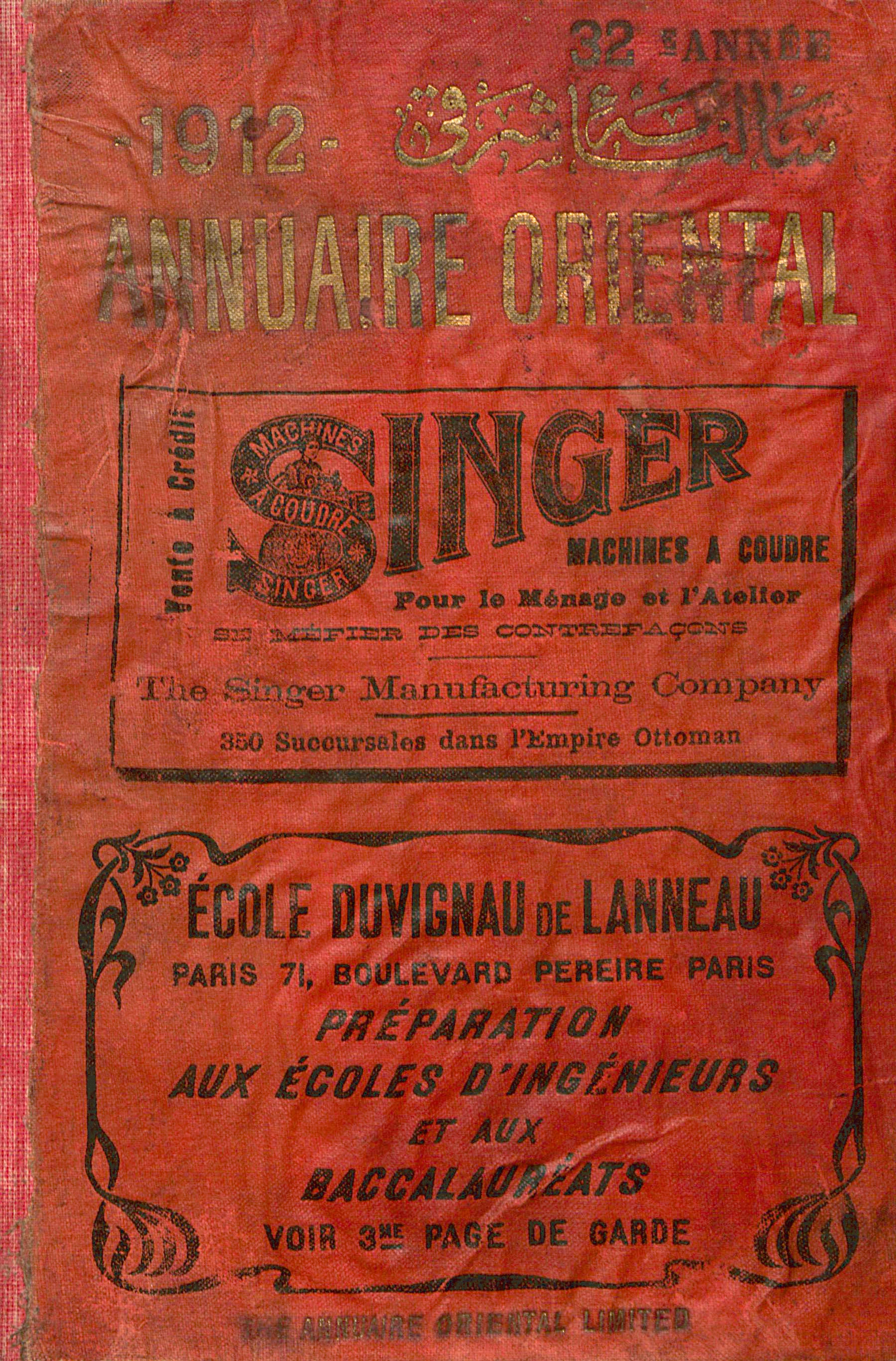 Osmanlı topraklarında 350 şubeye sahip Singer’in reklamını içeren 1912 tarihli Şark Ticaret Yıllığı’nın kapağı