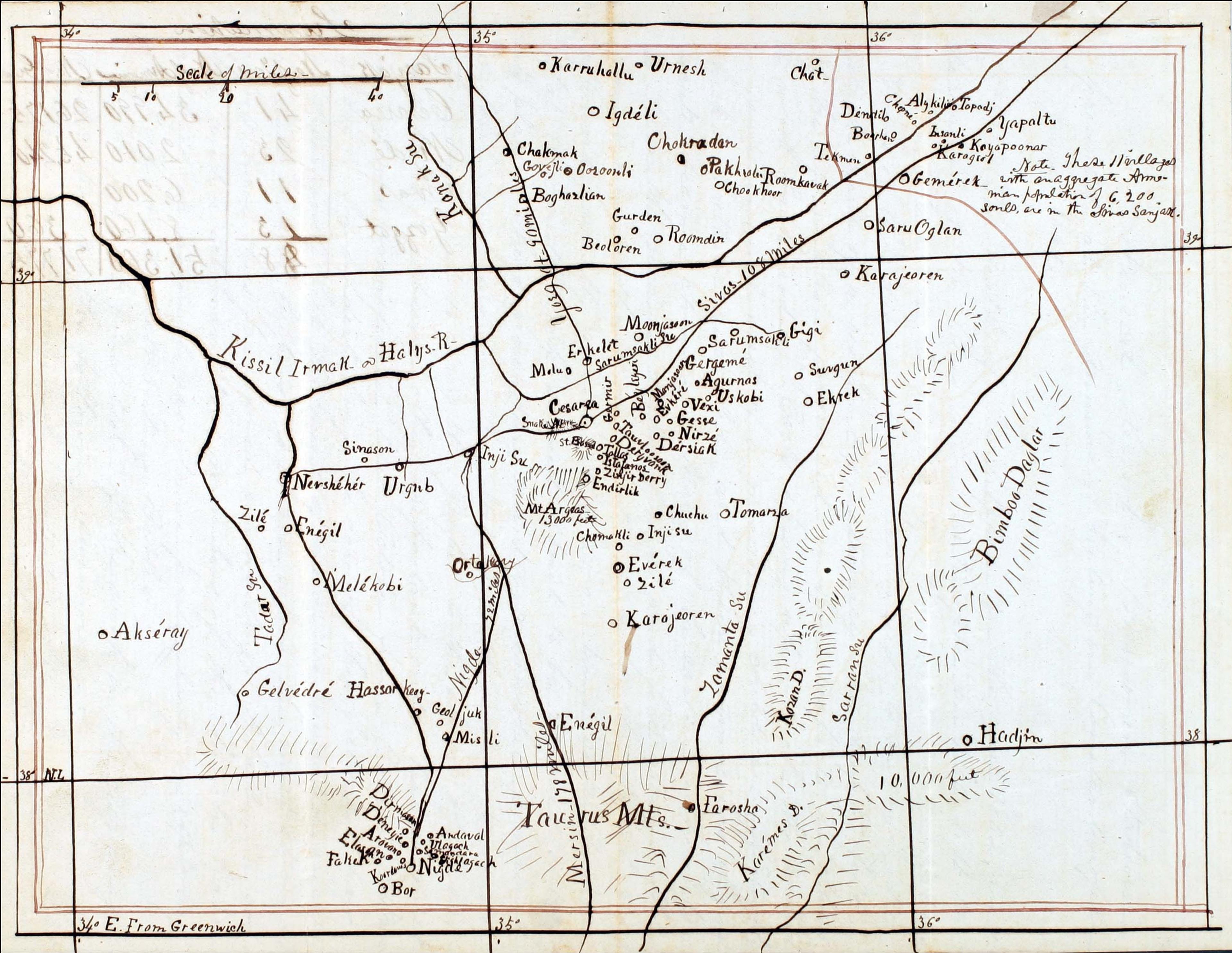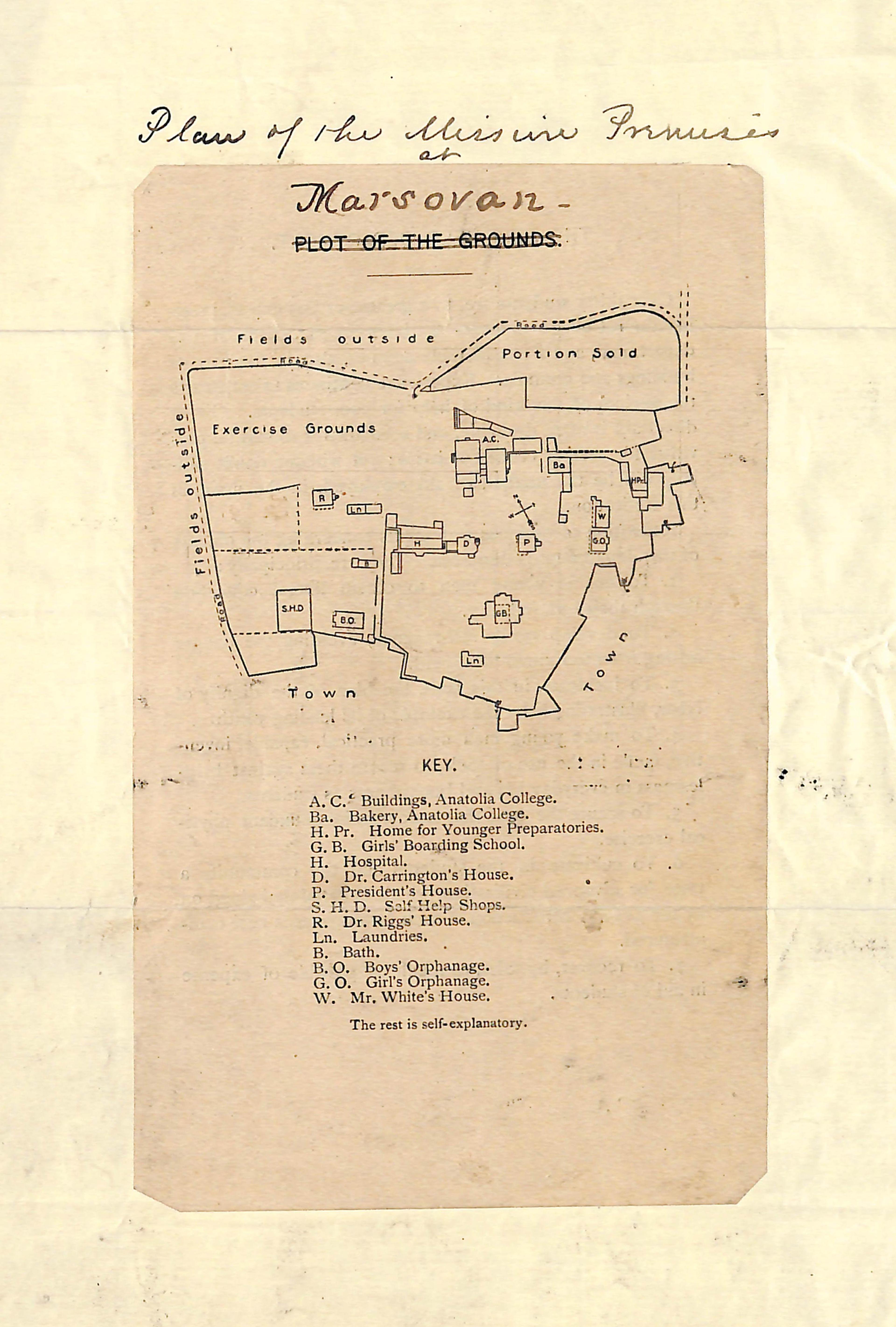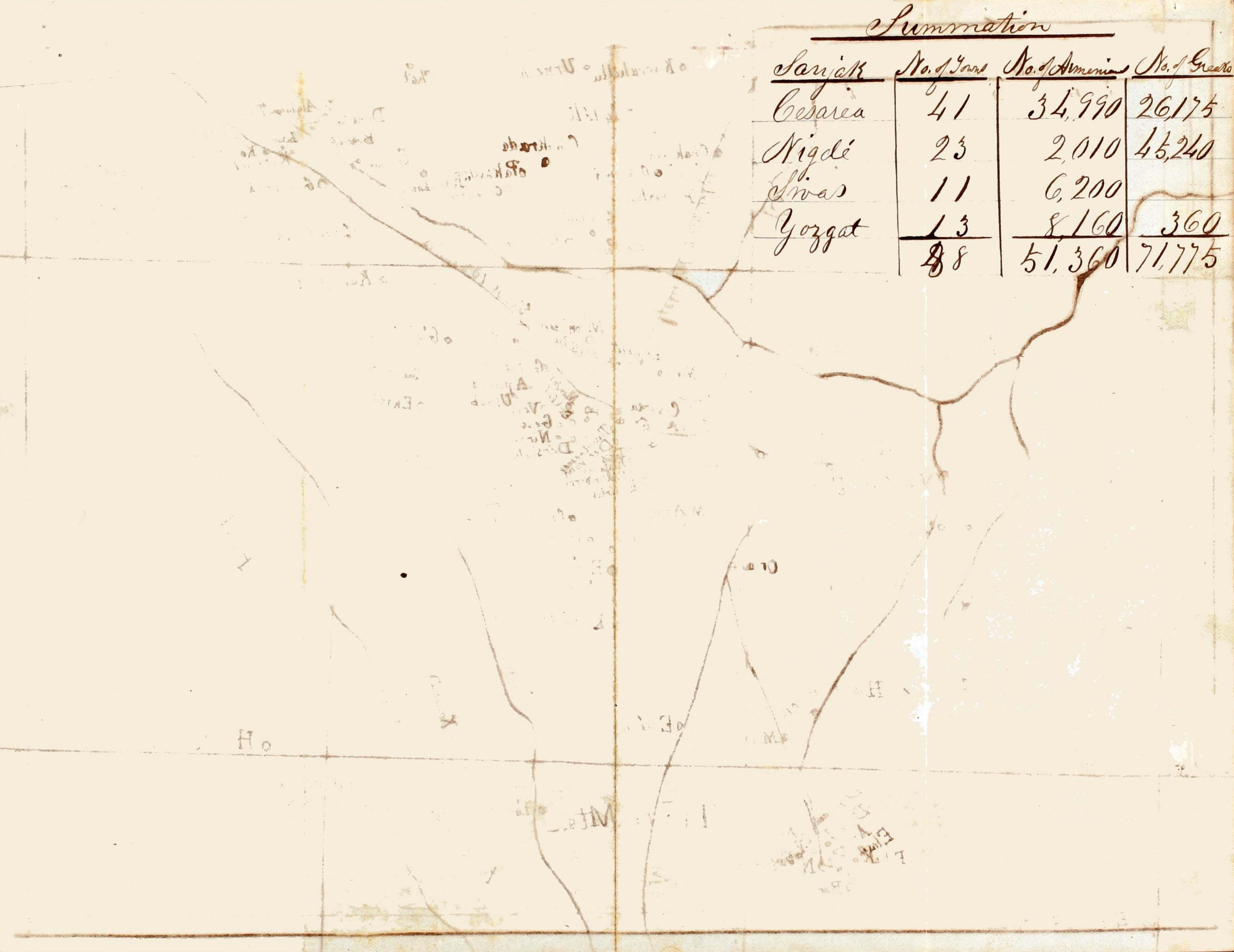 Hem misyonların gözettikleri etnik dağılım hem de kurguladıkları misyon kampüsünün çevresel ve yapısal niteliklerini daha detaylı tartışmak adına Merzifon Anadolu Koleji örneğine kısaca değinmekte fayda var. ABCFM'in Anadolu'daki en büyük misyon kuruluşlarından olan Marsovan (Merzifon) İstasyonu, 1924'e kadar Anadolu Koleji olarak faaliyet gösterir. Kuruluşu sırasında Julius Leonard'ın İstanbul'a gönderdiği bir raporda, Merzifon'un güneyinde kalan bölgeler temsil edilmiş; Kızılırmak dere yatağı, Toroslar ve Binboğa Dağları gibi coğrafi veriler, yerleşim isimleriyle birlikte el çizimi bir eskiz doğruluğunda gösterilmiştir (Görsel 3). Haritanın arkasında ise Kayseri (Cesarea), Niğde, Sivas, Yozgat sancaklarındaki yerleşim sayıları ile bu sancaklardaki toplam Ermeni ve Rum nüfusunu belirten bir tablo bulunmaktadır (Görsel 4). Bu tablo ışığında harita daha detaylı incelendiğinde, Bor veya Sinason gibi Rum ve Boğazlıyan, Everek, Tomarza gibi Ermeni nüfusunun yoğun olduğu yerleşimlerin haritaya işlendiği görülür. Merzifon haritaya dâhil olmamakla birlikte dağların, nehirlerin, yol mesafelerinin ve yerleşimlerin temsil edildiği bu haritayı bir kültürel coğrafya tahayyülü olarak okumak ve Merzifon İstasyonu'nun arka alan (hinterland) haritası olarak değerlendirmek mümkündür. Misyonun yalnızca Hristiyanların yoğun yaşadığı yerleşimlerle değil, buradaki toprak ve fiziki coğrafyayla da ilişkisi vardır.