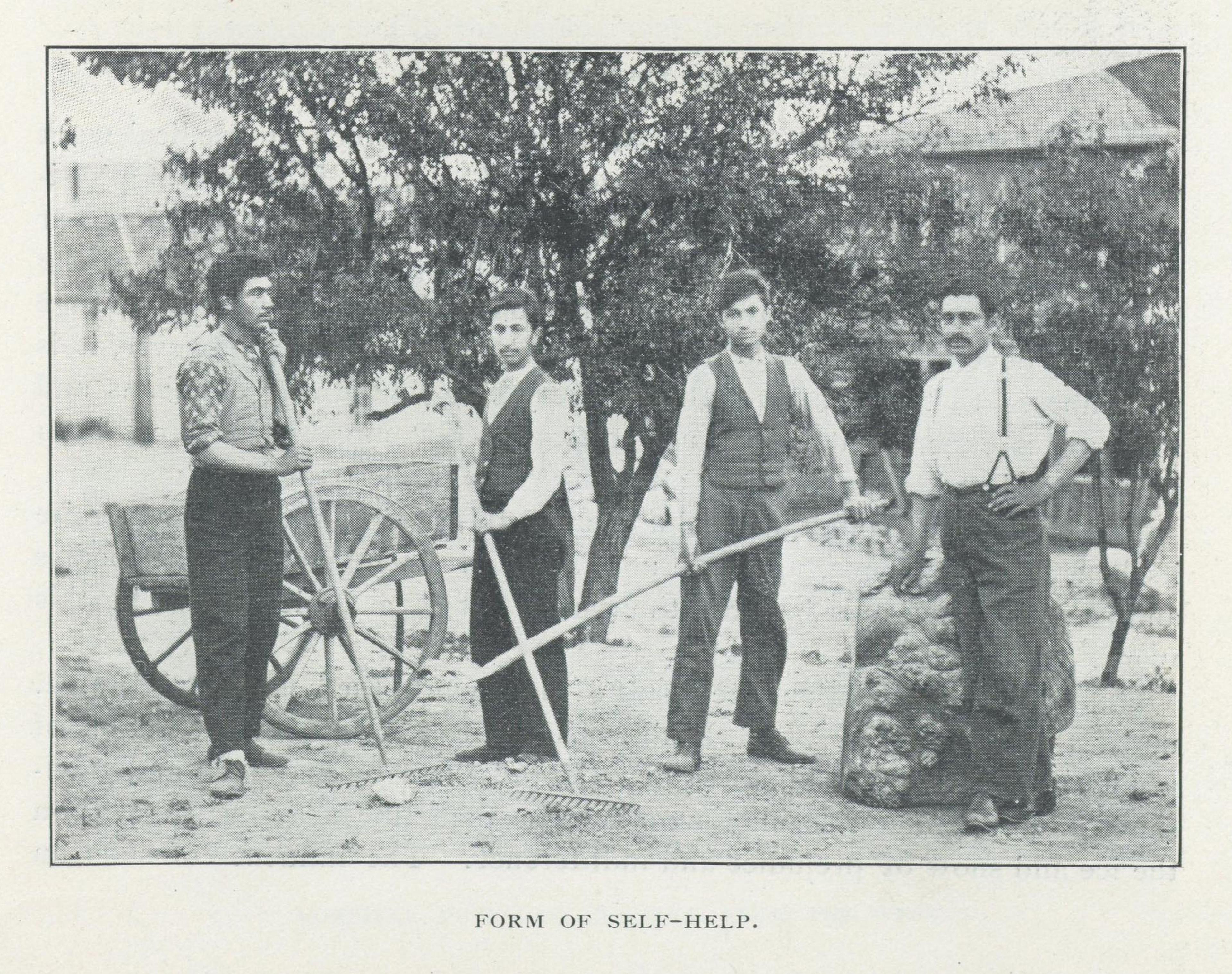 ABCFM tarafından yaygınlaştırılan misyon fotoğraflarında, öğrenciler çoğunlukla üretim esnasında görüntülenir. Görsel 6'da ziraat öğrendiklerini anladığımız öğrenciler ellerinde sapanla poz vermişlerdir. Aynı arşivdeki bir başka fotoğrafta ise atölye yürütücüsü L. Nerso ile birlikte mobilya üretimi yaptıklarını okuduğumuz "Endüstriyel Öz Yardım" Atölyesi görünmektedir. Öğrenciler üretim hâlinde ve disiplinler bir mekanizma içerisinde görüntülenmelerine karşın, ABCFM'nin buradaki üretimi çocuk emeğinden ziyade bir müttefik yaratma projesi olarak gördüğünü vurgulamak isterim. Öz yardım aynı zamanda ekonomik bir stratejidir; ABD'nin bölgedeki fiziki varlığını geri çektiği durumda dahi kendi kendisini sürdürebilecek bir sistem yaratmayı amaçladığını söylemek yanlış olmayacaktır.