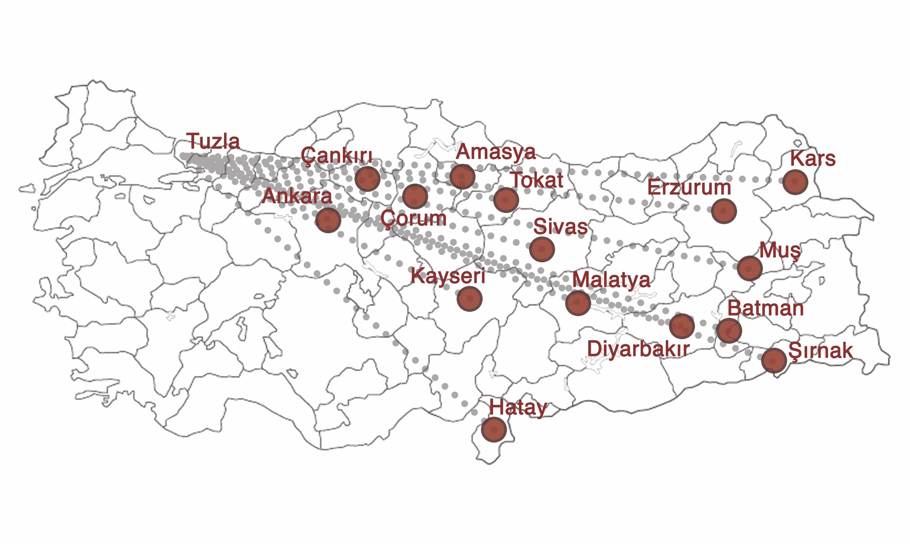 Hrant Güzelyan’ın Anadolu’ya yaptığı geziler (veriler kendi otobiyografik kitabı Kamp Armen’e Giden Yol: Artakalanların Hikâyesi’nden alınmış, harita yazar tarafından hazırlanmıştır)