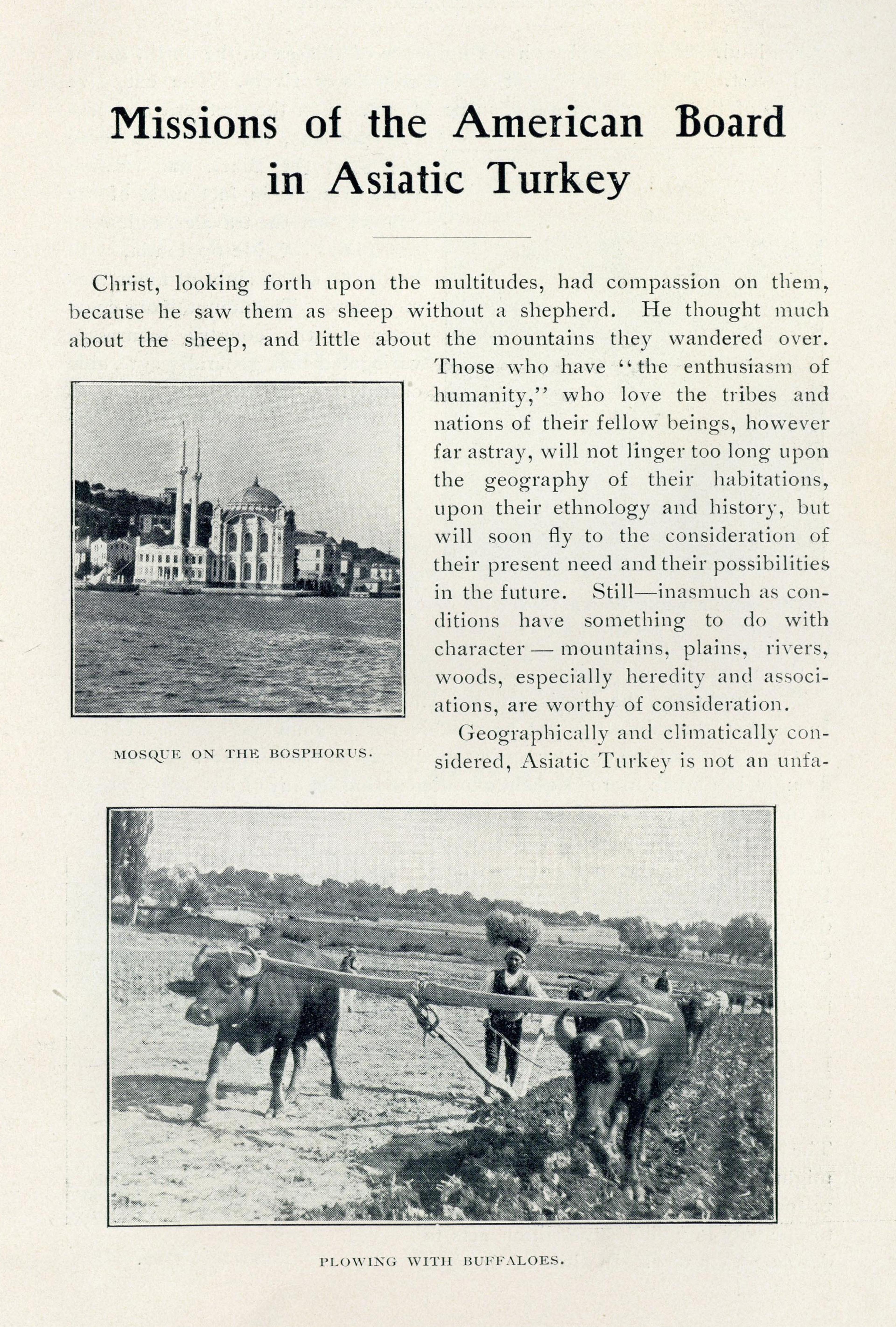 Osmanlı İmparatorluğu'ndaki misyonların toprak, iklim, ırk temelli yaklaşımlarını ve tahayyüllerini okumak, hem çevre tarihi bağlamında hem de daha sonra üzerinde duracağım Kamp Armen örneğinin neden farklı olduğunu göstermek açısından önemli detaylar sunuyor. 1904 tarihli ABCFM yayınında (Görsel 2), İsa'nın topluluklara bakıp şefkat duyduğu, çünkü onları çobanı olmayan koyunlar gibi gördüğü ifade edilir.[5] İsa'nın, koyunların üzerinde gezdikleri dağlardan ziyade koyunların kendisiyle ilgilendiği; yine de dağlar, ovalar, nehirler, ormanlar ve insanlar üzerindeki kalıtımsal etkilerin düşünmeye değer olduğu belirtilir. Koyunlar ve coğrafyaları hakkındaki bu kısa yorumdan sonra yayın, "Asya Türkiyesi" olarak tabir edilen Anadolu coğrafyasını tanımlamaya geçer. Buna göre Anadolu, elverişsiz bir coğrafya değildir. Üç tarafında denizlerle kutsanmıştır ve üç büyük, pek çok da küçük nehre sahiptir. Toroslar ile Karadeniz ve Ege dağları ülkenin büyük kısmını kaplar; bu sayede çeşitlilik gösteren, kabul edilebilir bir iklim mevcuttur. Öte yandan kontrastlar yoğundur; bir gezgin Fırat ve Dicle'nin suyunun döküldüğü bölgelerden geçip kendini tepelerle kaplı yaygın bir ovada bulabilir ve peyzaj ayın kraterlerine benzeyebilir. Bu tür coğrafi betimlemelerin ardından doğal kaynakları ABD ile kıyaslayan yayın, Anadolu'nun çok daha az yağış aldığını, kuraklığın çok daha yaygın görüldüğünü ve ormanların muhtemelen hiçbir zaman çok bereketli olmadığını ileri sürer. ABCFM'ye göre ülkenin üretim gücü, yeniden ağaçlandırma ile iki katına çıkabilir.