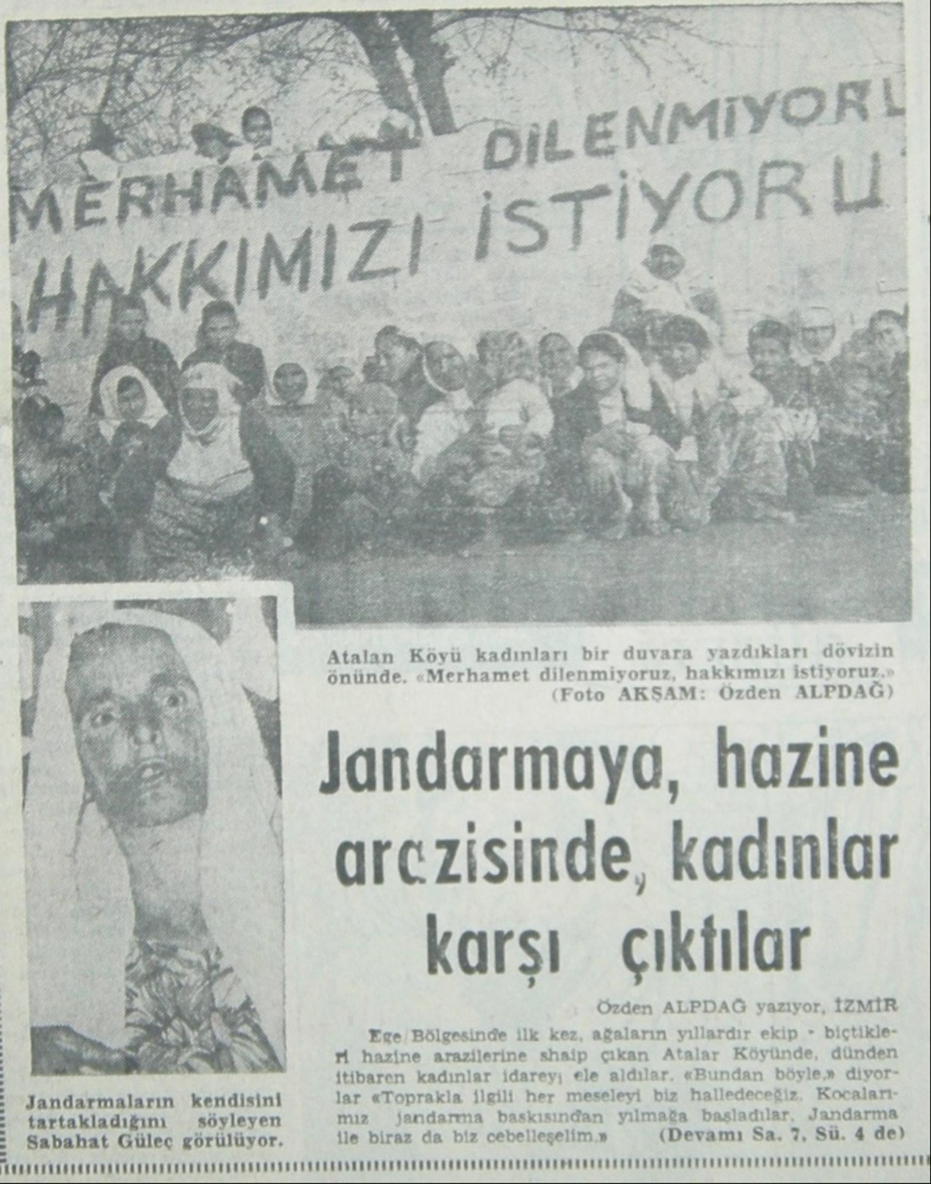 Alpdağ, Özden. "Jandarmaya, hazine arazisinde, kadınlar karşı çıktılar." Akşam, 25 Şubat 1969, ss. 1, 7.