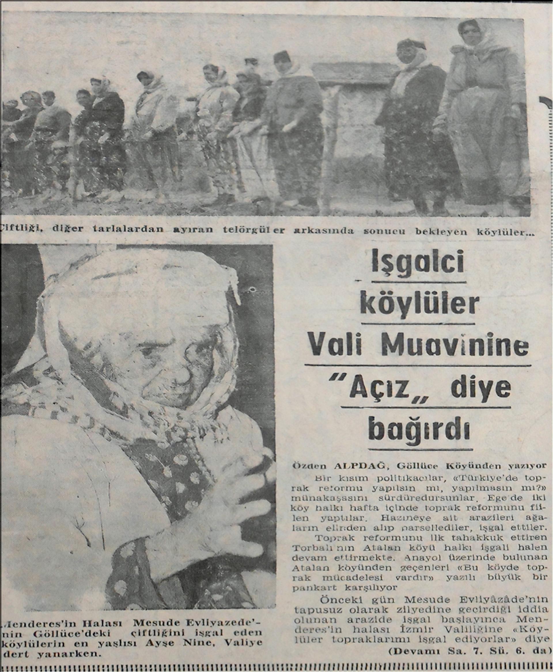Bu yazıda, 2018 yılında tamamladığım doktora tezim için yürüttüğüm arşiv ve saha araştırması bulgularından hareketle, İzmir Torbalı'ya bağlı Göllüce ve Atalan köylerinde toprak işgalleriyle sonuçlanan kırsal dönüşüm sürecinde topraksız köylü kadınlar, siyasetçiler ve solcu eylemciler arasındaki ilişkilere değineceğim. Yazıda ele aldığım bulgular, İstanbul ve Ankara'daki çeşitli arşivlerde taradığım belgeler, dergiler ile yerel ve ulusal gazetelerde yayımlanmış haberler, köşe yazıları, TÜSTAV Arşivi'nden taranan belgelerin yanı sıra her iki köydeki toprak mücadelecilerini desteklemiş gazeteci, avukat, Fikir Kulüpleri Federasyonu (FKF), Cumhuriyet Halk Partisi (CHP) Gençlik Örgütü ve Türkiye İşçi Partisi (TİP) üyeleri, dönemin İzmir Valisi ve aralarında kahveci ve çiftlik kâhyasının da yer aldığı, toprak mücadelelerine katılan köylüler ile yaptığım mülakatlara dayanıyor. Türkiye köylü hareketleri literatüründe ilk kez toplumsal cinsiyet, siyaset ve sınıf boyutlarını bir arada ele alan bu araştırma, 1960'lı yıllarda köylülük ve siyaset arası değişen ilişkileri gündeme getiriyor.[2]