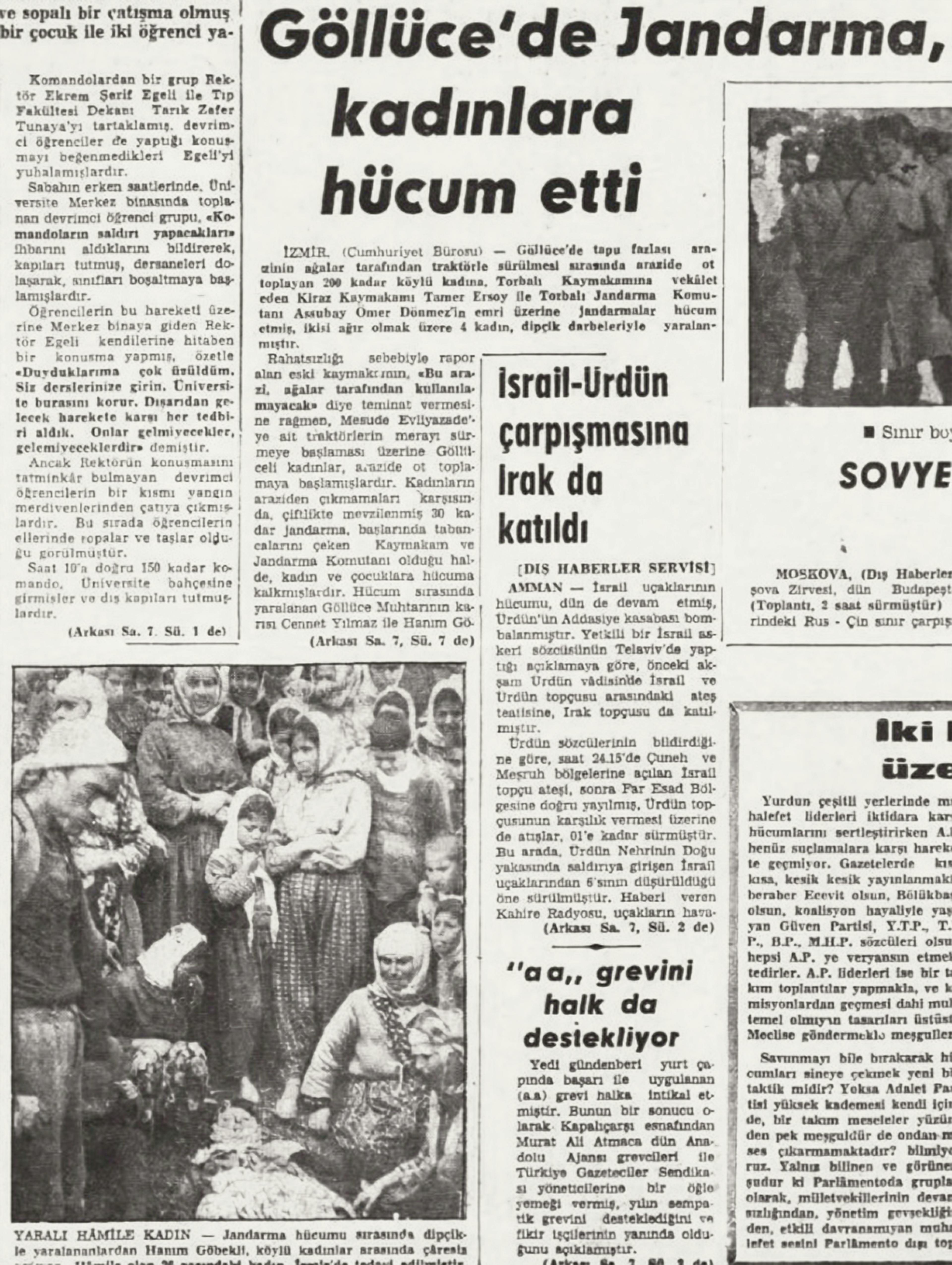 “Göllüce’de jandarma, kadınlara hücum etti”, Cumhuriyet, 18 Mart 1969, s. 1